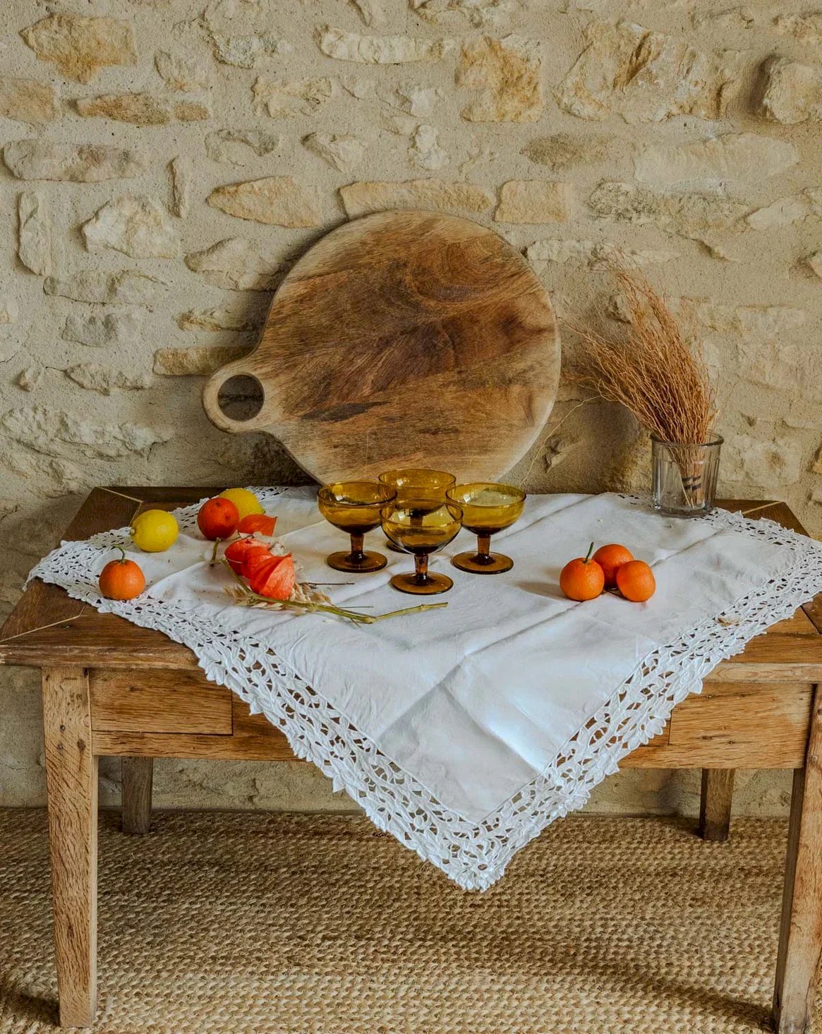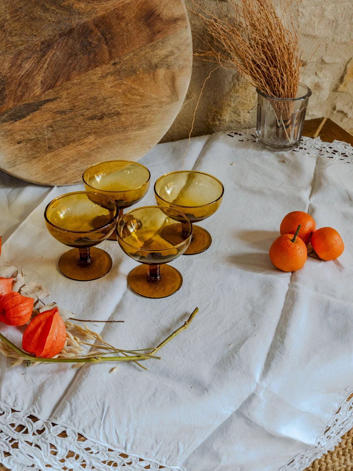Add this set of four Biot amber glass champagne coupes to your table setting: their delicate shape and slightly open bowl enhance both champagnes and sparkling cocktails. The amber glass diffuses a warm light that dresses the table in a retro and refined note, ideal for intimate aperitifs or friendly dinners. A light balance between elegance and bohemian spirit, perfect for creating a festive moment. Height: 9 cm Diameter: 10 cm Condition: Used: Item has been utilized. Item shows some superficial signs of wear... Used: Item has been utilized. Item shows some superficial signs of wear, fully operational and functioning correctly. It may be a demonstration model or an item returned to the store after a short period of use. any possible imperfections. Brand: Debongout Type: Vintage product Material: Glass Style: Country