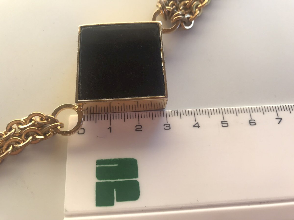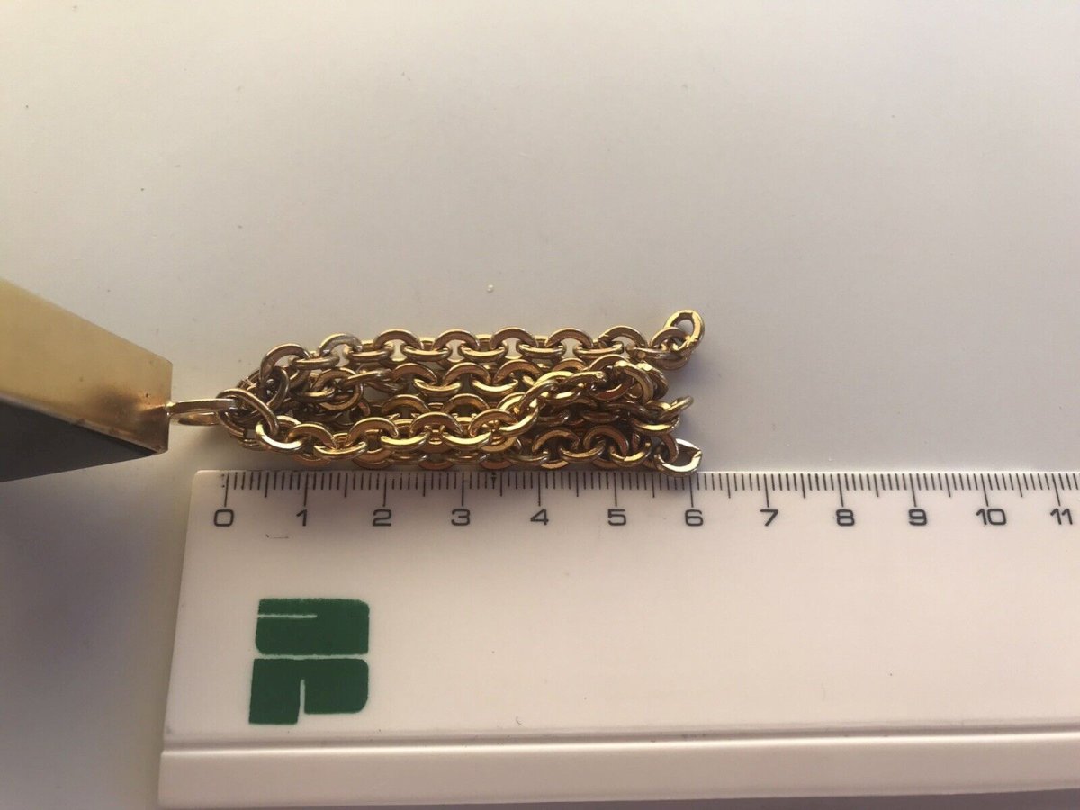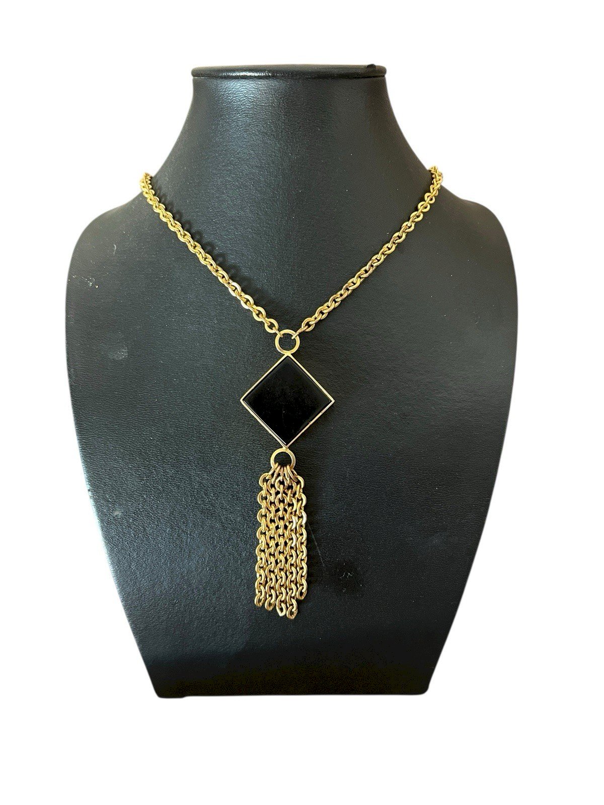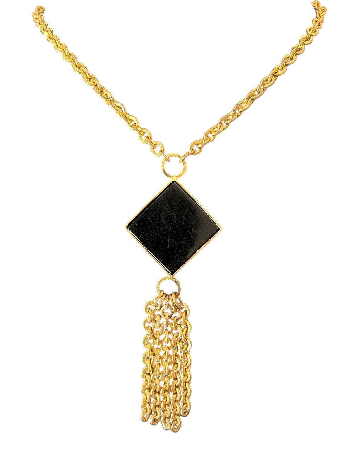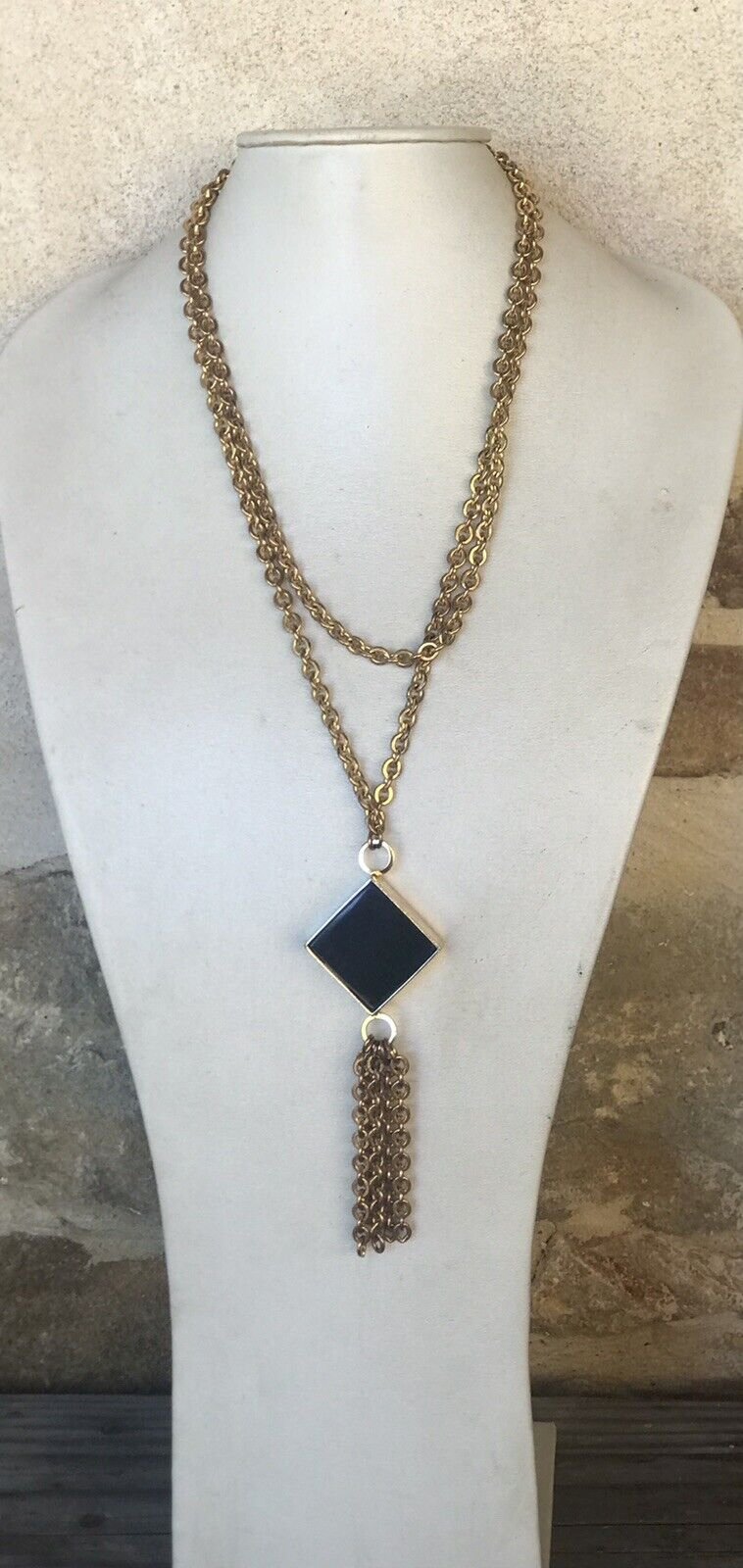 Extra long necklace, pendant, vintage, geometric, couture circa 1960/1970. Light signs of wear, but in good overall condition. The photos serve as description. Chain length approximately 106 cm. Chain, sturdy quality. Pendant width approximately 4 cm. Pendant height in black resin, approximately 1.1 cm. No clasp, it slips directly over the head. Weight approximately 107 g. Condition: Second-hand: Item has been worn. ...Second-hand: Item has been worn. Any imperfections. Color: Gold and Black. Dominant stone: N. Type: Pendant Necklace. Brand: French Couture. Dominant color: Gold. Material: N. Metal: Gold-plated Brass. Theme: Cocktail. Pendant shape: Diamond.