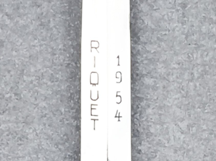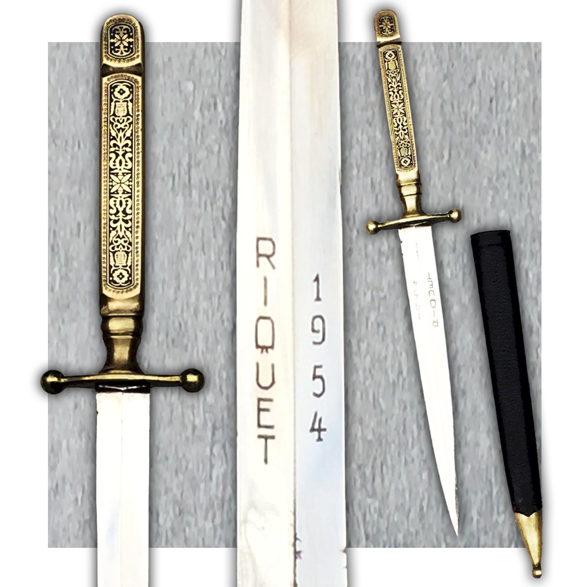 Superb and luxurious dagger in finely decorated steel. The handle is very beautiful, featuring various engravings in a modern style. The blade is in good condition, with a single central groove, diamond-shaped, inscribed: '' PIQUET 1954 ''. The sheath is made of brown leather with a bronze cap. You will find more information on the subject in the Gazette des Armes No. 1917, February 1990.