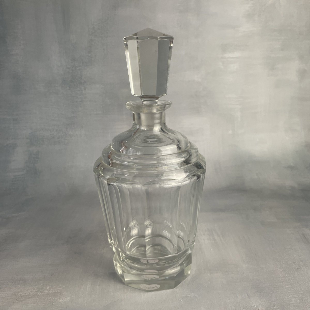 Faceted crystal decanter bottle with original stopper ~0.75kg Height ~ 21.5 cm with stopper Height ~ 15.8 cm without stopper Base diameter ~ 7 cm Total weight ~ 0.75 kg Excellent condition, chips on the stopper and neck, see photos. Remember to combine your purchases to reduce shipping costs!