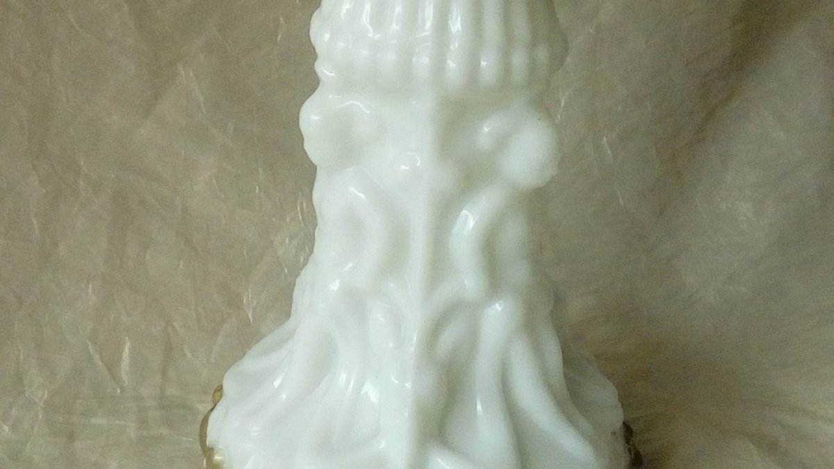 VERY BEAUTIFUL AND ANCIENT OPALINE FAIR VASE WITH COLLAR RELIEF DECORATION OF CHARACTERS PRESENCE OF POLYCHROME PAINT LATE 19TH CENTURY HEIGHT 23 cm WIDTH 11 cm DIAMETER 6 cm IN GOOD CONDITION SMALL FIRING DEFECTS ON THE COLLAR VISIBLE IN THE PHOTOS.