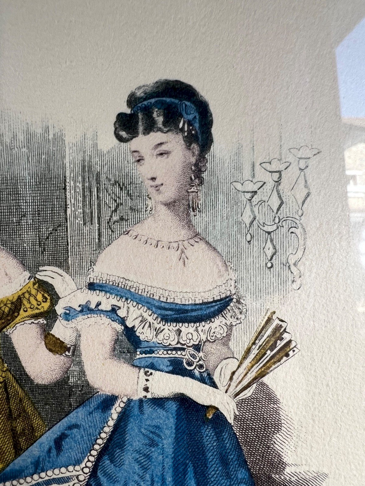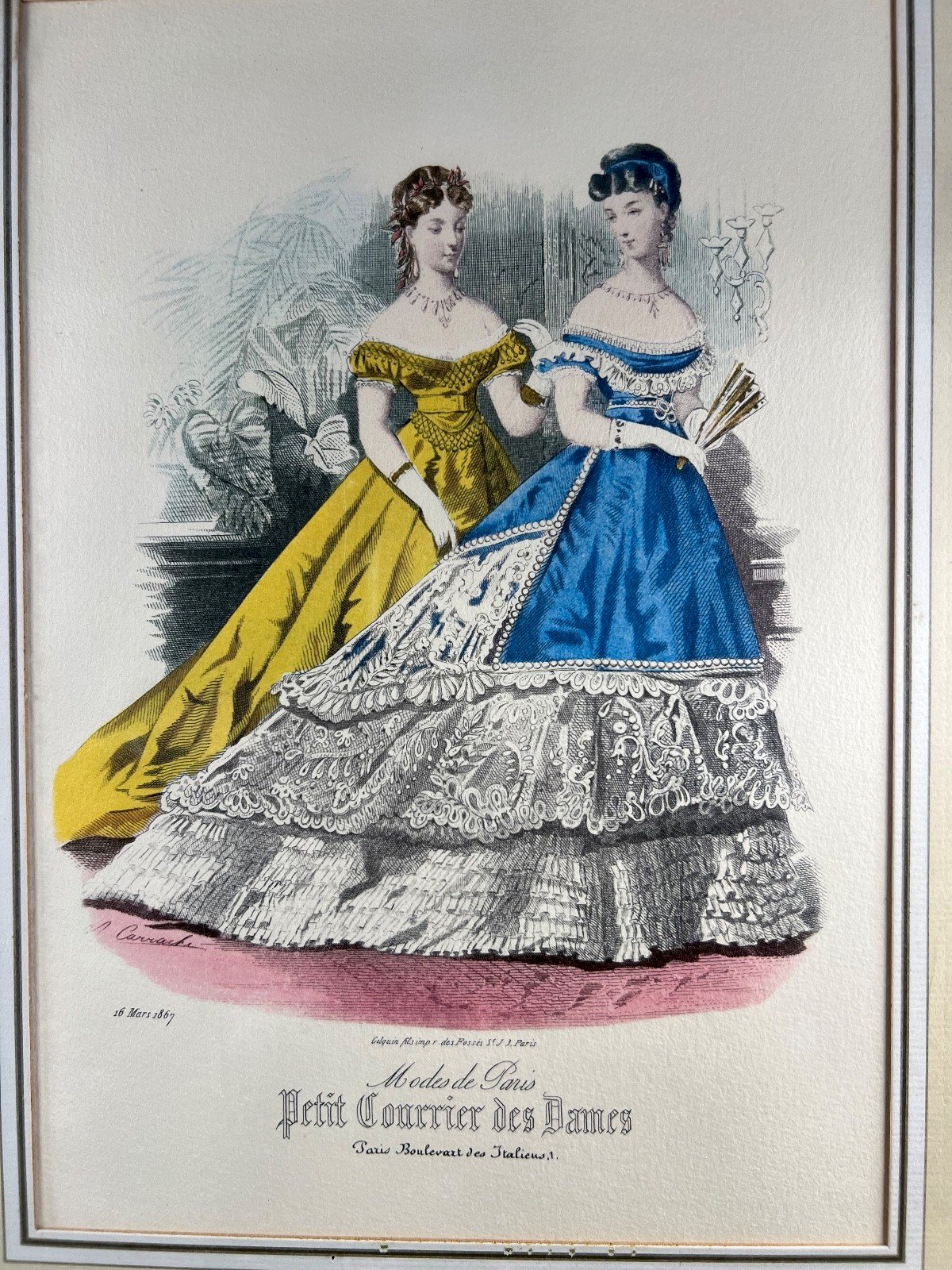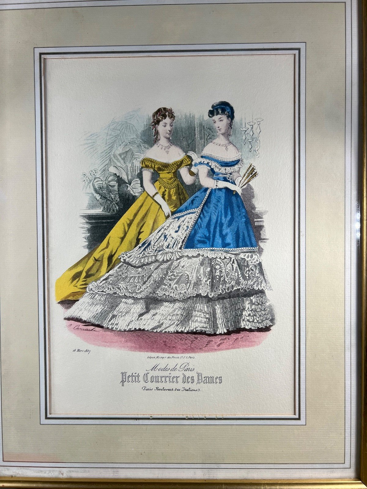 Elegant original fashion engraving dated March 16, 1867, taken from the famous Parisian newspaper "Le Petit Courrier des Dames," one of the most prestigious fashion publications of the Second Empire. This plate, entitled "Modes de Paris," features two ladies dressed in sumptuous ball gowns, finely hand-colored in bright shades of yellow and cobalt blue, enhanced with lace and delicate jewelry. Created after a drawing by A. Corracho, printed by Gilquin fils, imp. rue des Fossés Saint-Jacques, Paris, it beautifully illustrates the refinement and whimsy of Parisian fashion under Napoleon III. Engravings from this era were published weekly in fashion newspapers aimed at high society and served as a reference for dressmakers and milliners across Europe. Presented under antique glass in a period gilded frame, this print is both a historical document and a charming decorative object, perfect for a romantic interior, a boudoir, or an antique fashion boutique. Details: Title: Modes de Paris – Le Petit Courrier des Dames Date: March 16, 1867 Artist: A. Corracho (signed in the plate) Printer: Gilquin fils, Paris Publisher: Petit Courrier des Dames, Boulevard des Italiens, Paris Era: Second Empire (Napoleon III) Technique: Lithographed fashion engraving, hand-colored Framing: antique gilded frame with double matting Total dimensions: Height 39.5 cm – Width 31 cm (15.5” x 12.2”) Condition: excellent condition for its age, slight patina on the paper, well-preserved framing. Fashion engraving, Petit Courrier des Dames, Modes de Paris, 1867, Second Empire, Napoleon III, Fashion print, Antique engraving, 19th century, Paris fashion, Historical costume, Romantic art, Women's fashion, Colored engraving, French antique print Type: Engraving Country of origin: France Theme: Fashion