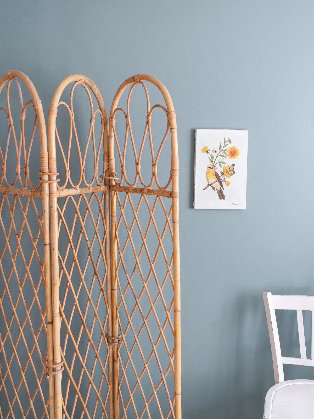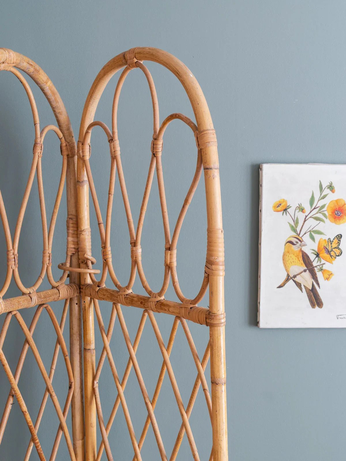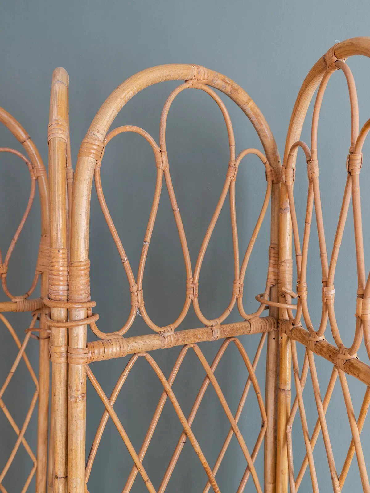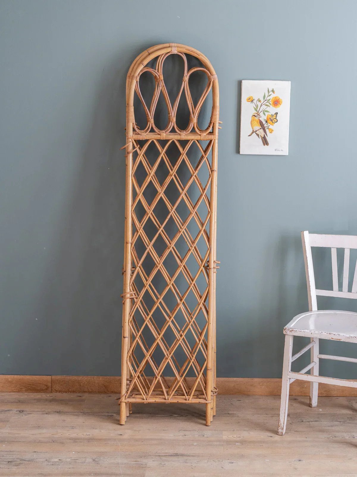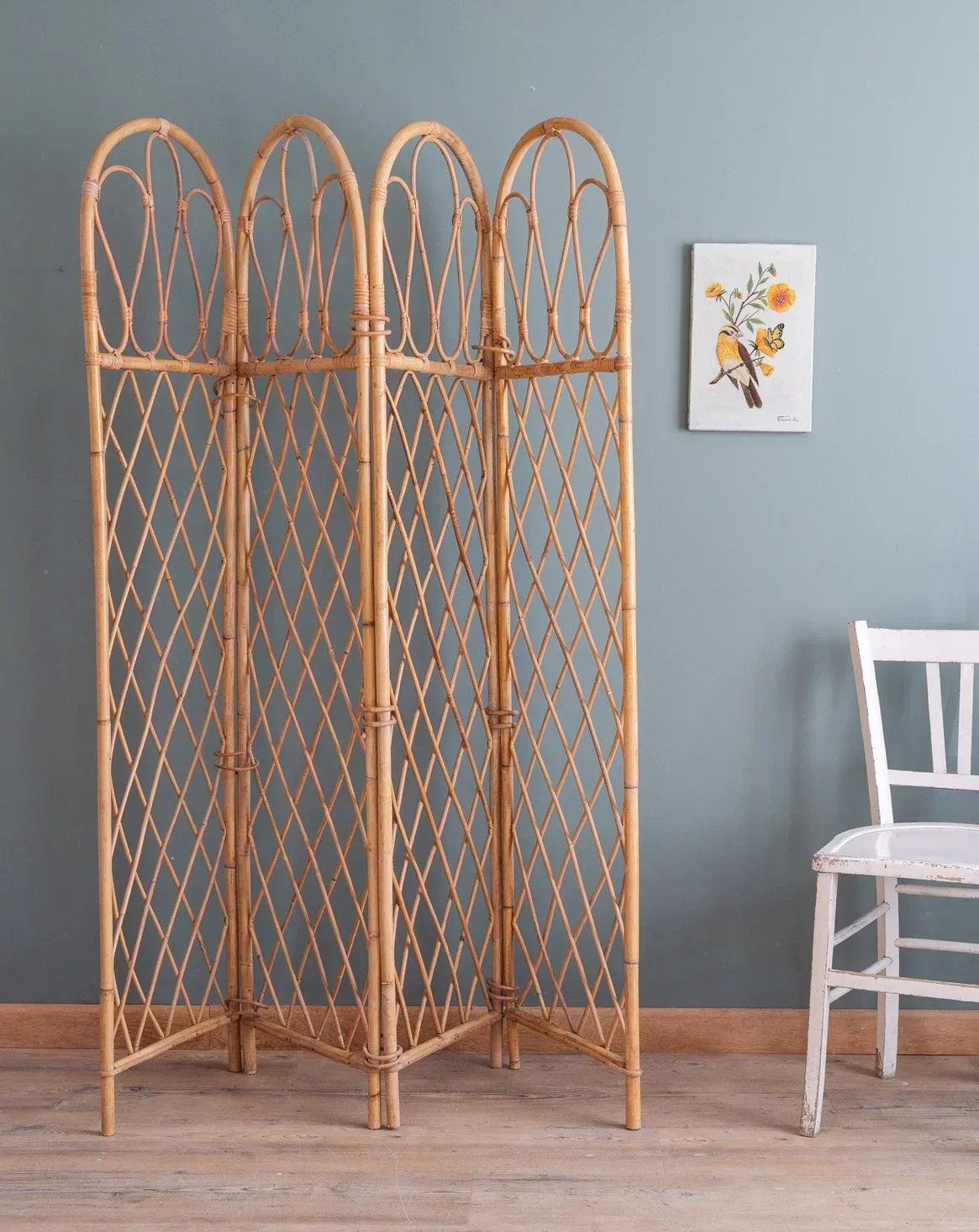 Adopt this vintage rattan screen, consisting of four panels with curved upper posts and a grid weave that captures light. Lightweight and modular, it unfolds to create an intimate separation or a reading nook while easily folding for storage, offering proportions suitable for a bedroom, living room, or entryway. Its natural look adds a bohemian-chic and warm touch, perfect for structuring the space without weighing it down. Length (unfolded): 160 cm Width (folded): 3 cm Height: 167 cm Condition: Used item. Item shows some signs of superficial wear, fully operational and functioning properly. It may be a demonstration model or an item returned to the store after a short period of use, with any possible imperfections. Brand: Debongout Type: Vintage product Material: Rattan Style: Country