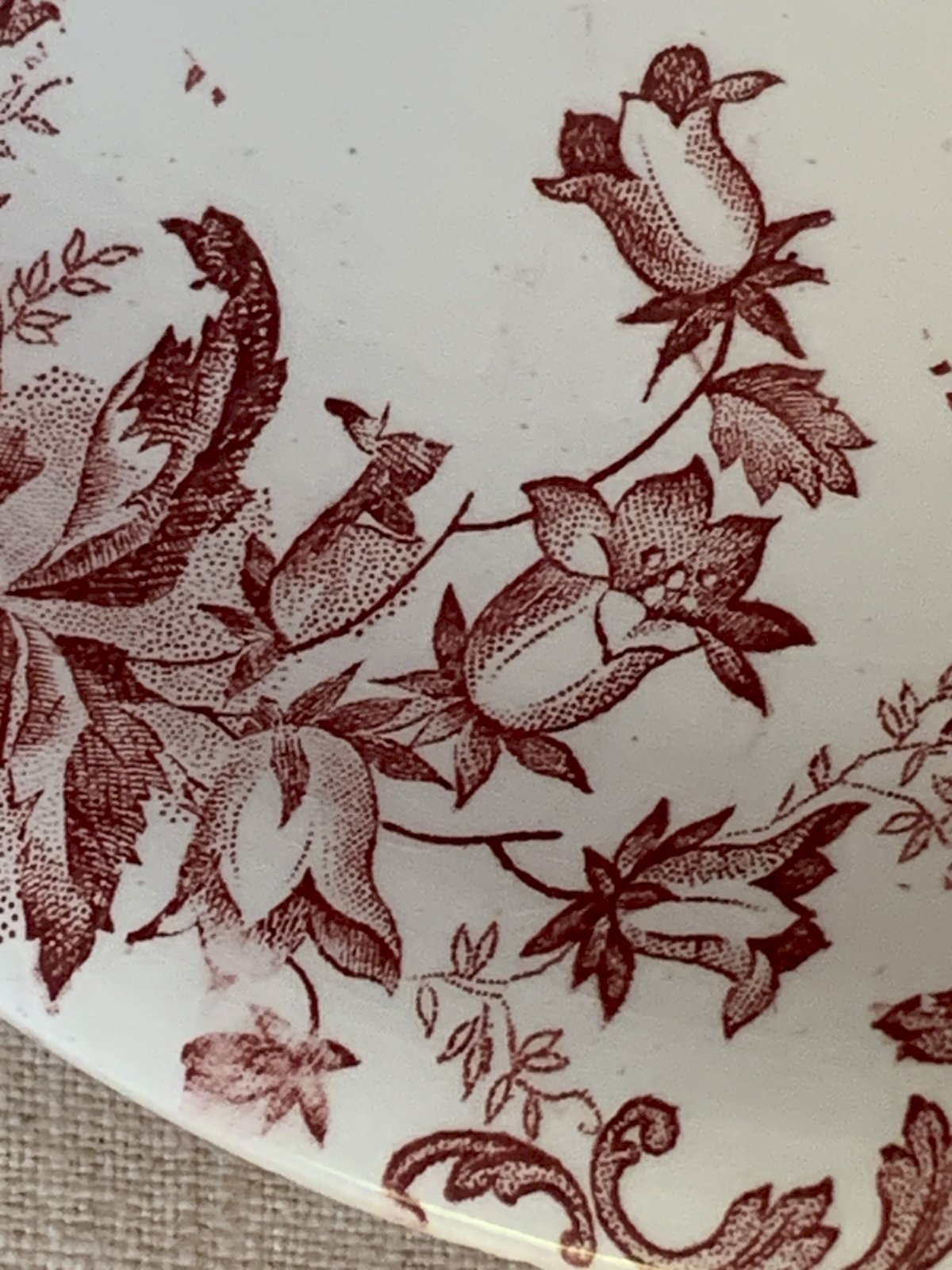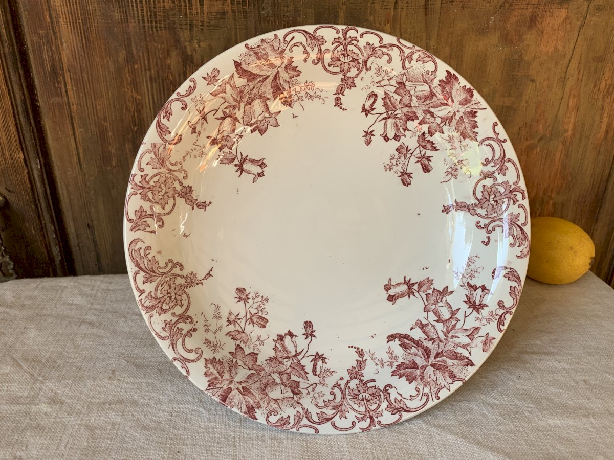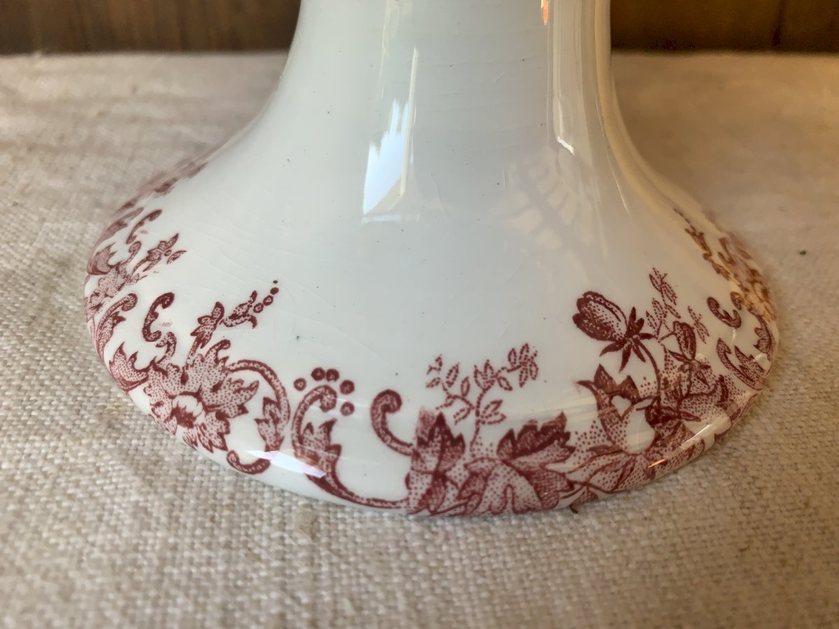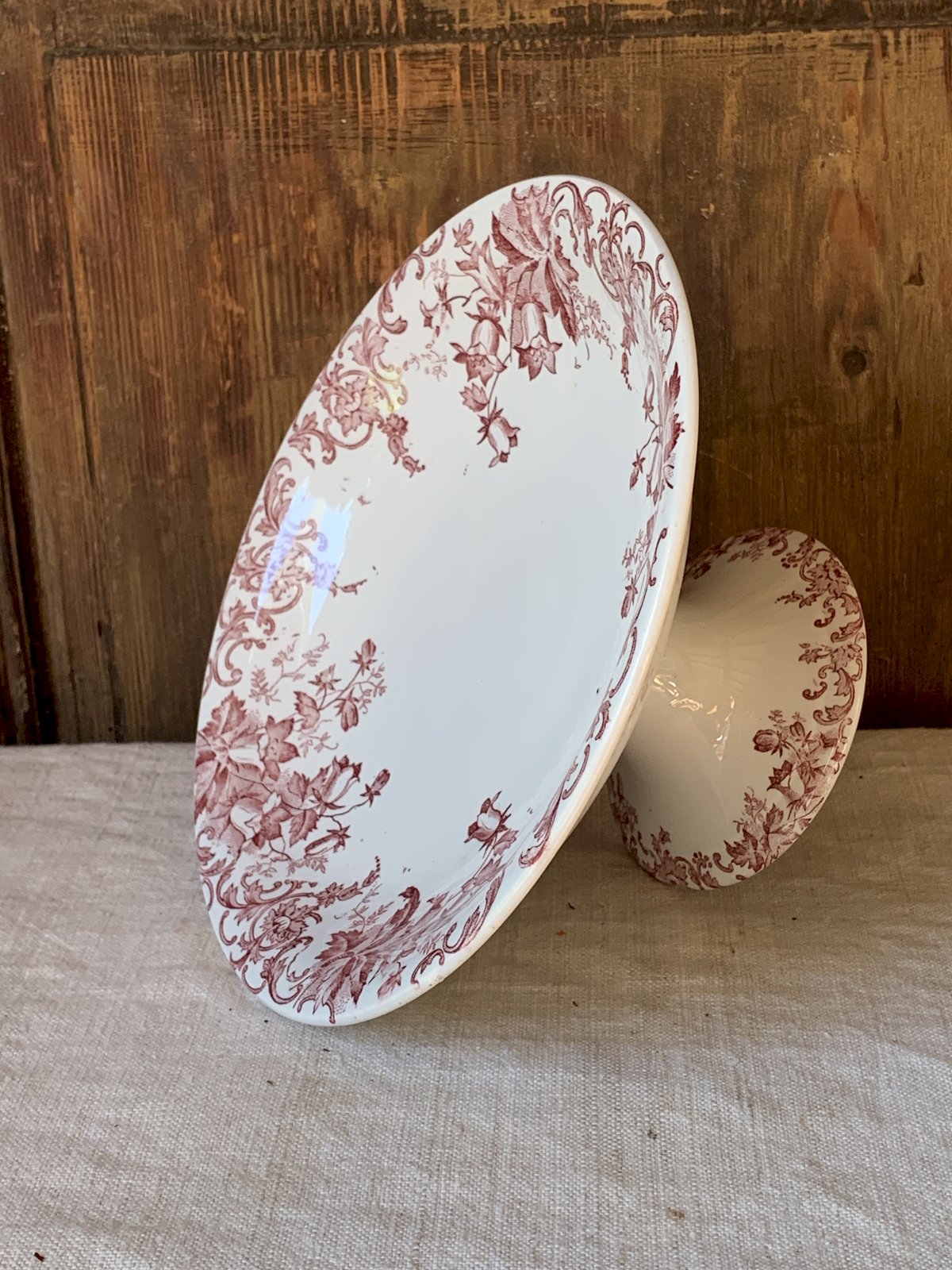 In very good general condition, an antique earthenware compote, floral transfer in oxblood color, stamped St Amand Hamage Nord model Campanul.
