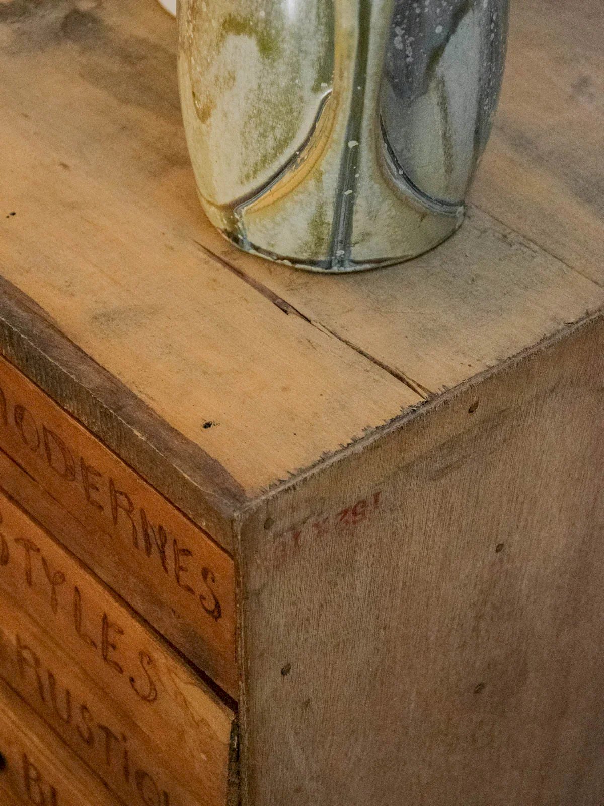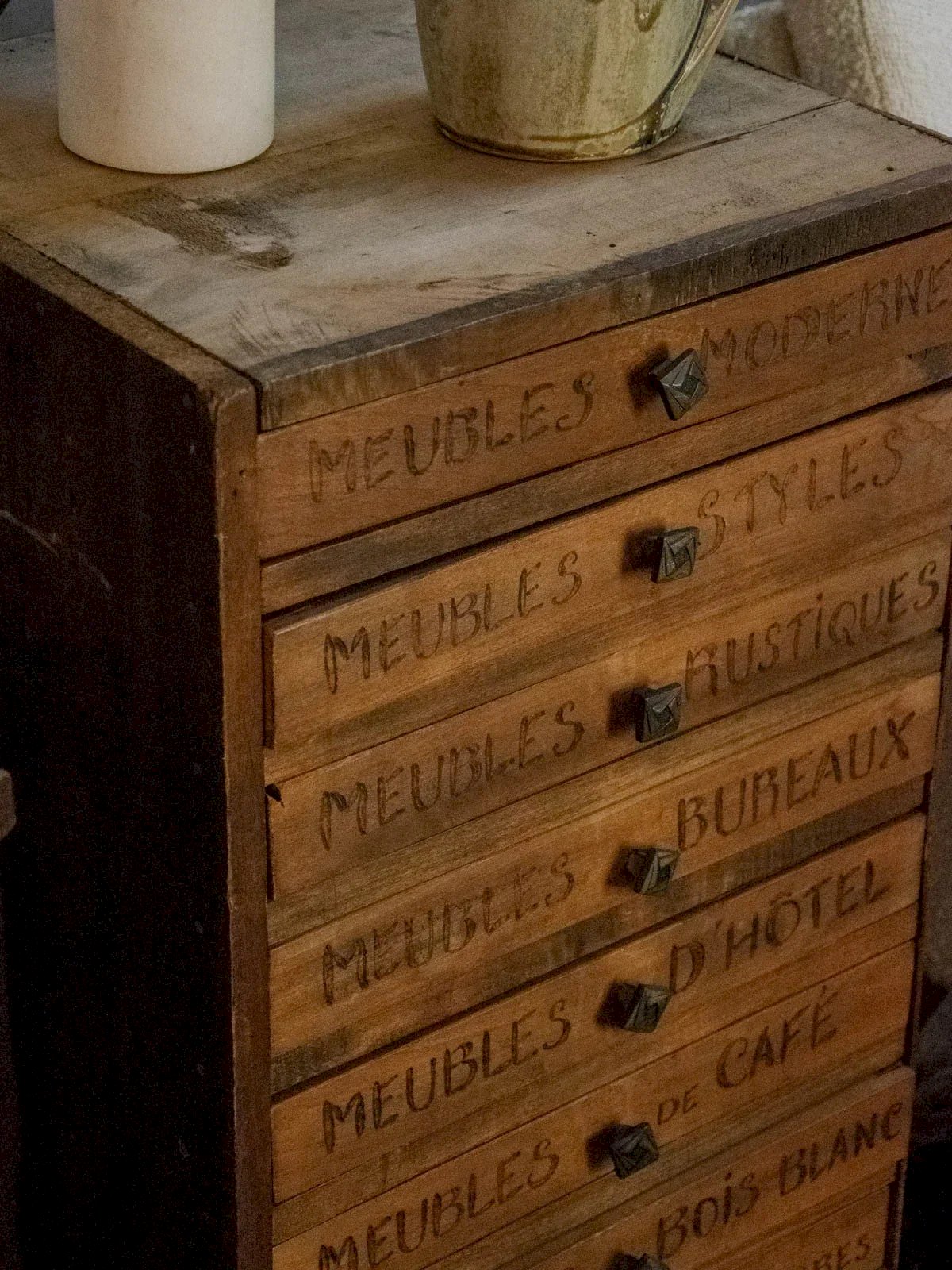 Adopt this handcrafted light wood piece of furniture, featuring eleven drawers with metal knobs that elegantly organize small supplies and everyday items; handmade, it reveals a sober style with industrial accents and a perfect presence for an entryway, workshop, or workspace thanks to its compact and well-proportioned design, combining the warmth of wood and functionality. Some signs of usage add to its authenticity. Length: 39 cm Width: 36 cm Height: 81 cm Drawer height: 4.5 cm Condition: Used: Item that has been used. Item showing some signs of superficial wear... Used: Item that has been used. Item showing some signs of superficial wear, fully operational and functioning properly. It may be a demonstration model or an item returned to the store after a short period of use. potential imperfections. Brand: Debongout Type: Vintage product Material: Wood, Metal Style: Country Custom: Professional furniture