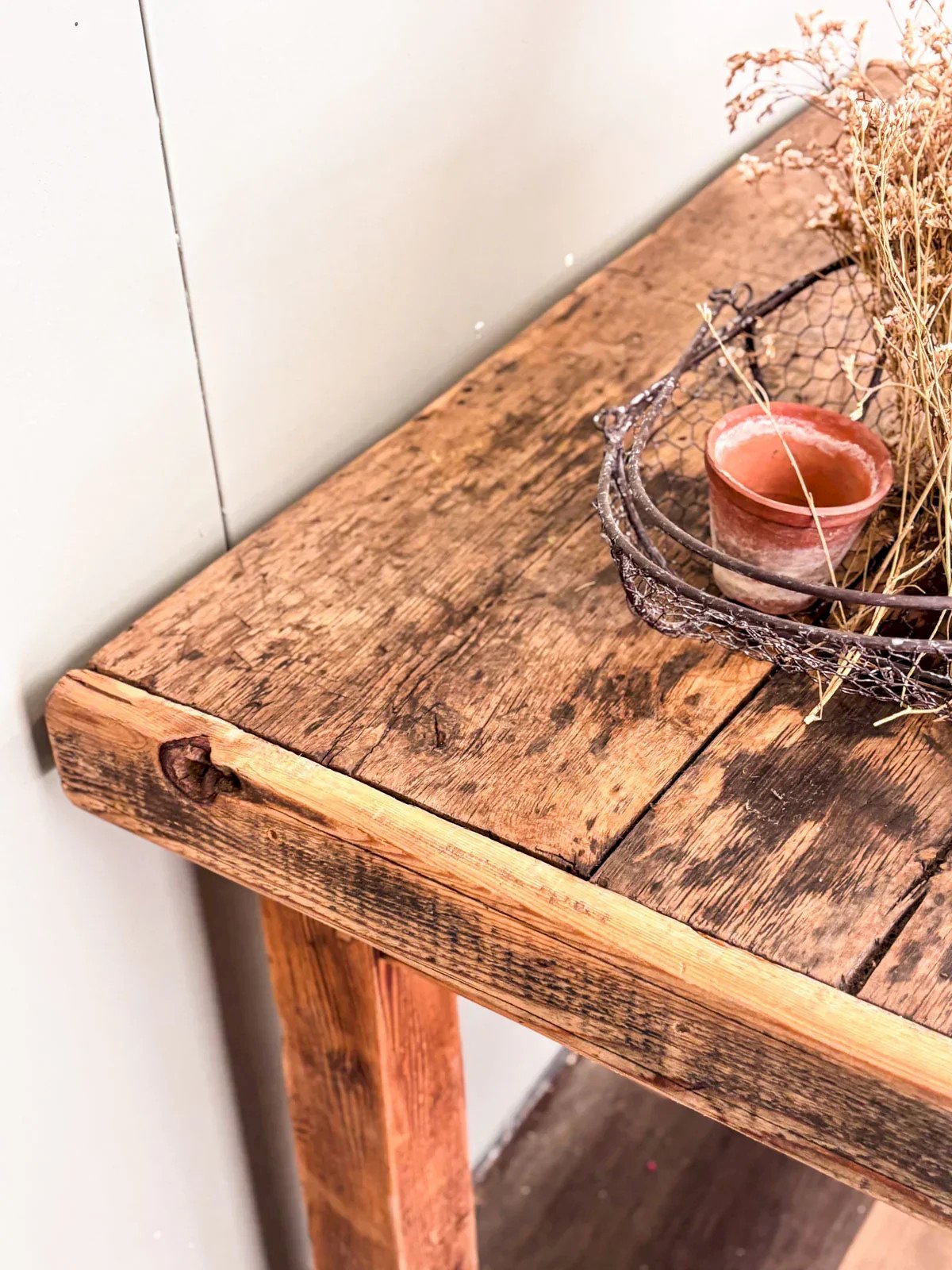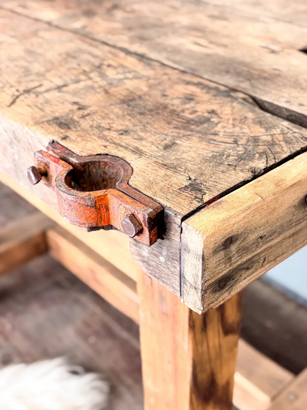 Discover our oak workbench, a centerpiece that combines sturdiness and elegance. Designed to withstand the test of time, its solid oak top provides an ideal surface for all your DIY or creative projects. With its clean lines and natural appearance, this workbench will fit perfectly into your workspace. Add an authentic touch to your workshop while enjoying a functional and aesthetic piece of furniture. Length: 101 cm Width: 74.5 cm Height: 79 cm Thickness of the top: 8 cm Condition: Used: Item has been used. Item shows some superficial signs of wear, fully operational and functioning correctly. It may be a demonstration model or an item returned to the store after a short period of use, as well as any potential imperfections. Brand: Debongout Type: Thrifted Product Material: Oak Style: Country Custom: Professional furniture