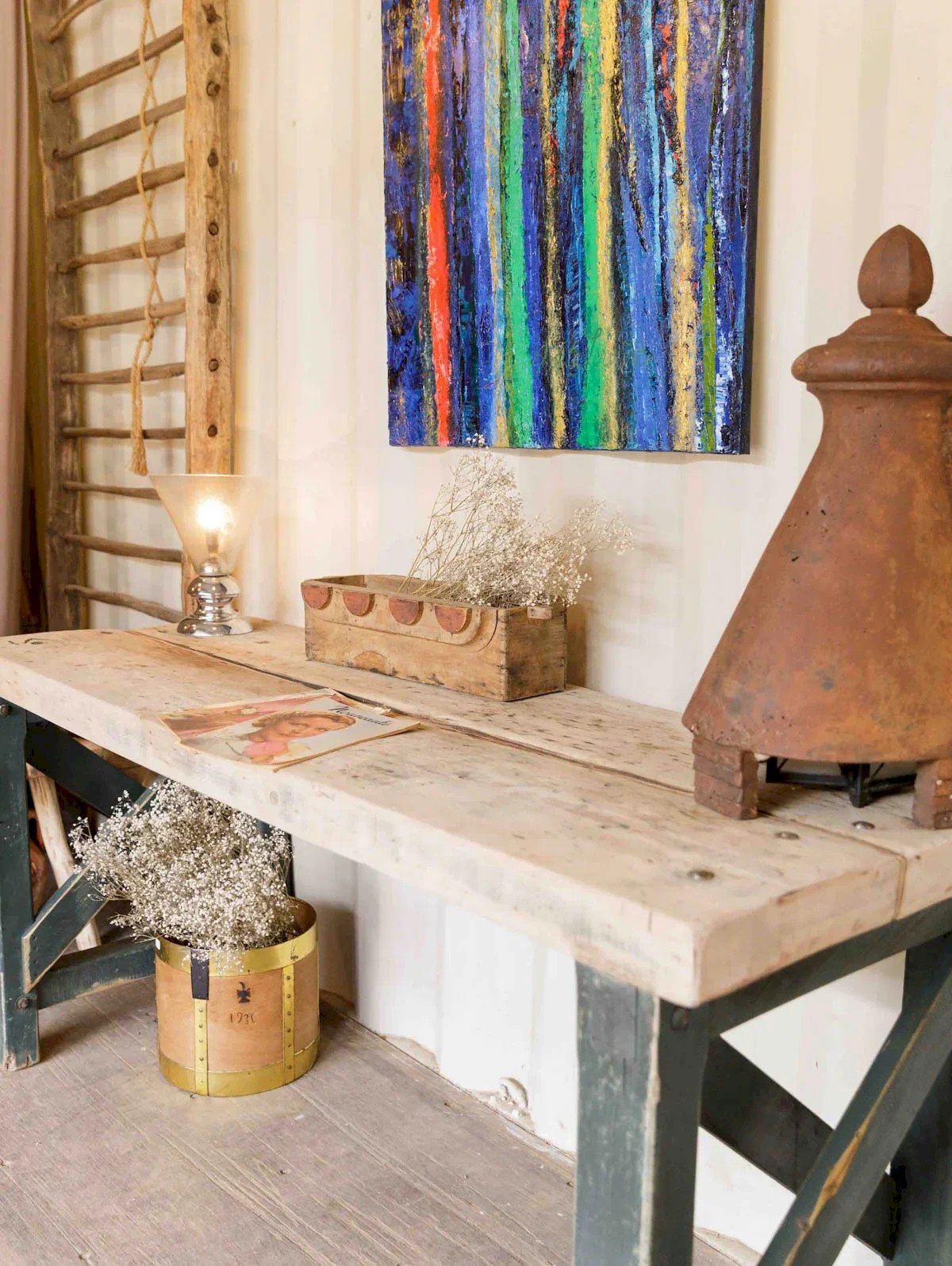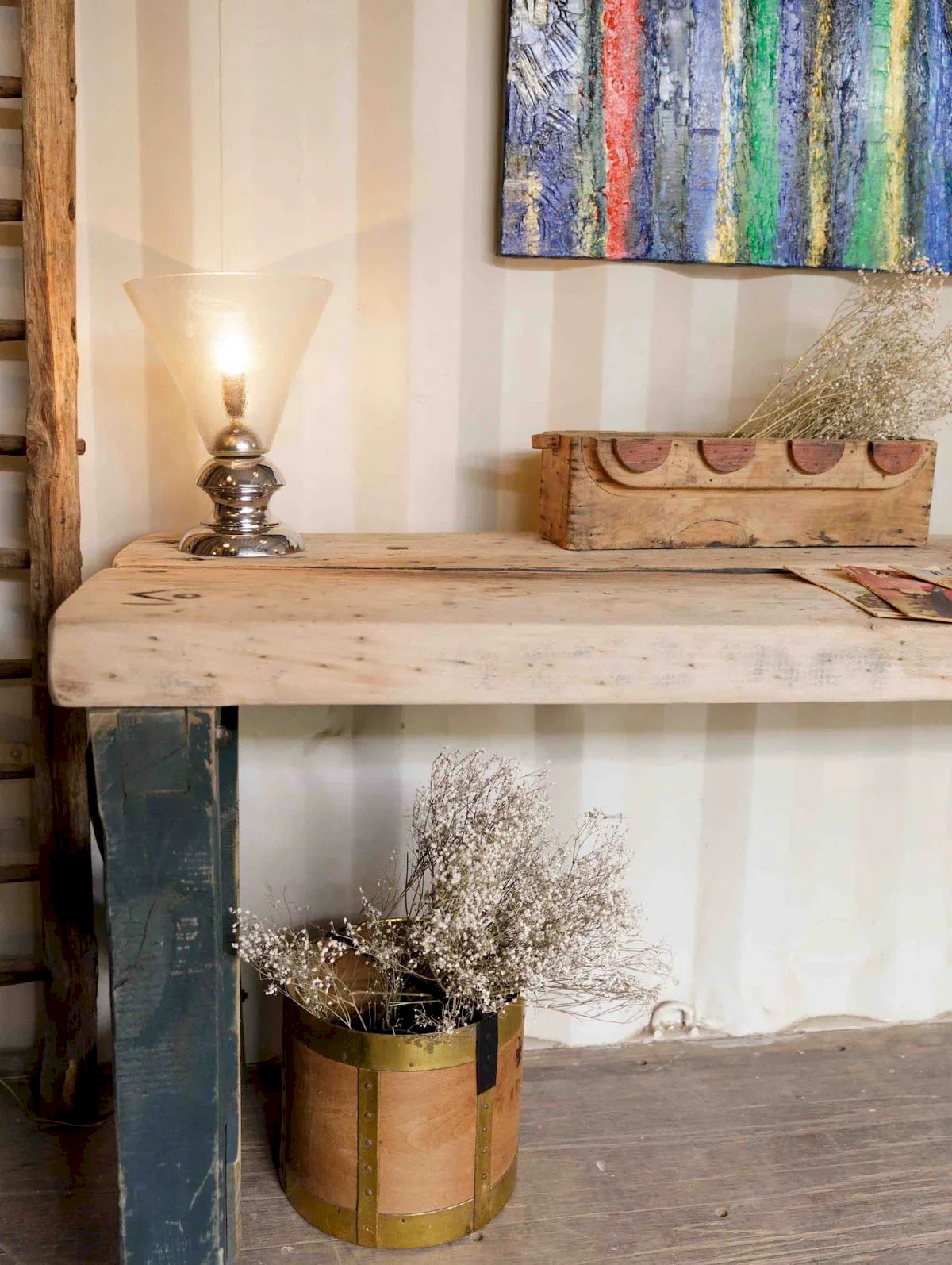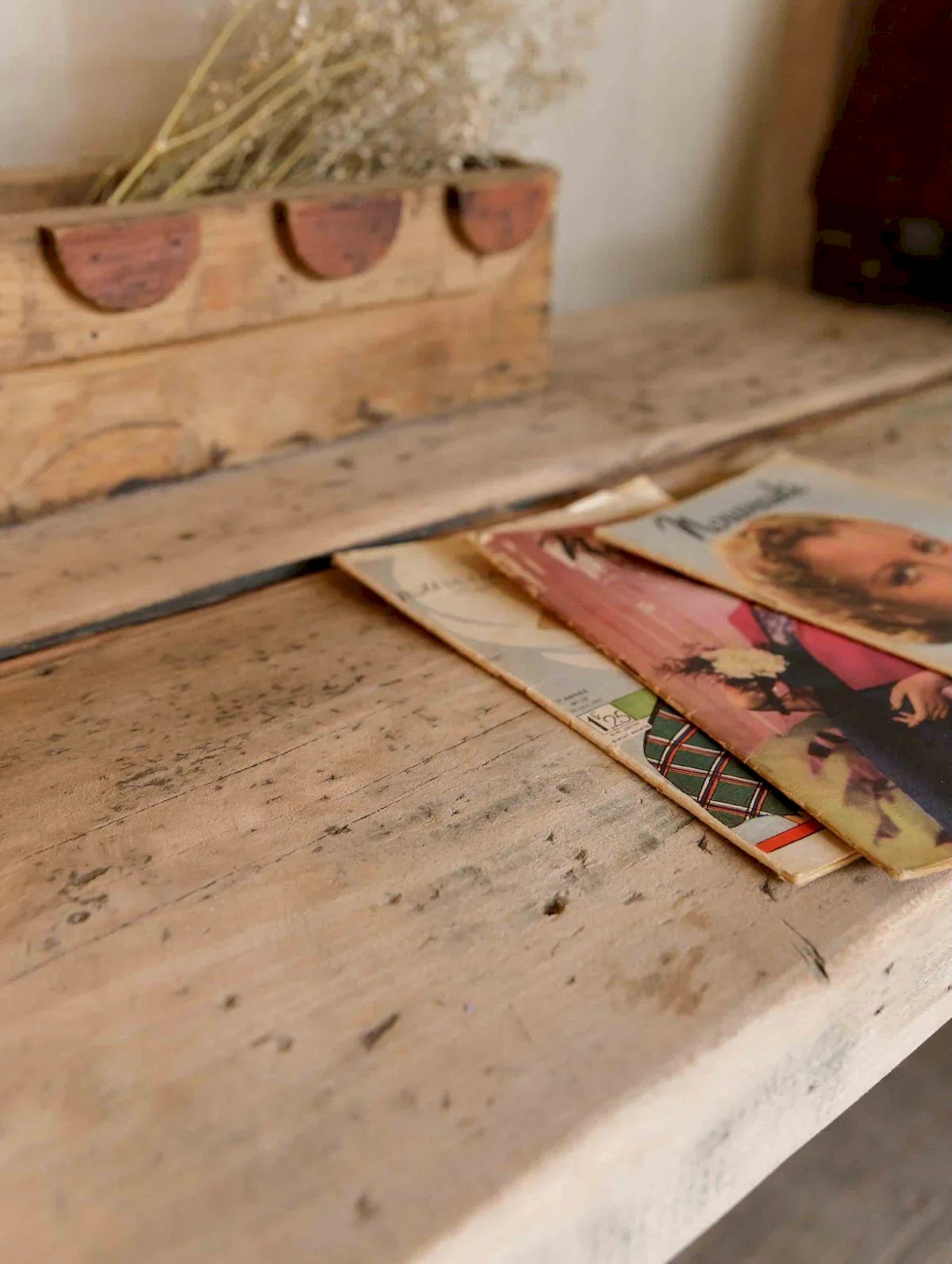 Discover our old workbench, artfully transformed into an elegant console table. Its raw top, subtly patinated, adds a touch of authenticity and warmth to your interior. The green legs harmonize beautifully with the wood, creating a perfect balance between tradition and modernity. A unique piece of furniture that combines vintage charm and functionality to brighten your living space. Length: 178 cm Width: 63 cm Height: 81 cm Height under the top: 73 cm Condition: Used: Item that has been used. Item showing some signs of superficial wear... Used: Item that has been used. Item showing some signs of superficial wear, fully operational and functioning properly. It may be a demonstration model or an item returned to the store after a short period of use with possible imperfections. Brand: Debongout Type: Thrifted Product Material: Wood Style: Country Customized: Professional furniture