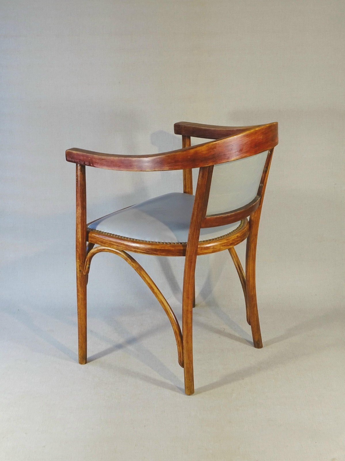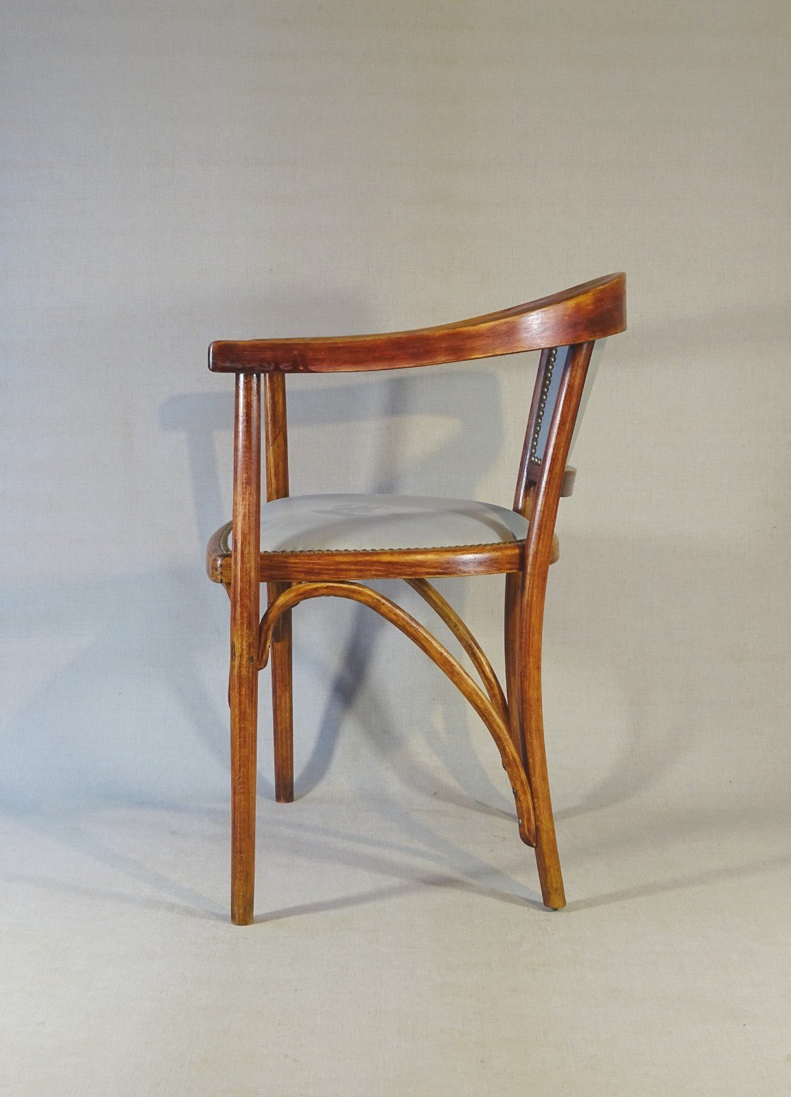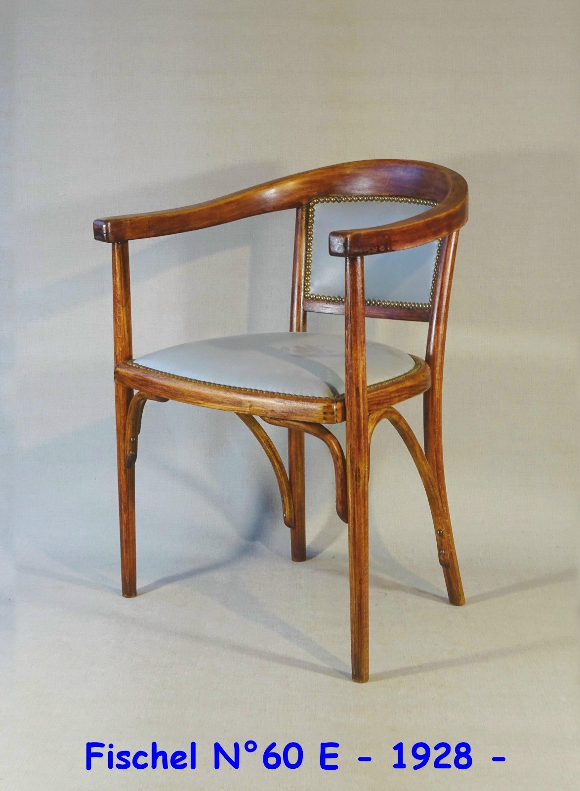 Fischel armchair, typical of the interwar period, can be found in the 1925 catalog under No. E/60 and is also featured in catalogs from 1932/38. It is here with the option of linking its legs in a "ogive" style that extends very low along the back legs. Dimensions: seat height: 48 cm, seat width: 49 cm, depth: 47 cm, total width: 55 cm - total height: 79 cm. This chair, which has seen little use, is covered in beautiful mouse-grey leather on the seat and back, both front and back. Stamped and labeled Fischel under the seat. Beautiful stable structure, in perfect condition. More photos and information available upon request. Delivery in France and Europe, pickup in Alsace. Color: Grey Number of pieces: 1 Type: Armchair Brand: Fischel Period: 20th Century Design Subtype: Office Country of origin: Slovakia Material: Beech Style: 1930s