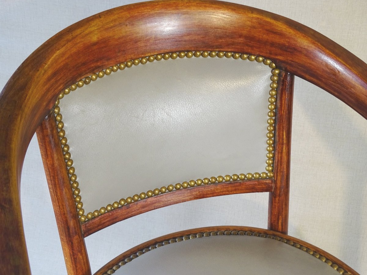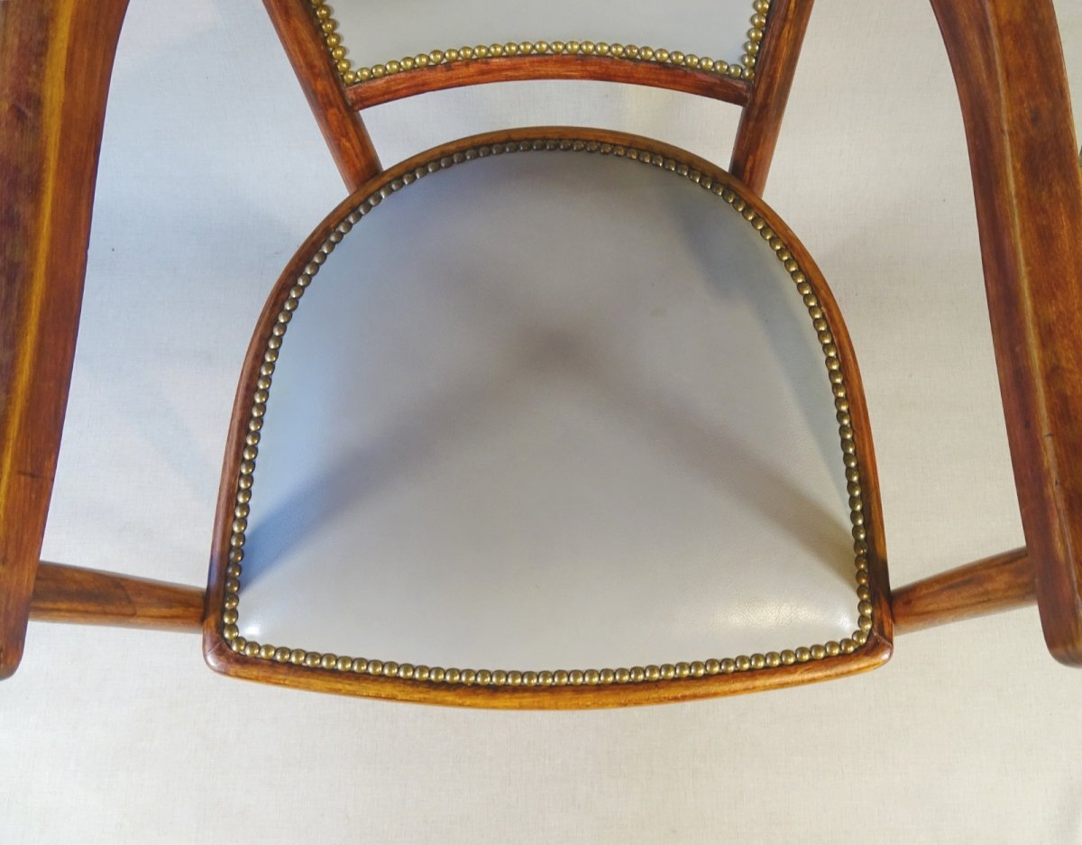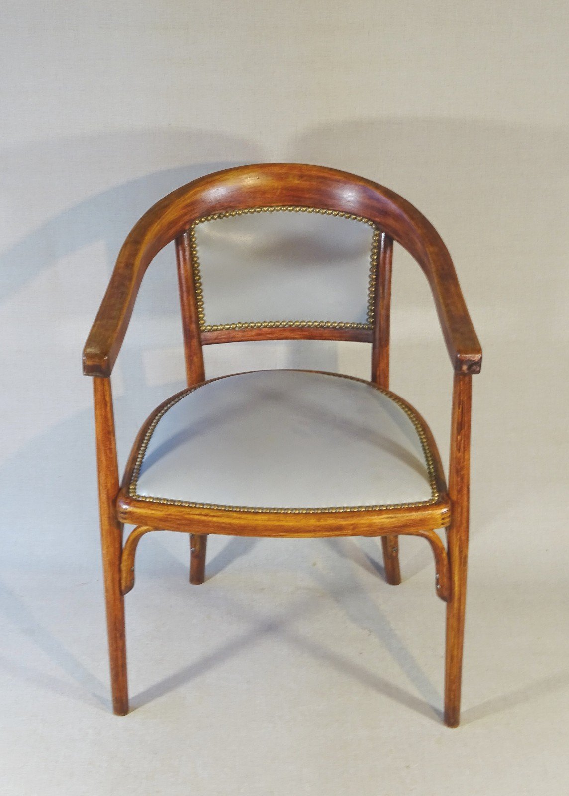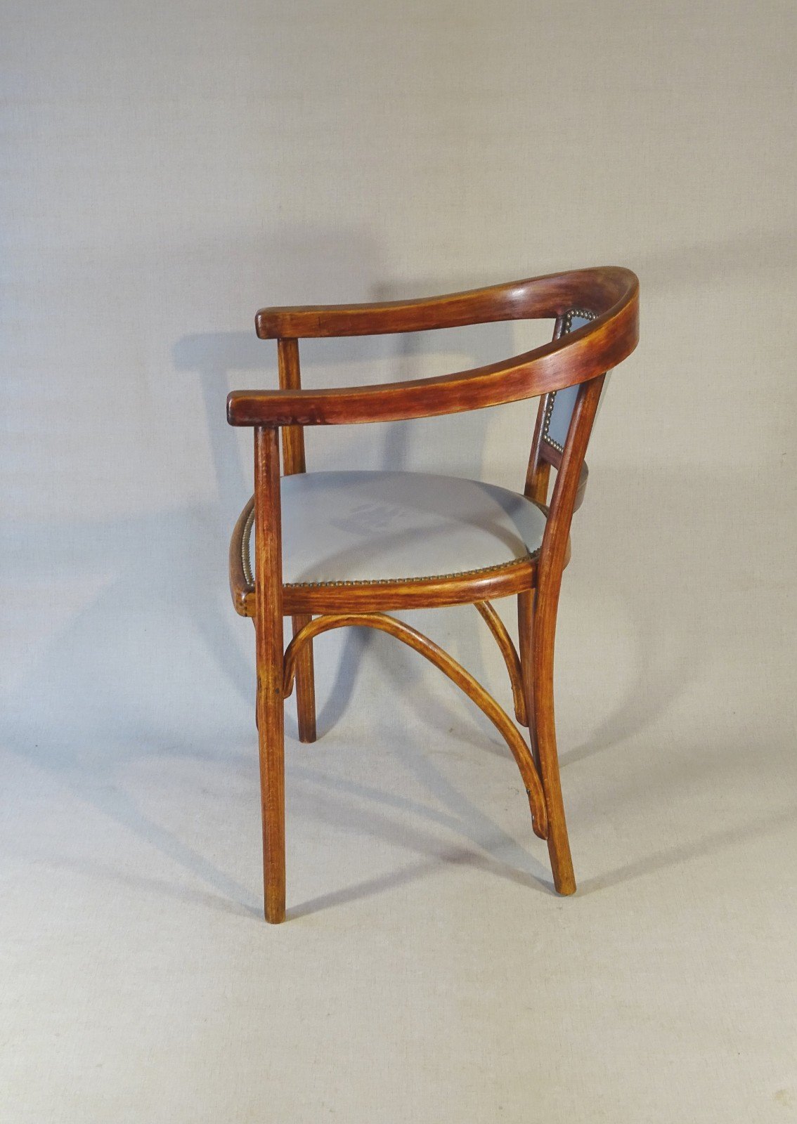 Fischel armchair, typical of the interwar period, can be found in the 1925 catalog under No. E/60 and is also featured in catalogs from 1932/38. It is here with the option of linking its legs in a "ogive" style that extends very low along the back legs. Dimensions: seat height: 48 cm, seat width: 49 cm, depth: 47 cm, total width: 55 cm - total height: 79 cm. This chair, which has seen little use, is covered in beautiful mouse-grey leather on the seat and back, both front and back. Stamped and labeled Fischel under the seat. Beautiful stable structure, in perfect condition. More photos and information available upon request. Delivery in France and Europe, pickup in Alsace. Color: Grey Number of pieces: 1 Type: Armchair Brand: Fischel Period: 20th Century Design Subtype: Office Country of origin: Slovakia Material: Beech Style: 1930s