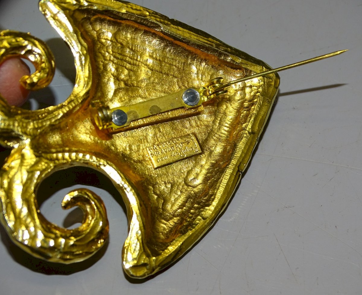 Beautiful vintage fish-shaped brooch in gold-tone metal (probably gilded brass) - marked on the back Patrice Giraudeau For the Julies (photos) - pure treasure find, taken from an attic, in good condition - Ref. 1V250703/212 6.6 x 5.8 cm - Weight 47 g For contact, my email address: SHIPPING POSSIBLE VIA MONDIAL RELAY or COLISSIMO upon request VERY GOOD PACKAGING GUARANTEED THANK YOU for LOOKING AT ALL the PHOTOS as THEY ARE AN INTEGRAL PART of the DESCRIPTION and ALLOW YOU TO SEE the ITEM BEST with its POSSIBLE SMALL IMPERFECTIONS - Condition: Pre-owned: Item has been worn. ...Pre-owned: Item has been worn. any possible imperfections.