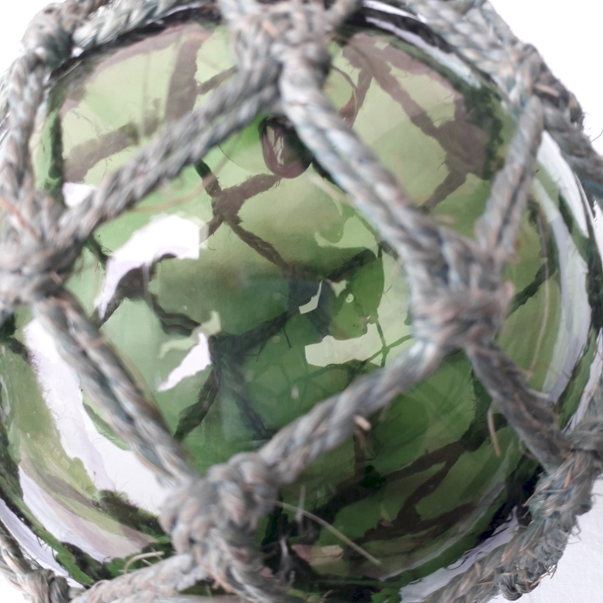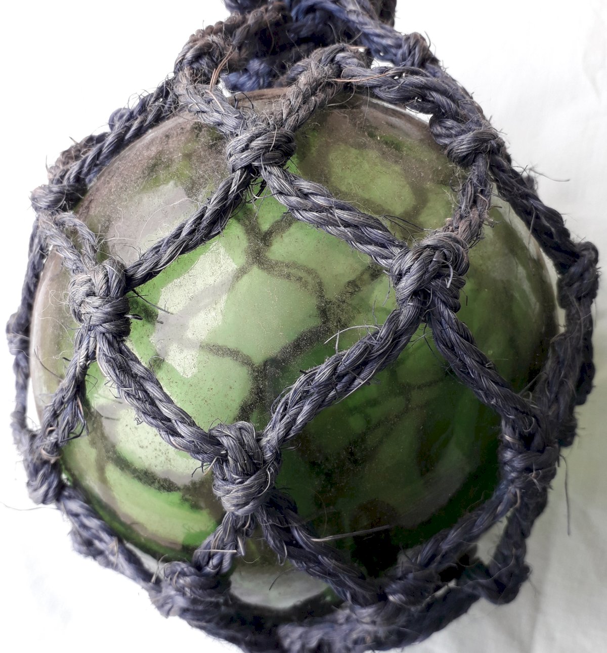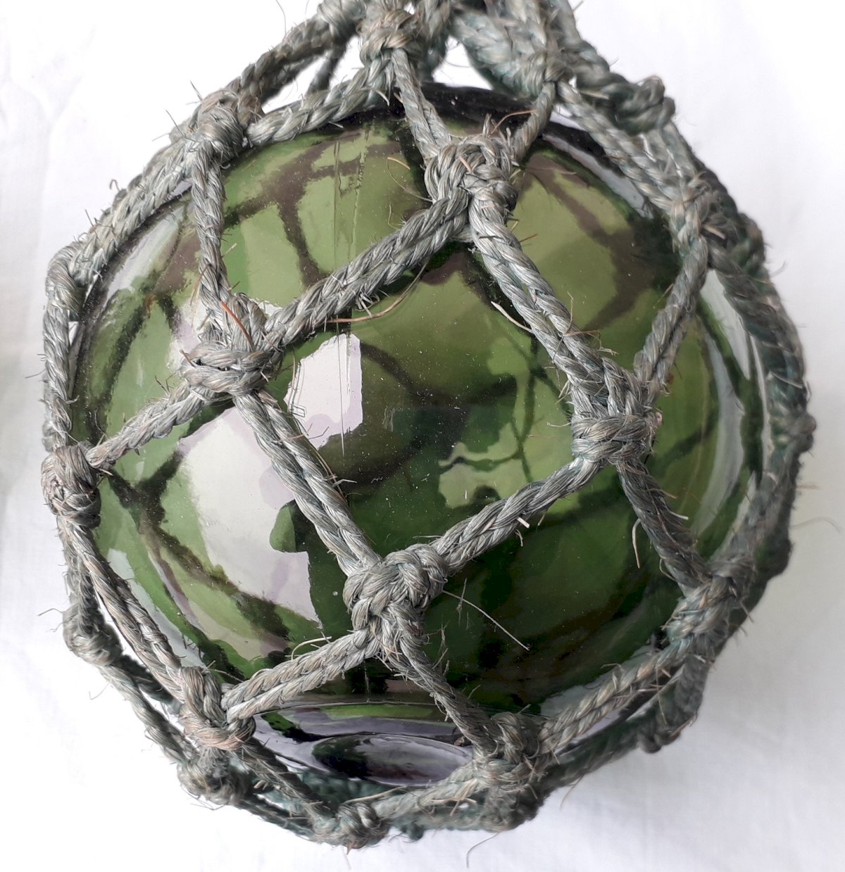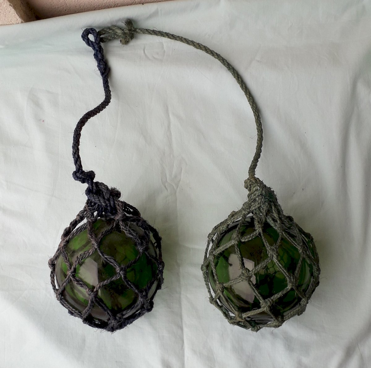 Two fishing glass floats to hang for marine decor. One of the strings is blue, the other green. Good overall condition, no breakage. Dimensions: height 63 cm and 50 cm, diameter 13 cm. Weight of both 1 kg. Feel free to contact me for any further information and/or to make your offers. See my other items for sale.
