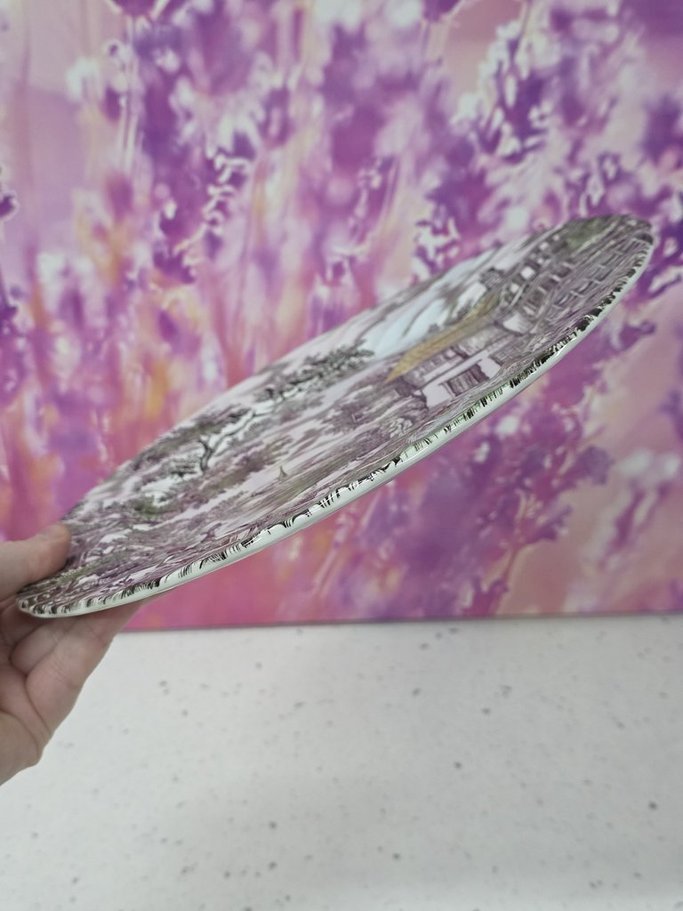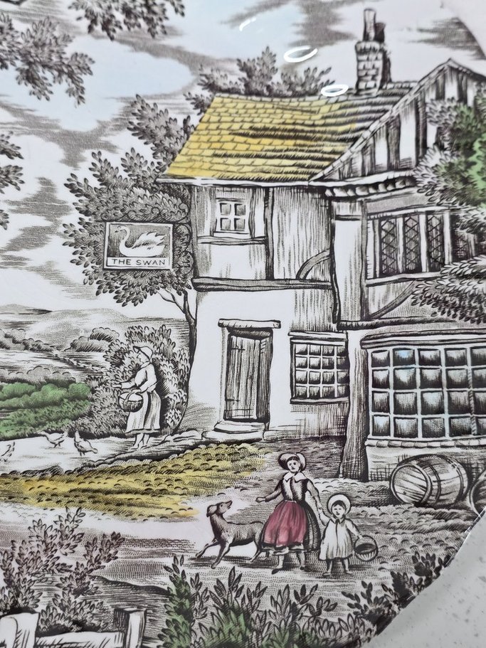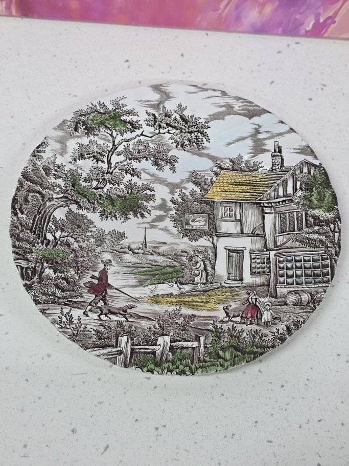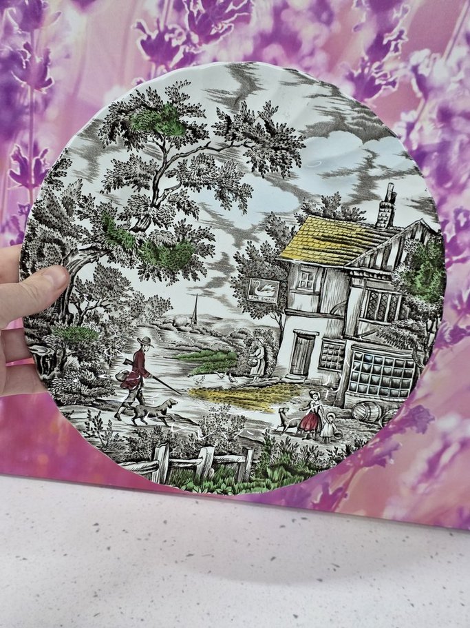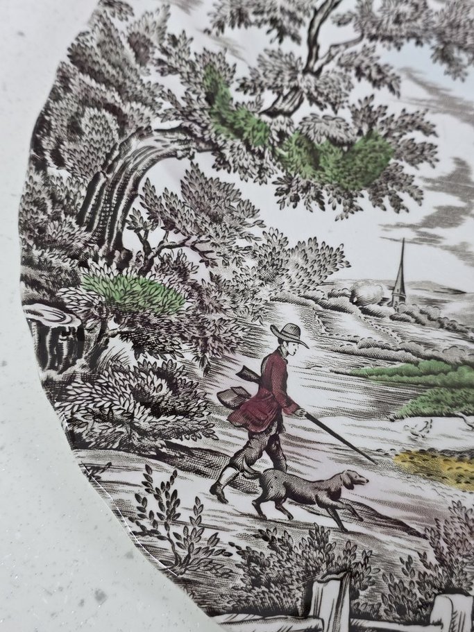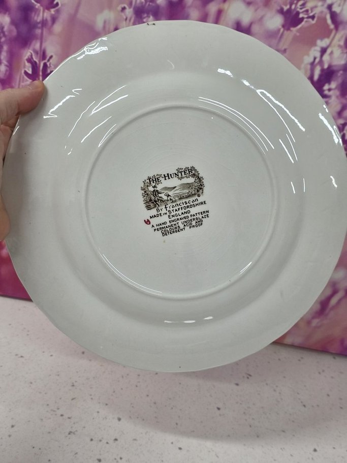 flat plate, ironstone, stamped: the hunter by franciscan made in staffordshire england a hand engraved pattern permanent underglaze colours acid and detergent proof, in perfect condition, diameter 25.5cm