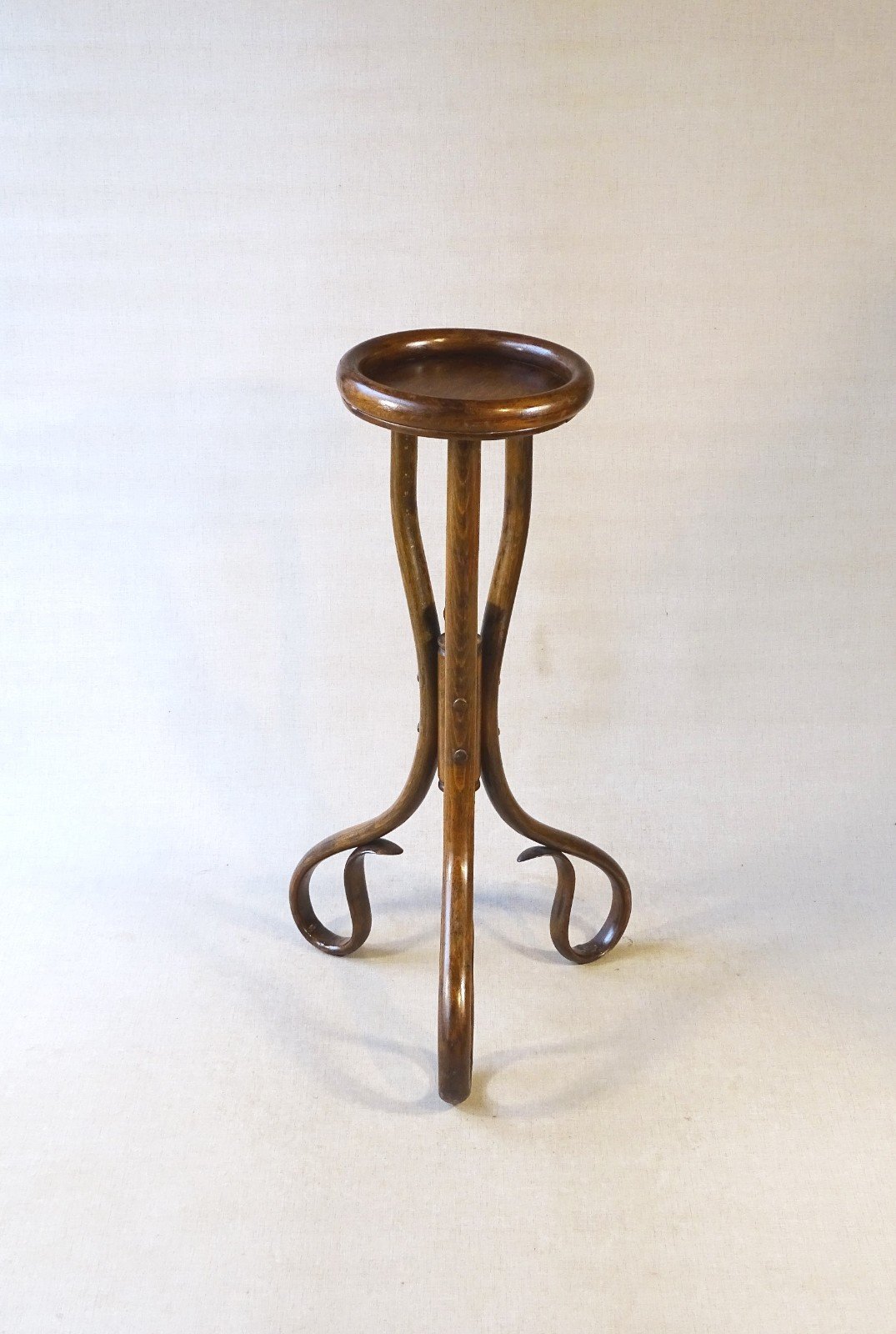 Tripod plant stand by FISCHEL circa 1890. It is easy to understand the success of this item as it appears in the brand's catalogs in 1915 and 1926, showcasing fifty years of "fashion." One of the most beautiful pieces published by Fischel! Total height: 75 cm, diameter of the dome: 25 cm. Perfect original condition. More photos and information available upon request. Shipping to France and Europe or pick-up in Alsace. Color: Walnut Number of pieces: 1 Type: Pedestal Brand: Fischel Origin: Austria Period: XIX Sub-type: Plant stand Country of origin: Austria Material: Beech Style: Bentwood