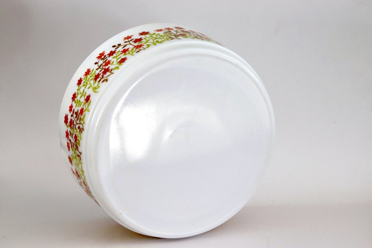 A beautiful piece with a 70s look, made of white glass delicately decorated with tiny flowers, typical of the Arcopal aesthetic.