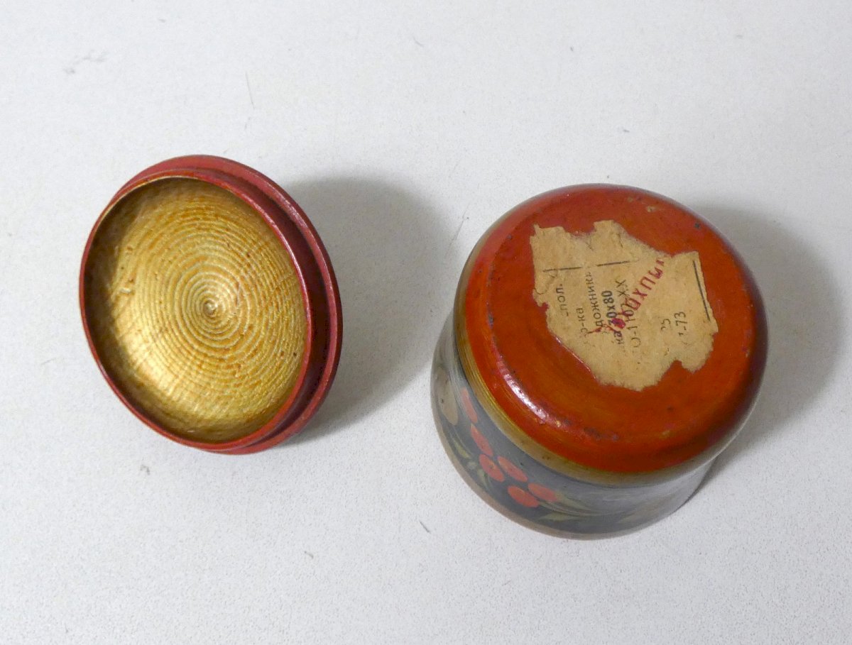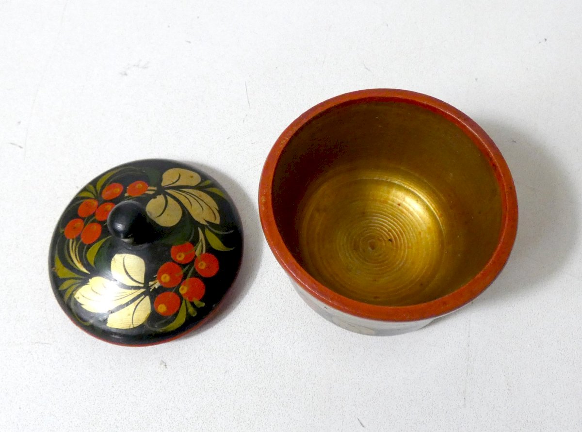 Folk Art. USSR. Very pretty small Khokhloma box. Height: 8 cm. Diameter 7 cm. In very good condition. Condition: Used: Item that has been used. Please refer to the seller's description for more details...Used: Item that has been used. any potential imperfections.