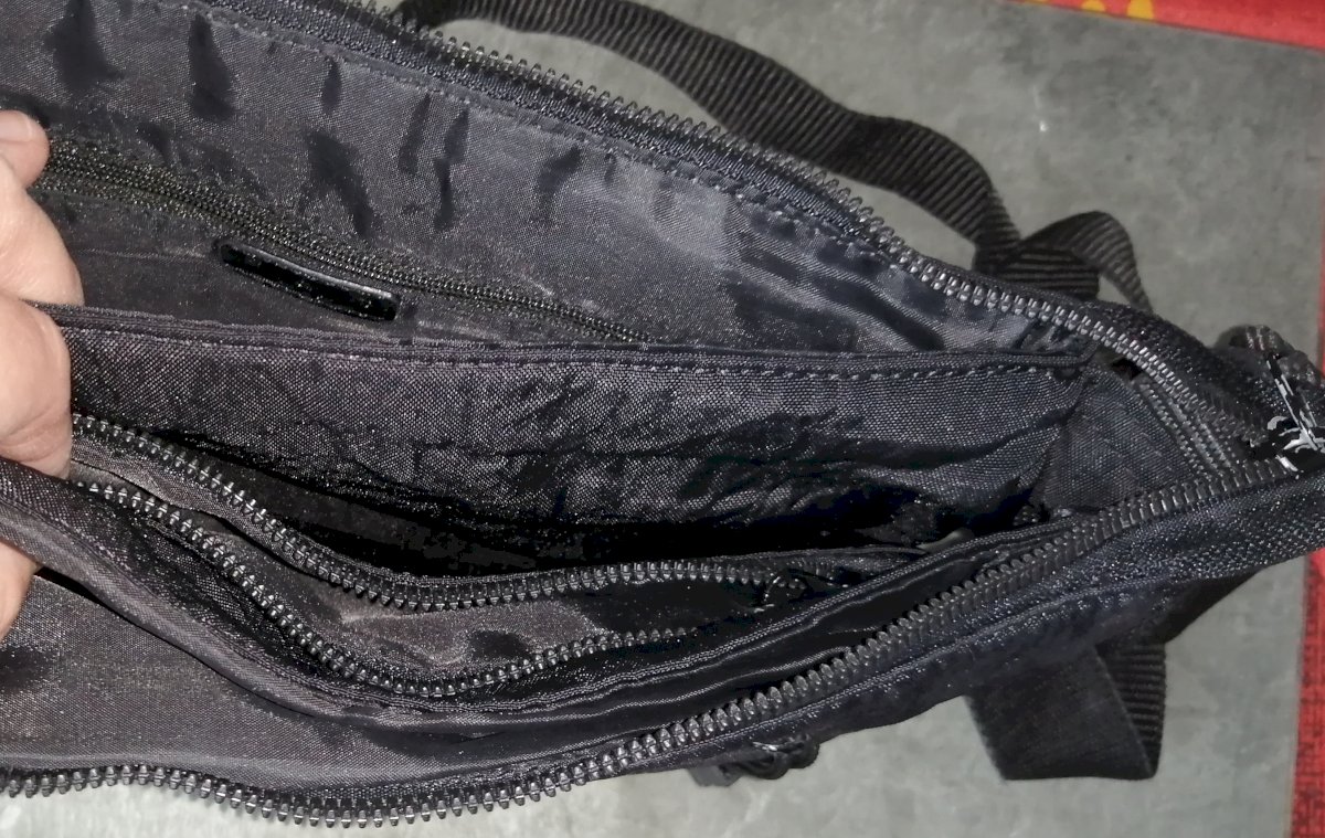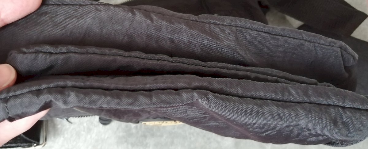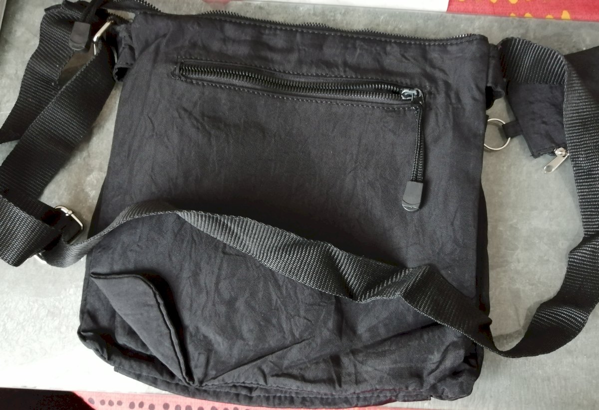 Black adjustable shoulder bag, waterproof and large enough to serve as a tote. Length 26cm, width 24cm, thickness 9cm. There are zippered pockets on all sides. 2 at the front, 3 in the center + 2 open pockets and 1 at the back. A small wallet can be attached to the bag.