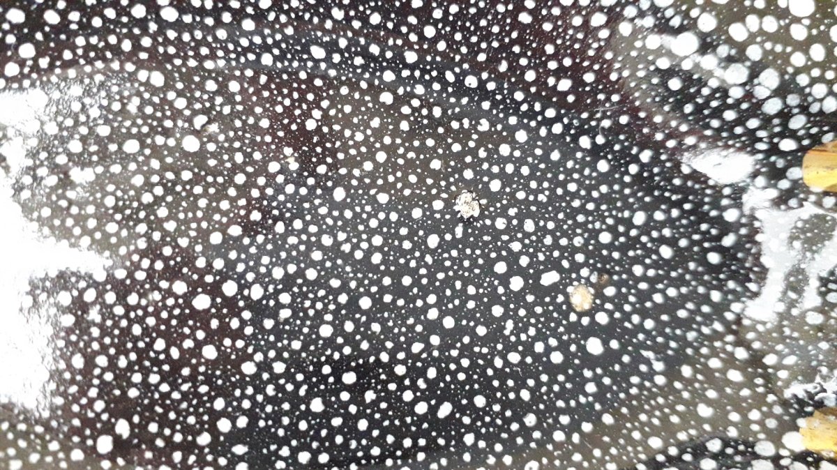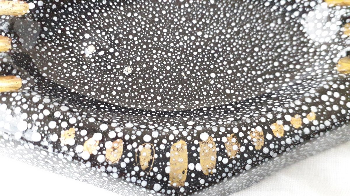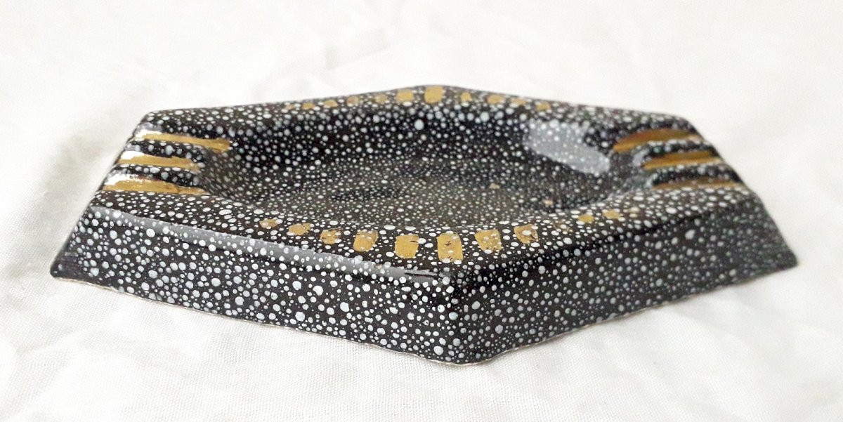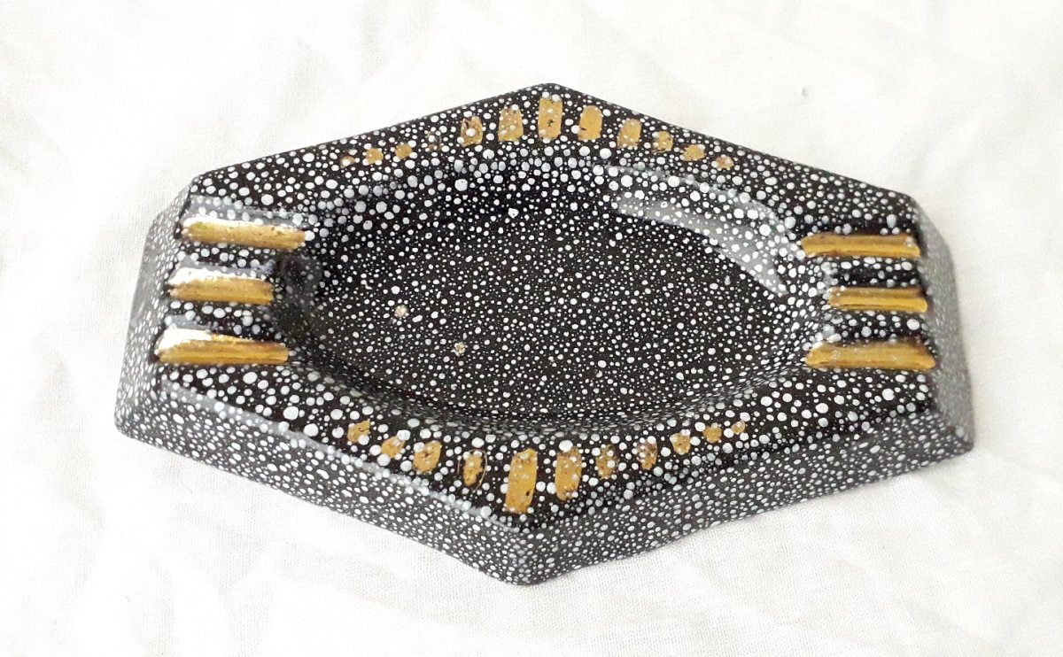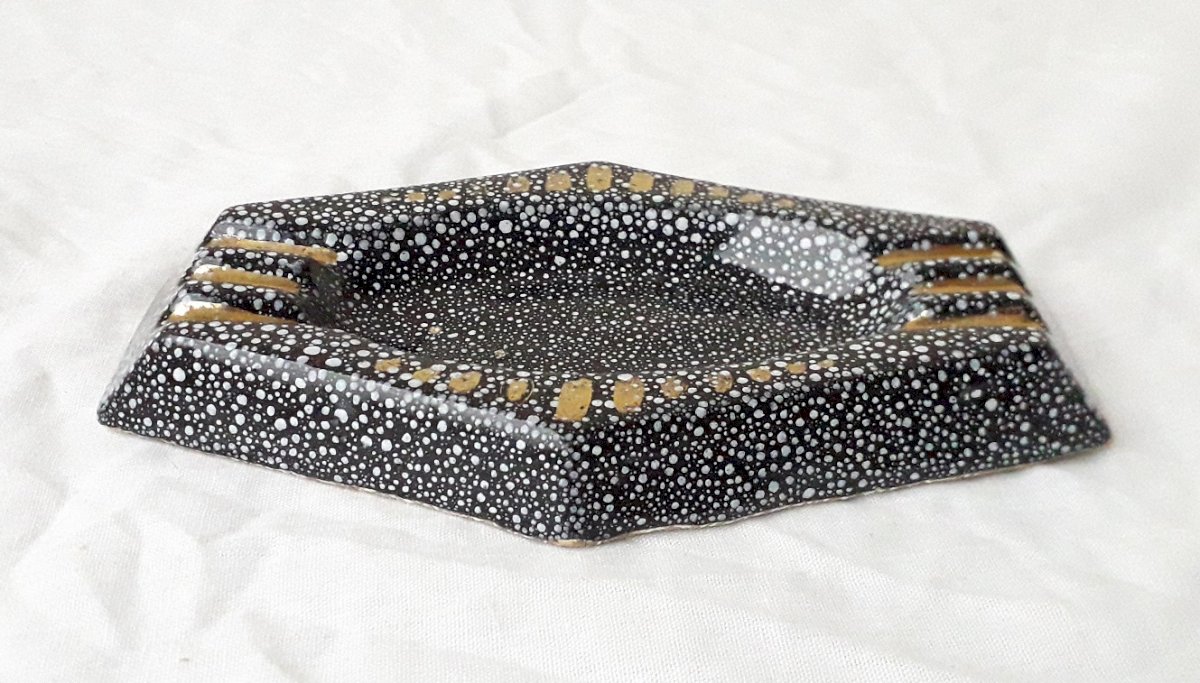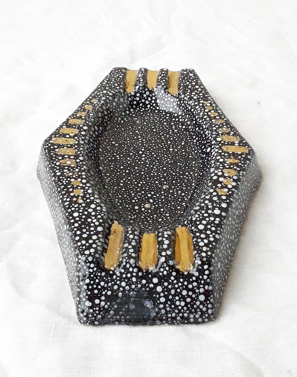 Ceramic ashtray with speckled decoration, unmarked and unsigned, which can be attributed to René Anchierri during the "Forah" period (1930-1952). Overall good condition, just two tiny enamel flakes on the bottom (barely visible, blending into the decoration).