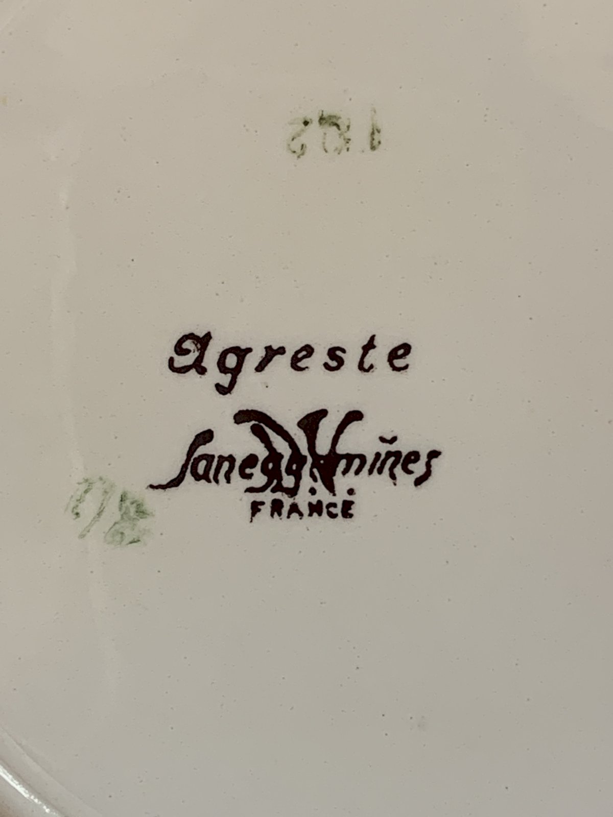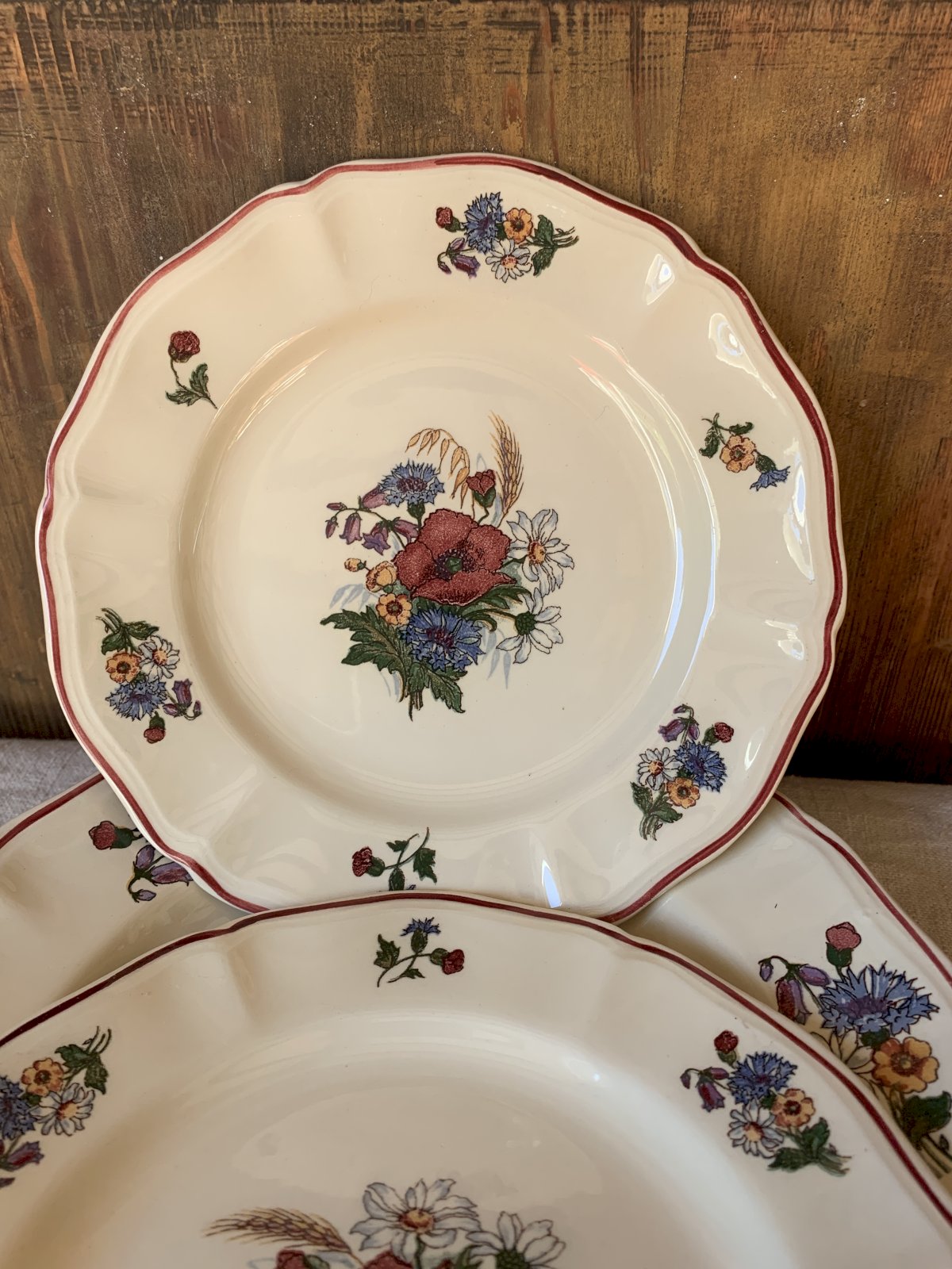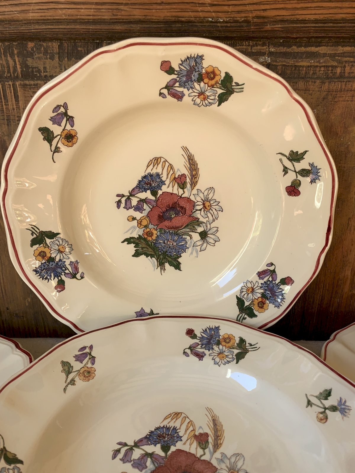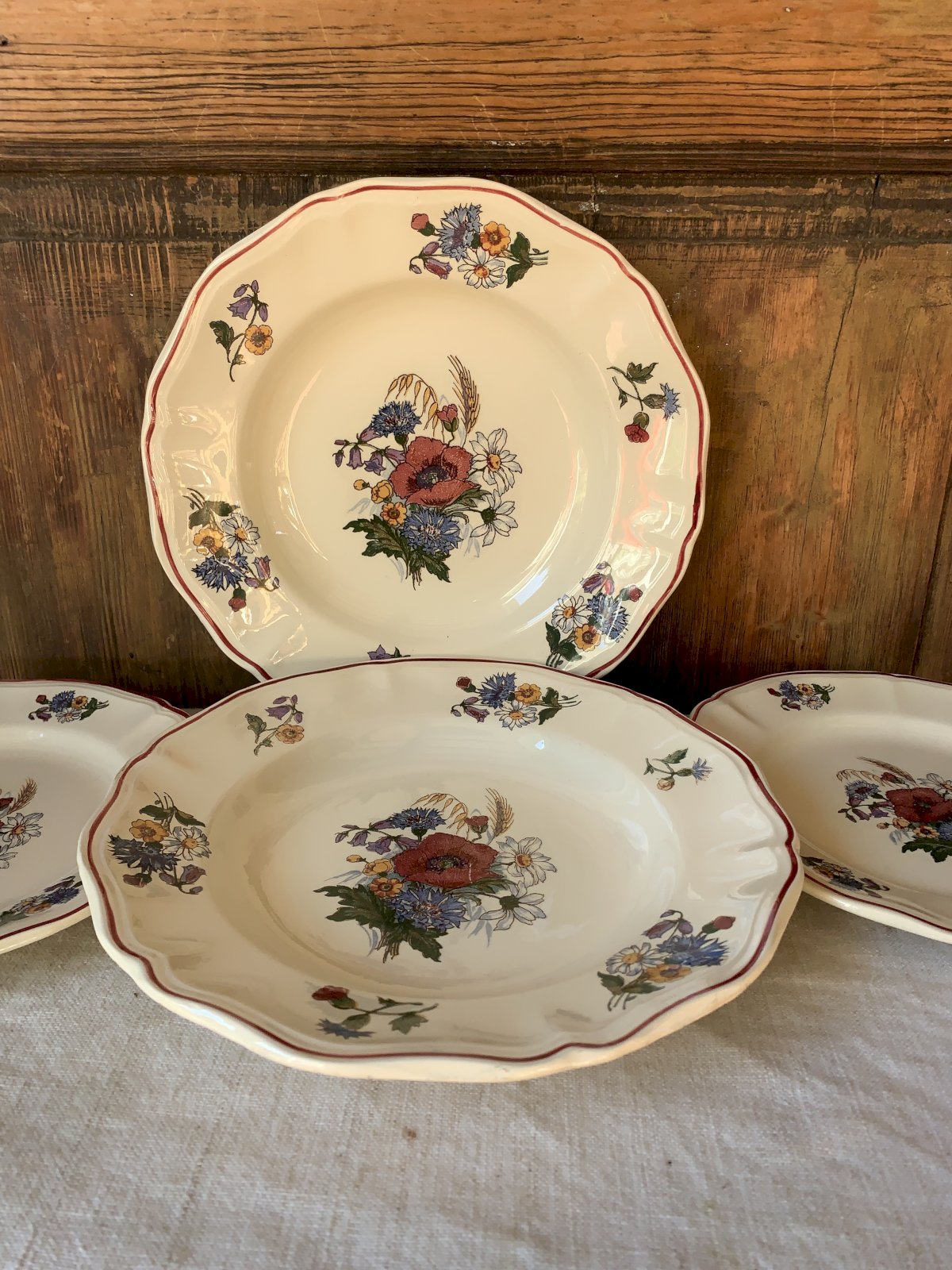 In very good condition, a set of four vintage plates, two deep and two dessert plates. Floral decoration. Scalloped edges. Stamped Sarreguemines Agreste model. Diameter of deep plate 25cm. Diameter of dessert plate 20cm.