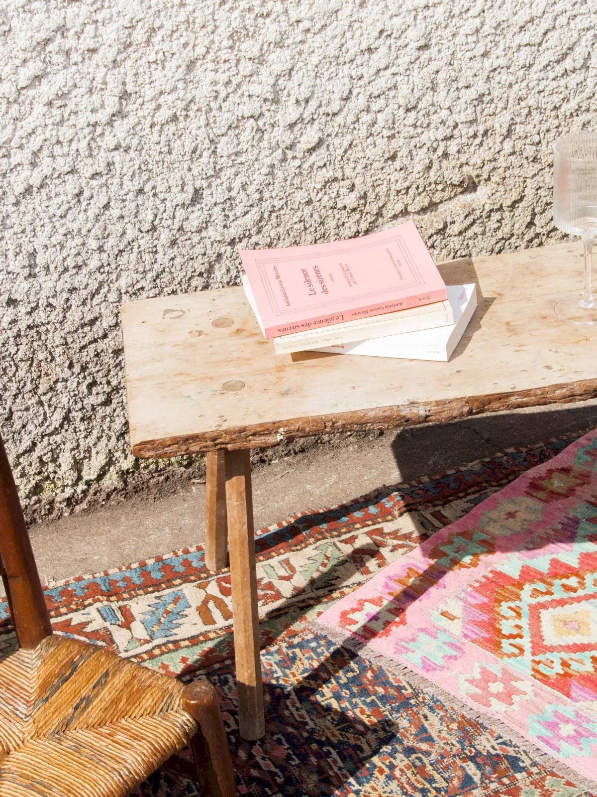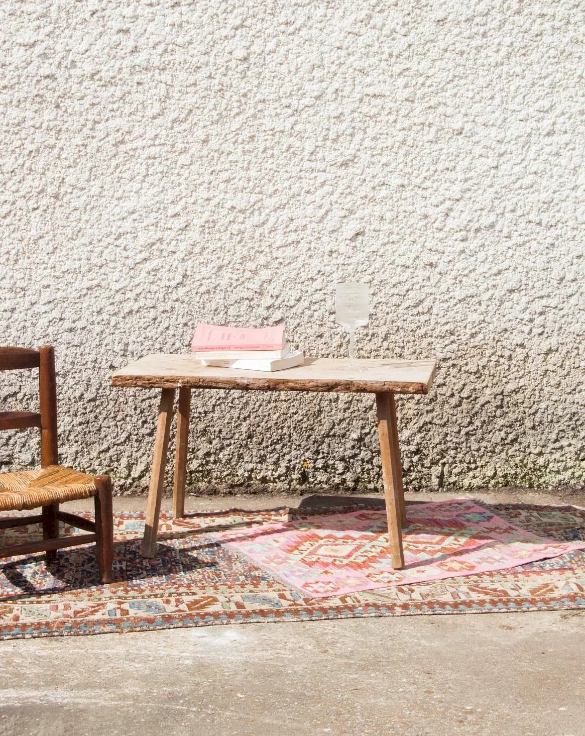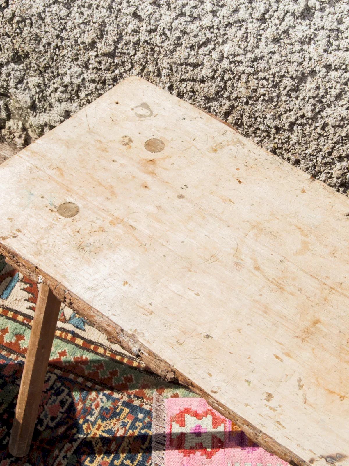 Add a touch of raw elegance to your interior with this brutalist wooden side table. Designed with carefully assembled legs attached to the tabletop, it stands out for its raw edges, highlighting the authentic character of the material. A splash of color adds an artistic note, making this piece a must-have for contemporary design enthusiasts. Ideal for complementing your living room or workspace, it combines functionality and aesthetics. Length: 77 cm Width: 36.5 cm Height: 45 cm Condition: Used: Item has been used. Item shows some signs of superficial wear... Used: Item has been used. Item shows some signs of superficial wear, fully operational and working properly. It may be a demonstration model or an item returned to the store after a short period of use. Possible imperfections. Brand: Debongout Type: Vintage product Material: Wood Style: Country Custom: Side tables