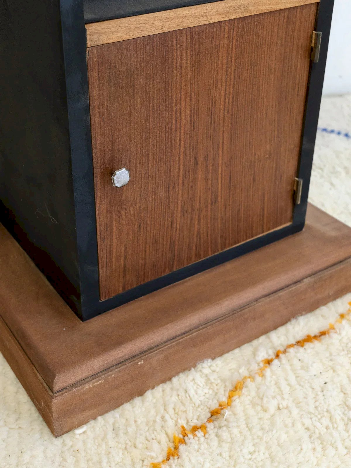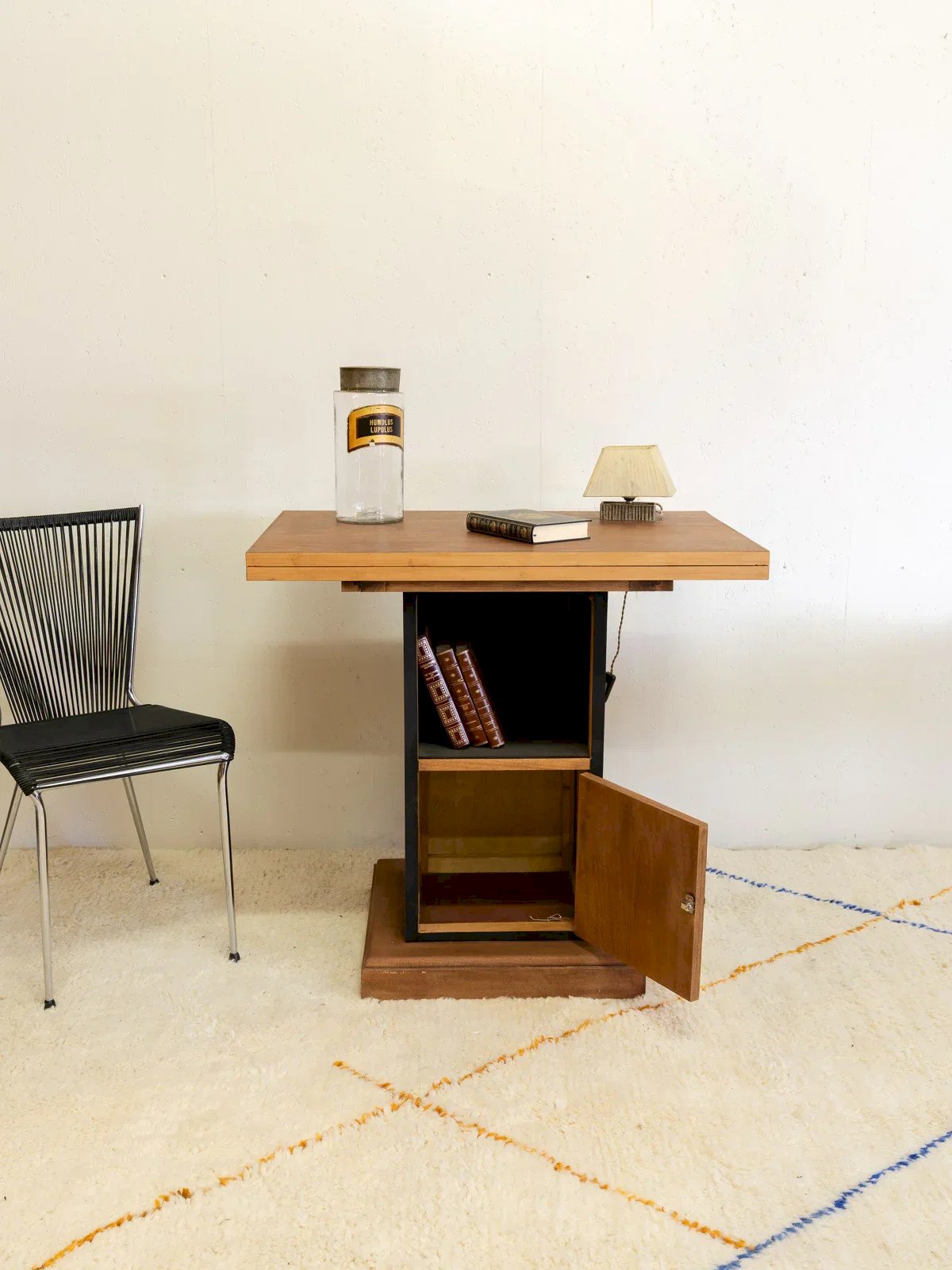 Add a practical and graphic touch with this wooden side table featuring black sides, whose top unfolds to transform into a small, friendly table. Its open niche and compartment with a metal handle offer discreet storage for books or accessories, while the square base asserts a contemporary and stable style. Ideal for a living room, an entrance, or a corner office, it combines functionality and elegance. Some signs of wear are present. Length: 85 cm Width: 55 cm Height: 80 cm Condition: Used: Item has been used. Item shows some superficial wear marks but is fully operational and functioning correctly. It may be a demonstration model or an item returned to the store after a short period of use, with possible imperfections. Brand: Debongout Type: Vintage product Material: Wood Style: Country Customized: Side tables