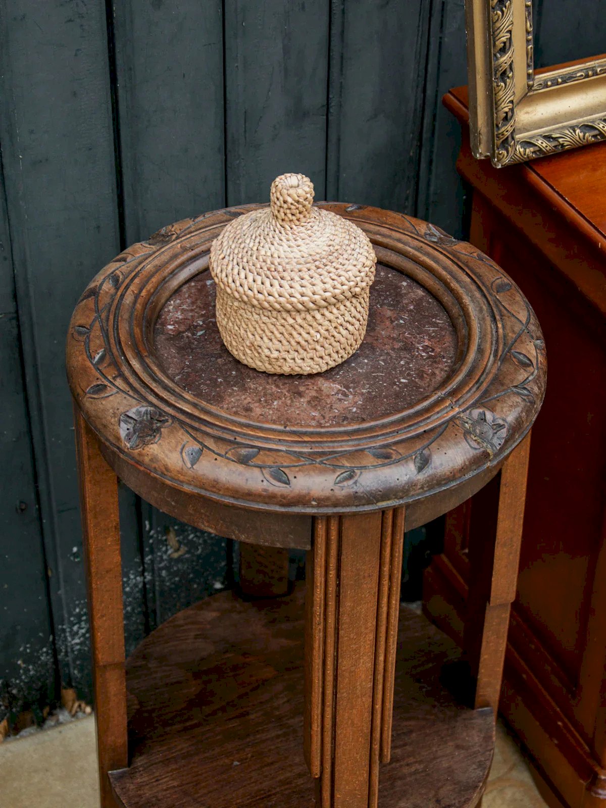 Discover this elegant round side table with a subtle veined brown marble top. Its compact size and slim silhouette make it an ideal accent table for the end of a sofa or as a bedside table. A discreet small shelf under the tabletop provides practical additional storage. The combination of marble and wood gives it a timeless classic charm. Perfect for adding a refined touch to your interior. Length: 33 cm Width: 33 cm Height: 61 cm Niche height: 35 cm Condition: Used: Item has been used. Item shows some signs of superficial wear... Used: Item has been used. Item shows some signs of superficial wear, fully operational and functioning correctly. It may be a display model or an item returned to the store after a short period of use. any imperfections. Brand: Debongout Type: Thrifted product Material: Marble Custom: Side tables Style: Country