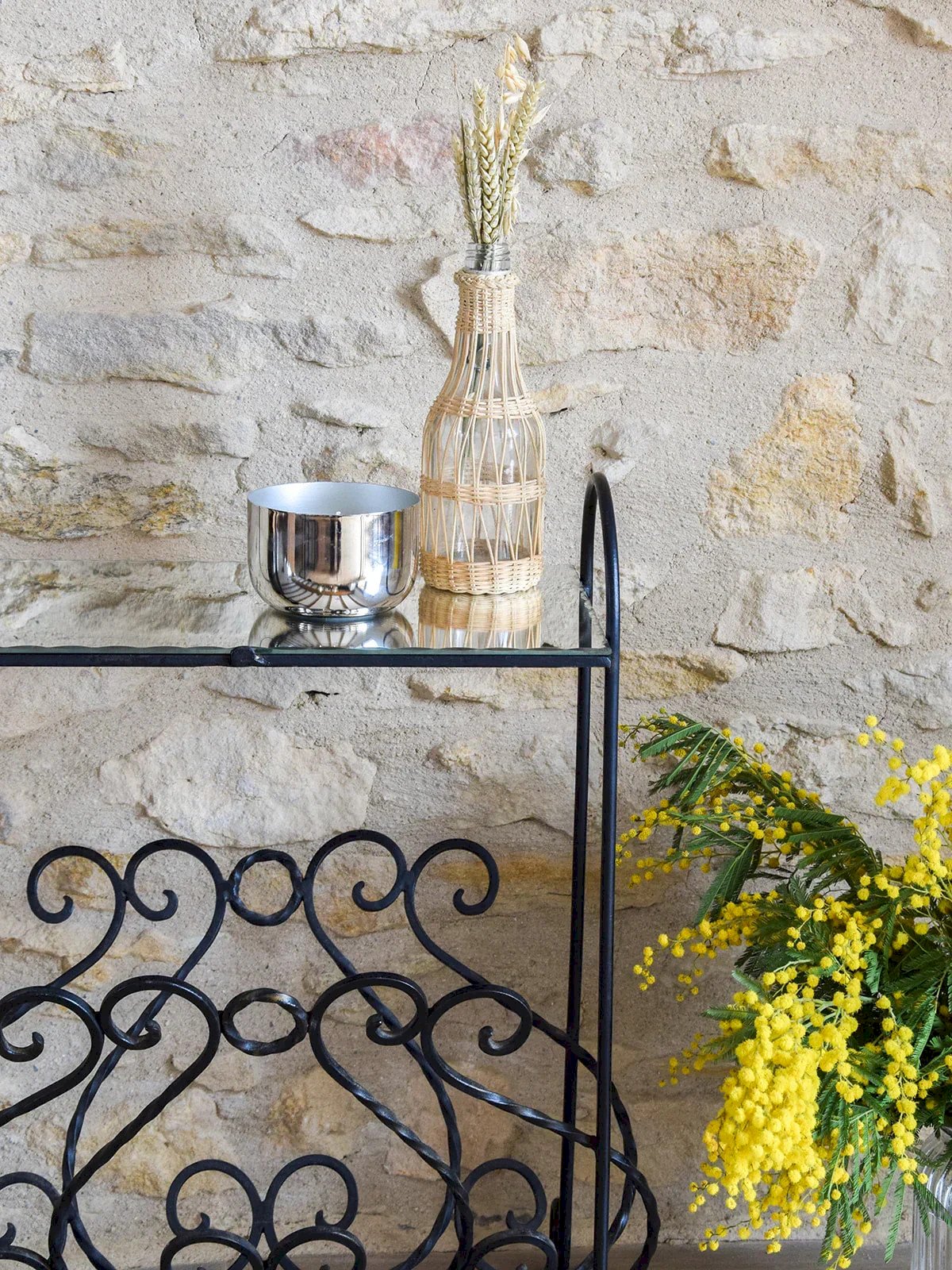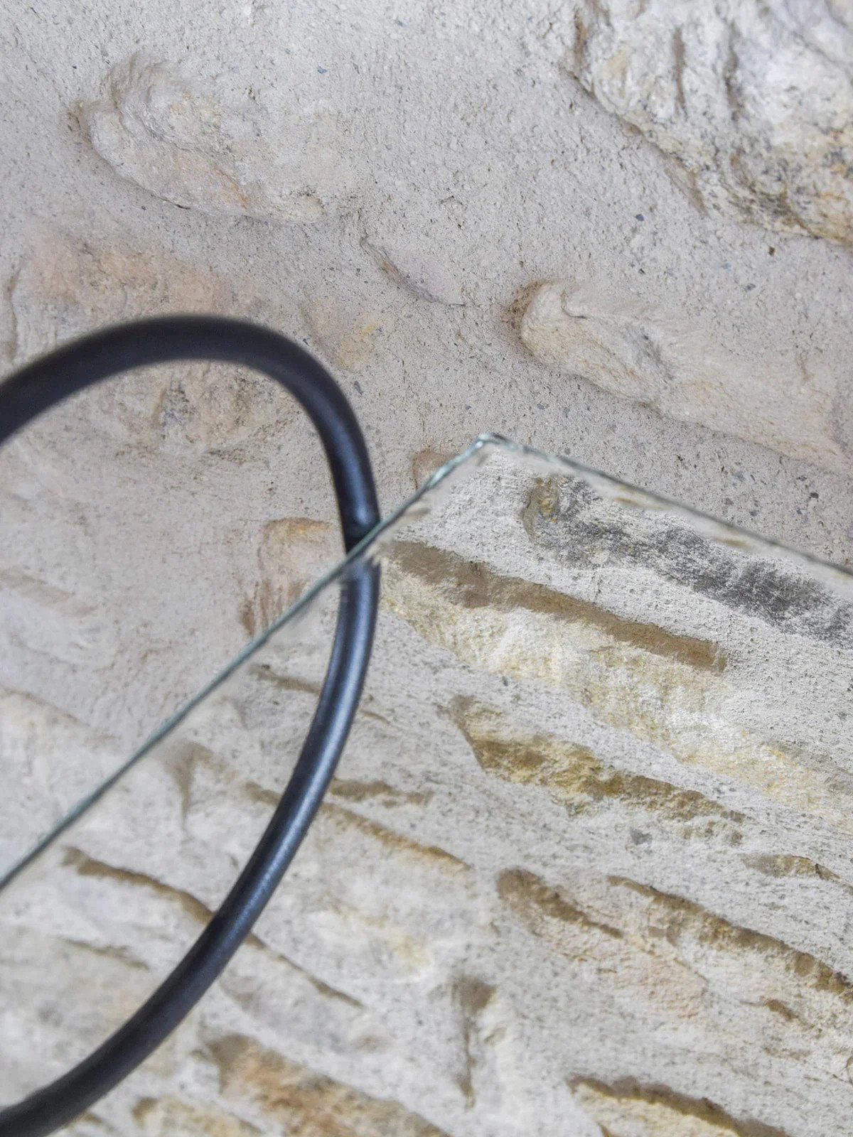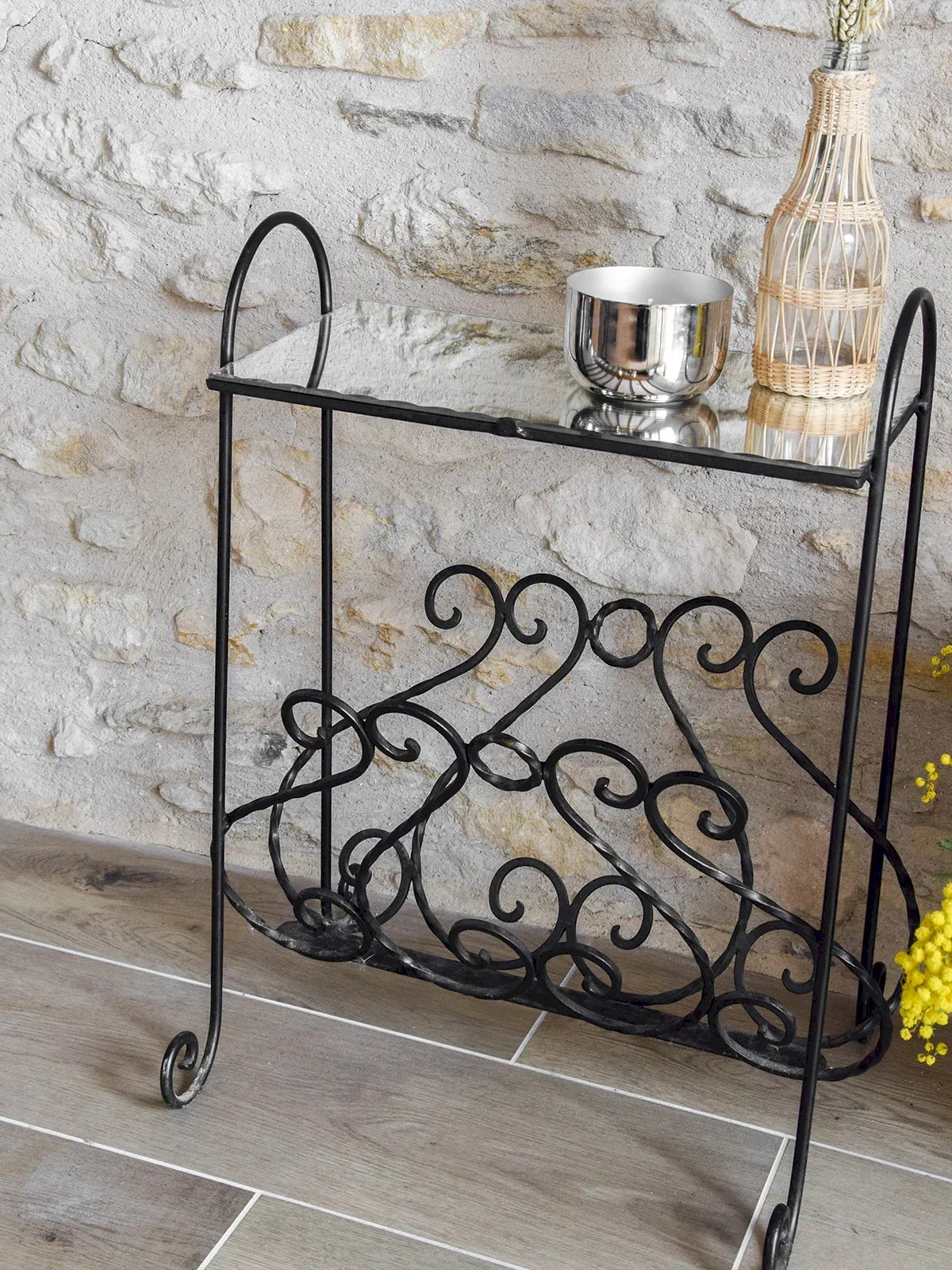 Bring an elegant touch to your interior with this wrought iron magazine holder featuring a refined design. Its mirrored top, both chic and practical, reflects light while adding a note of sophistication to your decor. Ideal for organizing your magazines, this piece combines aesthetics and functionality, making it a must-have for your living room or office. Let yourself be seduced by its sturdiness and timeless charm. Web exclusive, the meeting will take place at your home! Length: 42 cm Width: 28 cm Height: 57.5 cm Condition: Used: Item that has been used. Item showing some superficial signs of wear... Used: Item that has been used. Item showing some superficial signs of wear, fully operational and functioning correctly. It may be a demonstration model or an item returned to the store after a short period of use. Any possible imperfections. Brand: Debongout Type: Thrifted Product Material: Metal, Glass Style: Country Customizable: Side Tables