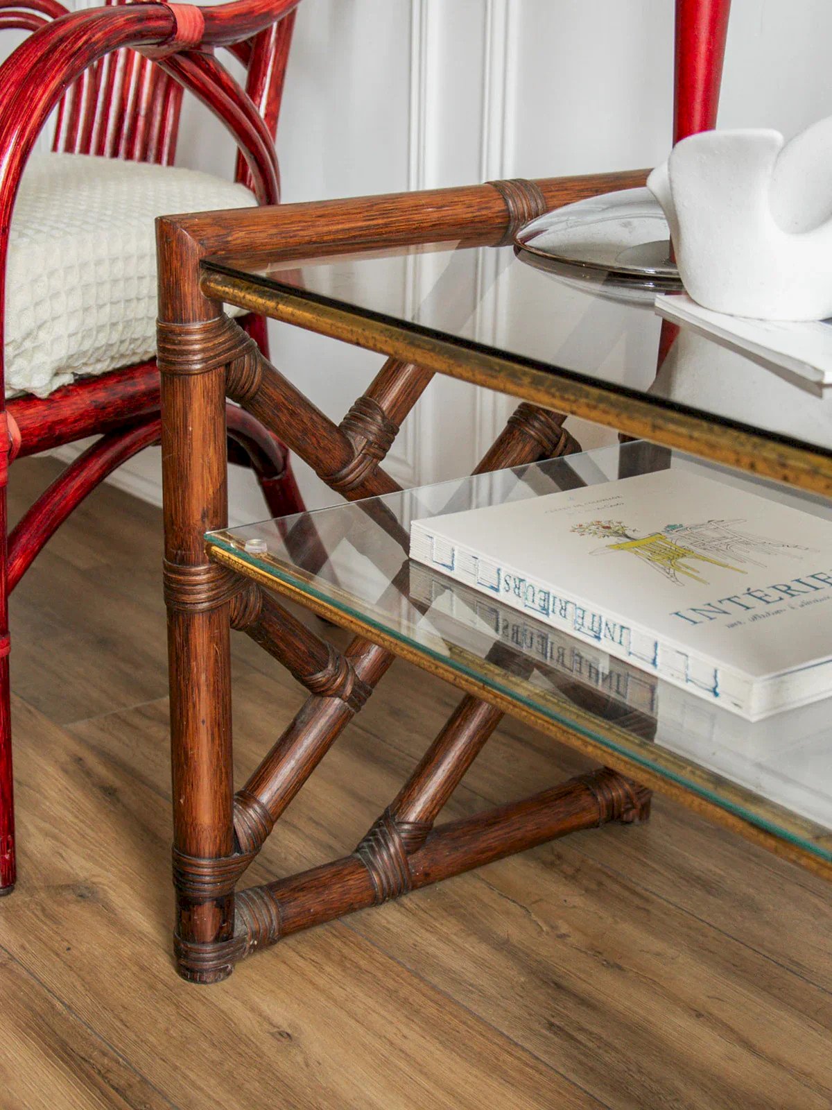 This rattan and glass side table combines lightness and functionality. With its two integrated shelves, it is perfect for holding your books, a pretty lamp, or some decorative objects. We love its natural and timeless design, which fits well in both a bedroom and a living room. An ideal piece to add a touch of elegance while optimizing space. Length: 54 cm Height: 48 cm Depth: 40 cm Niche height: 14 cm Condition: Used item: Item has been used. Item shows some superficial signs of wear... Used item: Item has been used. Item shows some superficial signs of wear, fully operational and working correctly. It may be a demonstration model or an item returned to the store after a short period of use. the possible imperfections. Brand: Debongout Type: Thrifted product Material: Rattan, Glass Customized: Side tables Style: Country