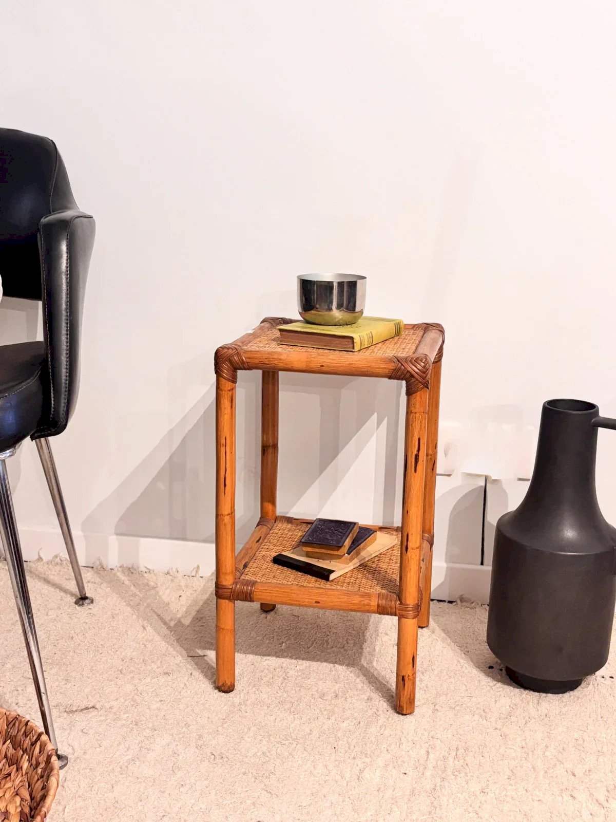 Add a touch of elegance to your interior with this wicker side table, perfect for any space. It easily fits into your living room, bedroom, or even your balcony. Its natural wicker design brings a warm and friendly note. Versatile and aesthetic, it is ideal for placing your books or a lamp while adding a unique stylistic dimension to your decor. This side table combines functionality and charm! Length: 29 cm Width: 29 cm Height: 51 cm Condition: Used: Item has been used. Item shows some superficial signs of wear ... Used: Item has been used. Item shows some superficial signs of wear, fully operational and functioning correctly. It may be a display model or an item returned to the store after a short period of use, with possible imperfections. Brand: Debongout Type: Thrifted product Material: Wicker Custom: Side tables Style: Country