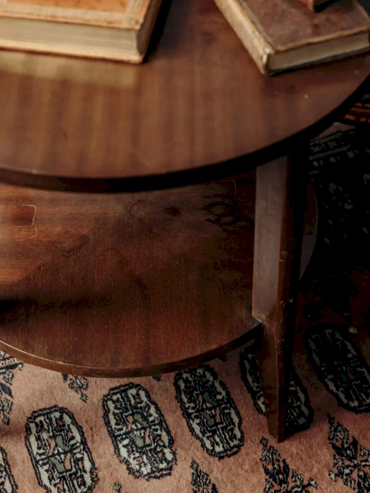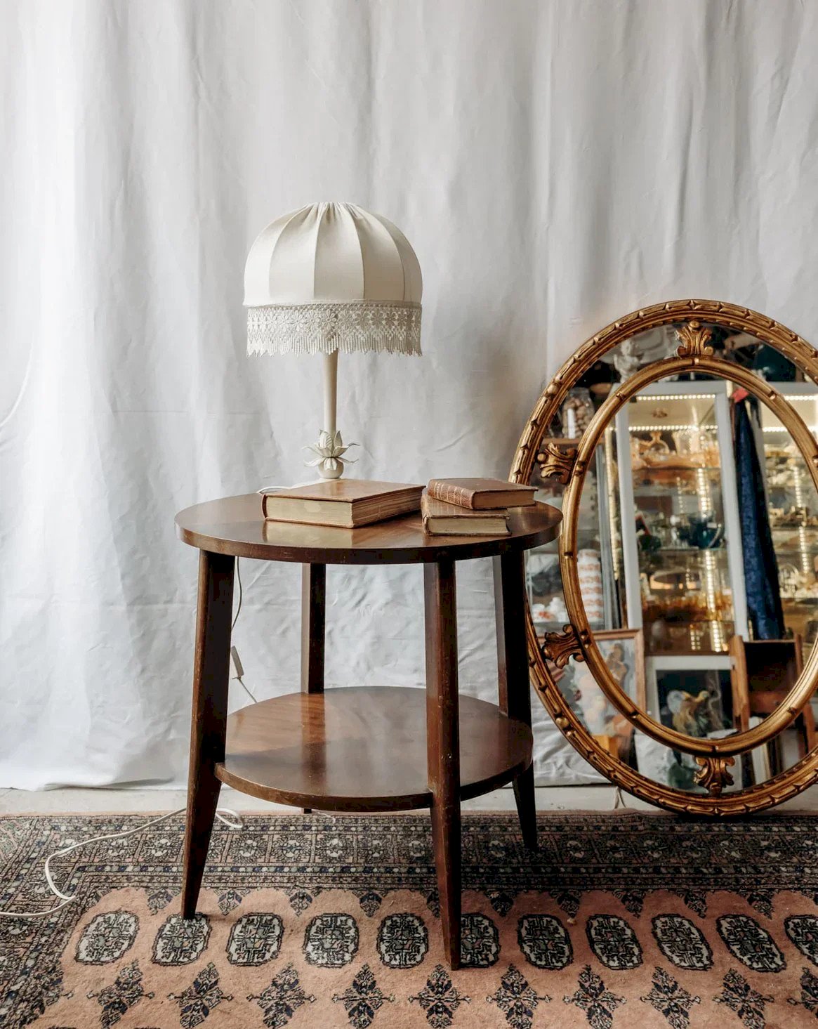Adopt this round side table with an airy design, featuring two stacked shelves that optimize space and invite you to place a lamp and books; its slender legs create an elegant and light silhouette while materials with a weathered finish add a warm and authentic touch; ideal next to a sofa or as a console table to structure a lounge area with simplicity and functionality. Light signs of wear are present. Diameter of the top: 59 cm Height: 59 cm Height of the niche: 33 cm Condition: Used: Item that has been used. Item showing some superficial signs of wear,... Used: Item that has been used. Item showing some superficial signs of wear, fully operational and functioning correctly. It may be a demo model or an item returned to the store after a short period of use. the possible imperfections. Brand: Debongout Type: Vintage product Material: Wood Style: Country Custom: Side tables