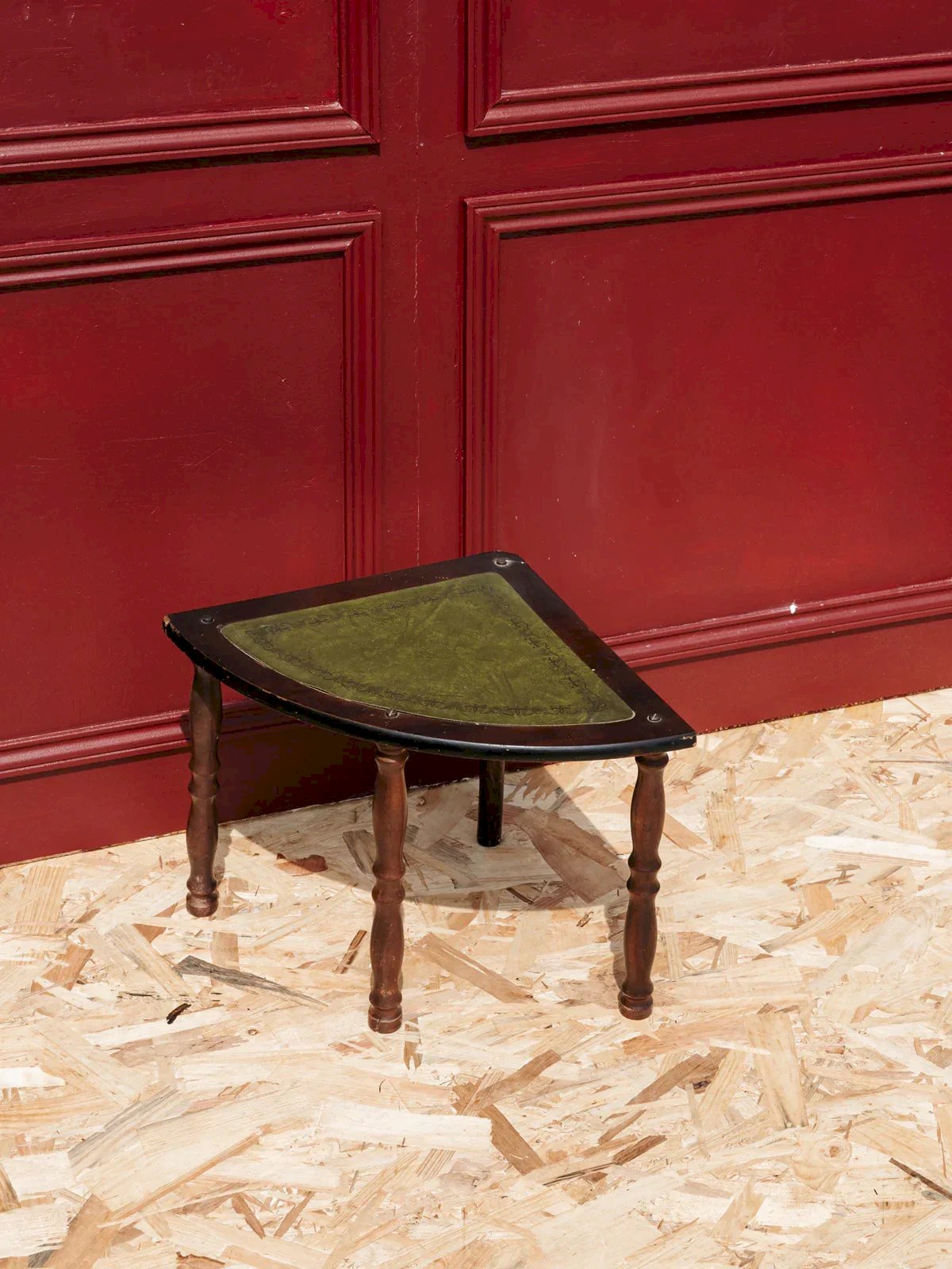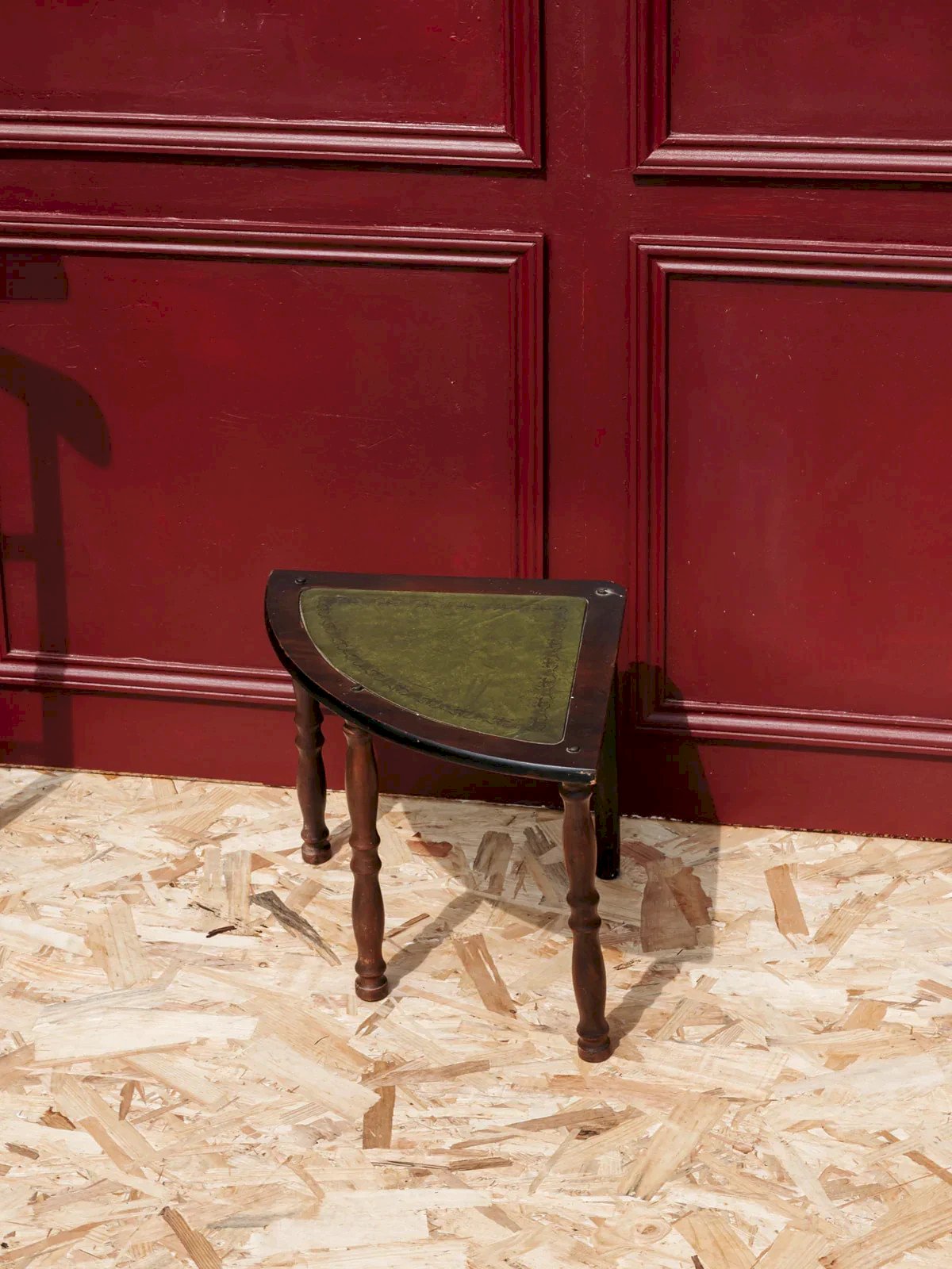 Discover this charming wooden corner side table, combining elegance and functionality. Covered in green leather fabric, it will add a vintage touch to your interior. Although signs of wear are visible, this reflects the unique character and authenticity of this piece of furniture. Ideal for optimizing your spaces while adding a warm note to your decor. Length: 33 cm Width: 33 cm Height: 31 cm Condition: Used: Item that has been used. Item showing some superficial wear marks, ...Used: Item that has been used. Item showing some superficial wear marks, fully operational and working correctly. It may be a demonstration model or a returned item after a short period of use. the possible imperfections. Brand: Debongout Type: Vintage item Material: Wood, Leather Custom: Side tables Style: Country