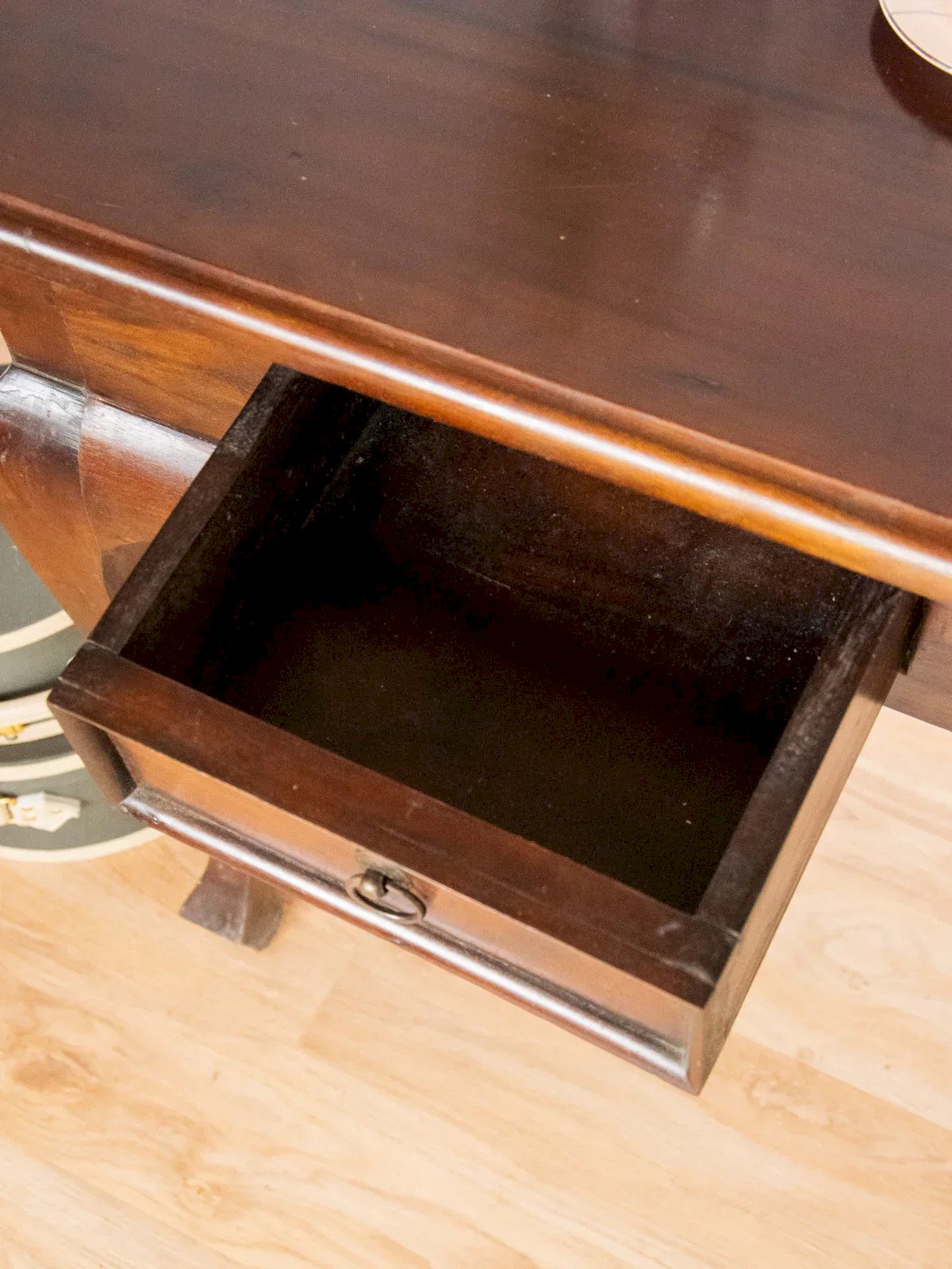 Add a warm and structured touch to your entryway or living room with this dark wood console table, enhanced by understated iron handles. Its two drawers provide discreet storage for keys and small items, while its top holds a lamp and decorative elements thanks to its compact and harmonious proportions. Its style blends industrial inspiration with a welcoming patina. Signs of wear and scratches are present. Length: 121 cm Width: 50.5 cm Height: 78.5 cm Height under the top: 62.5 cm Drawer height: 6.5 cm Condition: Used: Item that has been used. Item showing some superficial signs of wear, fully operational and functioning correctly. It may be a demonstration model or an item returned to the store after a short period of use. any imperfections. Brand: Debongout Type: Vintage product Material: Wood, Iron Style: Country Customized: Side tables