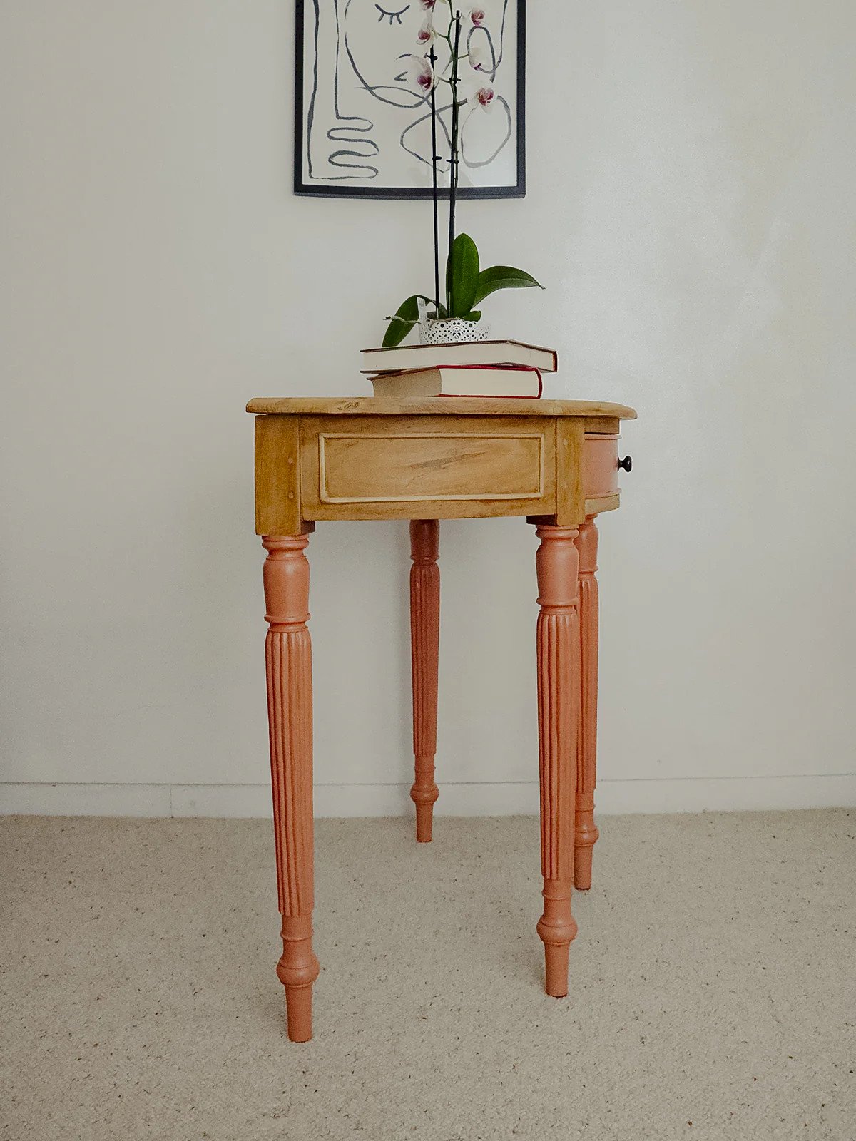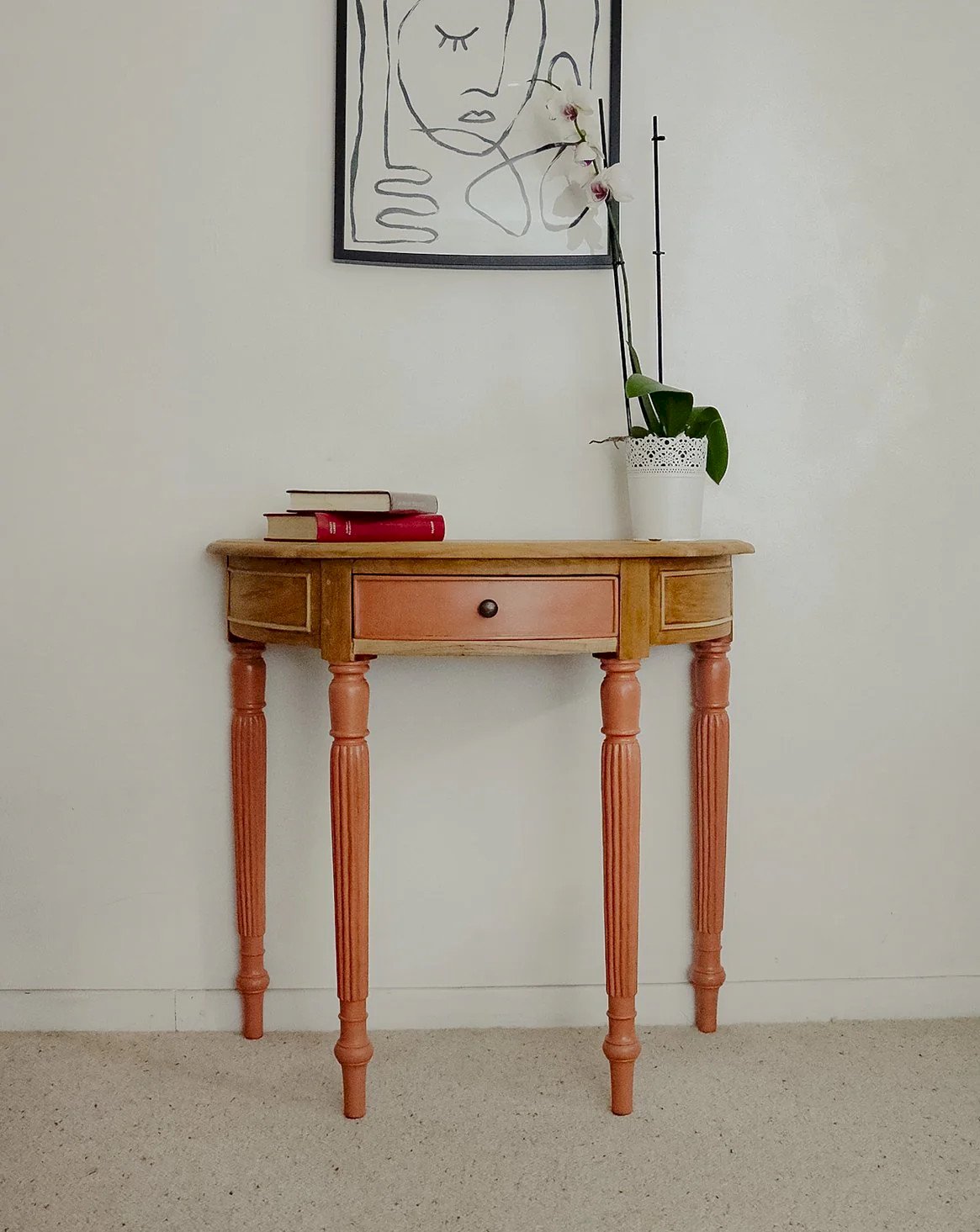 Adopt this wooden demi-lune console with a raw top and light wood finish for natural elegance. Its legs and small terracotta drawer add a graphic and chromatic touch that structures the space, while the semicircular top provides enough surface for a lamp, books, and decorative items. The discreet, deep drawer accommodates keys and small accessories without weighing down the silhouette. Ideal for an entryway or living room for a soft and welcoming atmosphere. Length: 81 cm Width: 40 cm Height: 74 cm Drawer height: 6 cm Condition: Used: Item has been used. Item shows some superficial signs of wear, ...Used: Item has been used. Item shows some superficial signs of wear, fully operational and functioning correctly. It may be a demonstration model or an item returned to the store after a short period of use. any possible imperfections. Brand: Debongout Type: Vintage product Material: Wood Style: Country Custom: End tables
