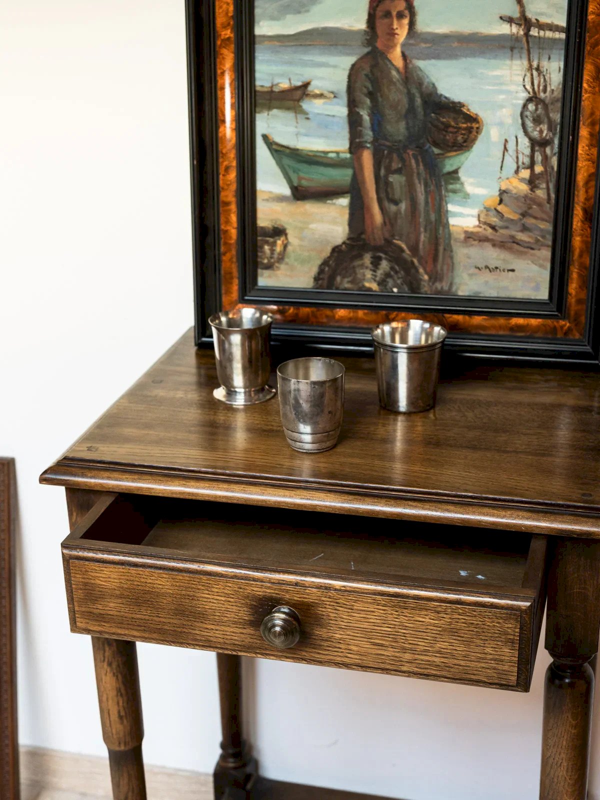 Add a touch of elegance to your home with this refined design side table. Featuring a large brass handle, it combines aesthetics and practicality, making it easy to move as needed. Perfectly suited to all styles of decor, this table can serve as both a support for your books and an auxiliary piece for your drinks. Handmade with quality materials, it is the ideal companion for your living room or bedroom. Online exclusive, the meeting will take place at your home! Length: 54 cm Width: 44 cm Height: 75 cm Condition: Used: Item that has been used. Item shows some superficial signs of wear... Used: Item that has been used. Item shows some superficial signs of wear, fully operational and working correctly. It may be a display model or an item returned to the store after a short period of use. Any imperfections. Brand: Debongout Type: Thrifted product Material: Wood Style: Country Custom: Side tables