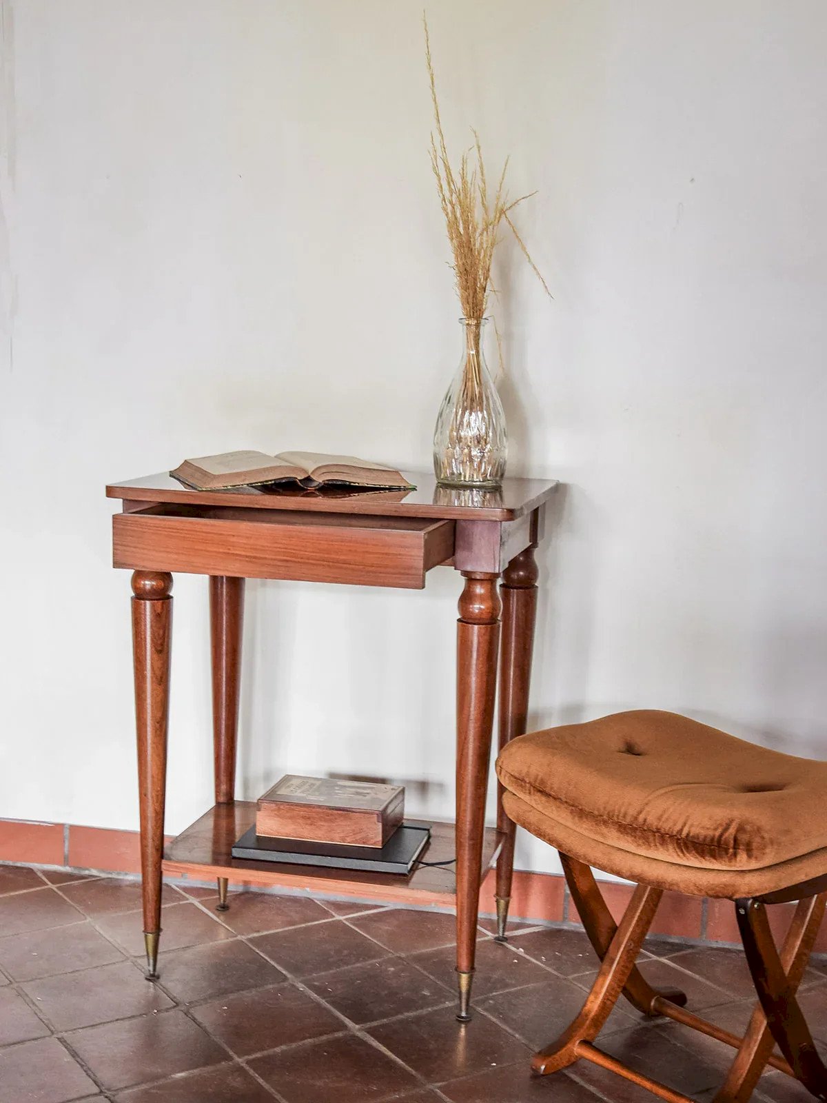 Add a touch of elegance to your interior with this wooden side table, featuring detailed legs and a brass finish at the bottom. Practical and aesthetic, it includes an invisible drawer for discreet storage. Although it has a few scratches on the top, this does not detract from its charm. Online exclusive, the meeting will take place at your home! Length: 66 cm Width: 45 cm Height: 83 cm Drawer height: 4 cm Condition: Second-hand: Item has been used. Item shows some superficial wear marks, ... Second-hand: Item has been used. Item shows some superficial wear marks, fully operational and functioning correctly. It may be a demonstration model or an item returned to the store after a short period of use with any possible imperfections. Brand: Debongout Type: Vintage product Material: Wood Style: Country Custom: Side tables