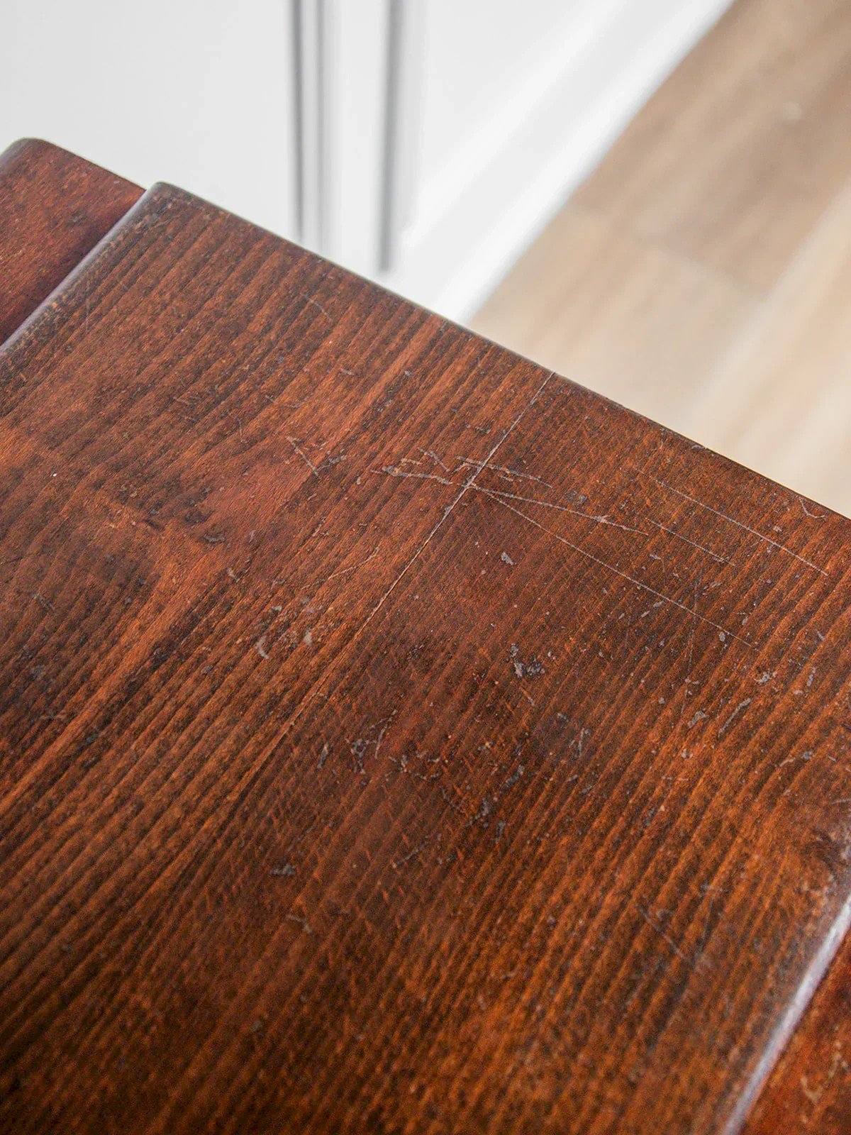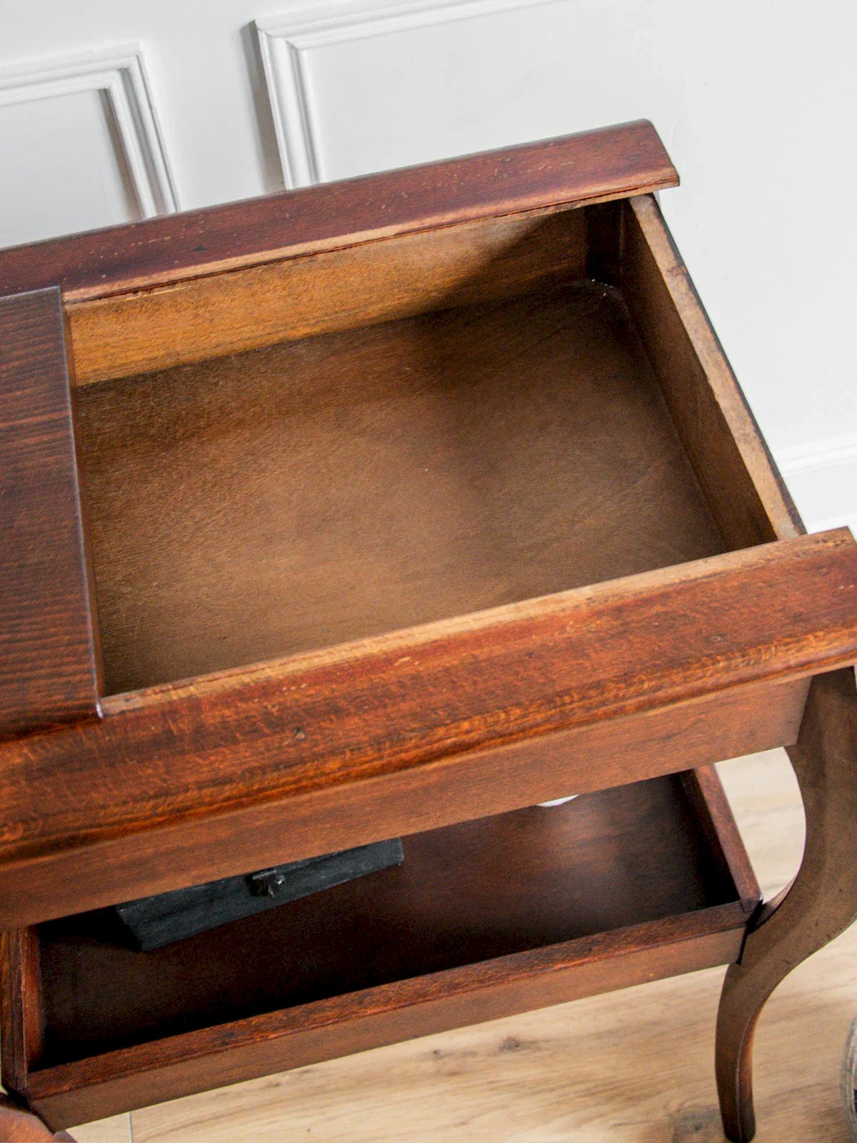 Discover our elegant dark wood side table with a patinated charm. Its clever design includes two trays, one of which slides to reveal a discreet storage space. Its curved legs add a refined touch to this functional piece of furniture. Although it has some scratches on the top, it remains a unique item at a low price. Ideal for optimizing your space with style and character. Web exclusive, the meeting will take place at your home! Length: 54 cm Height: 74 cm Depth: 36.5 cm Niche height: 8 cm Condition: Used item. Item shows some superficial signs of wear, fully operational and functioning properly. It may be a display model or an item returned to the store after a short period of use, with any possible imperfections. Brand: Debongout Type: Thrifted product Material: Wood Style: Country Customized: Side tables