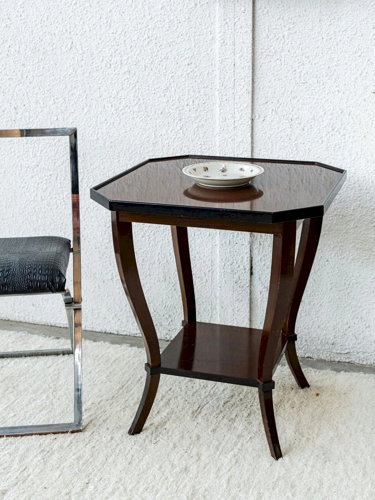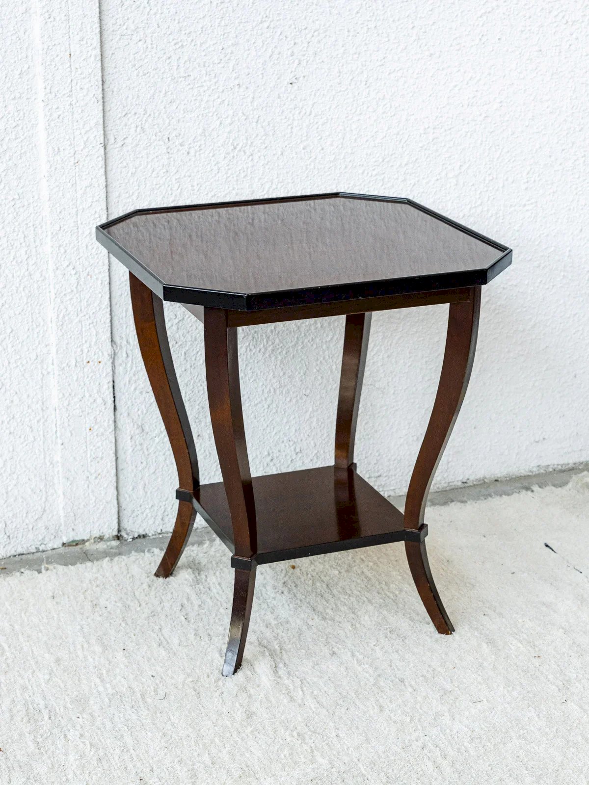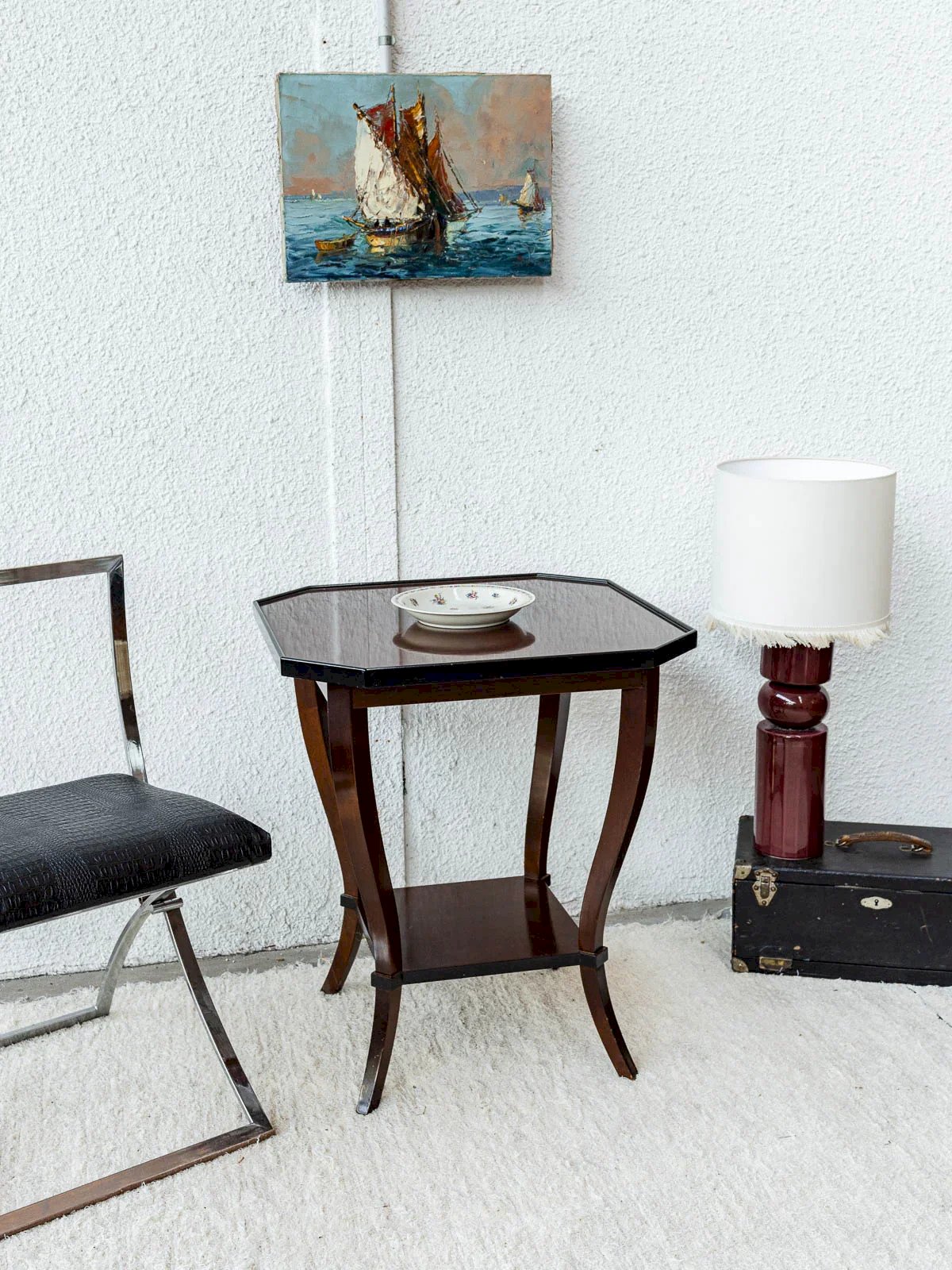 Add a touch of retro elegance to your interior with this vintage side table that has undeniable charm. Its mahogany-stained wood brings warmth and authenticity, while its black belted finish highlights a timeless design. Ideal for completing your living room or bedroom space, this table is as practical as it is aesthetic, offering an ideal surface for your decorative items or drinks. A must-have for vintage style lovers! Exclusive online offer, the meeting will take place at your home! Length: 61 cm Width: 61 cm Height: 70 cm Condition: Used item. Item shows some superficial wear marks, ...Used item. Item shows some superficial wear marks, fully operational and functioning properly. It may be a demonstration model or an item returned to the store after a short period of use. Any possible imperfections. Brand: Debongout Type: Curated product Material: Wood Style: Country Customized: Side tables