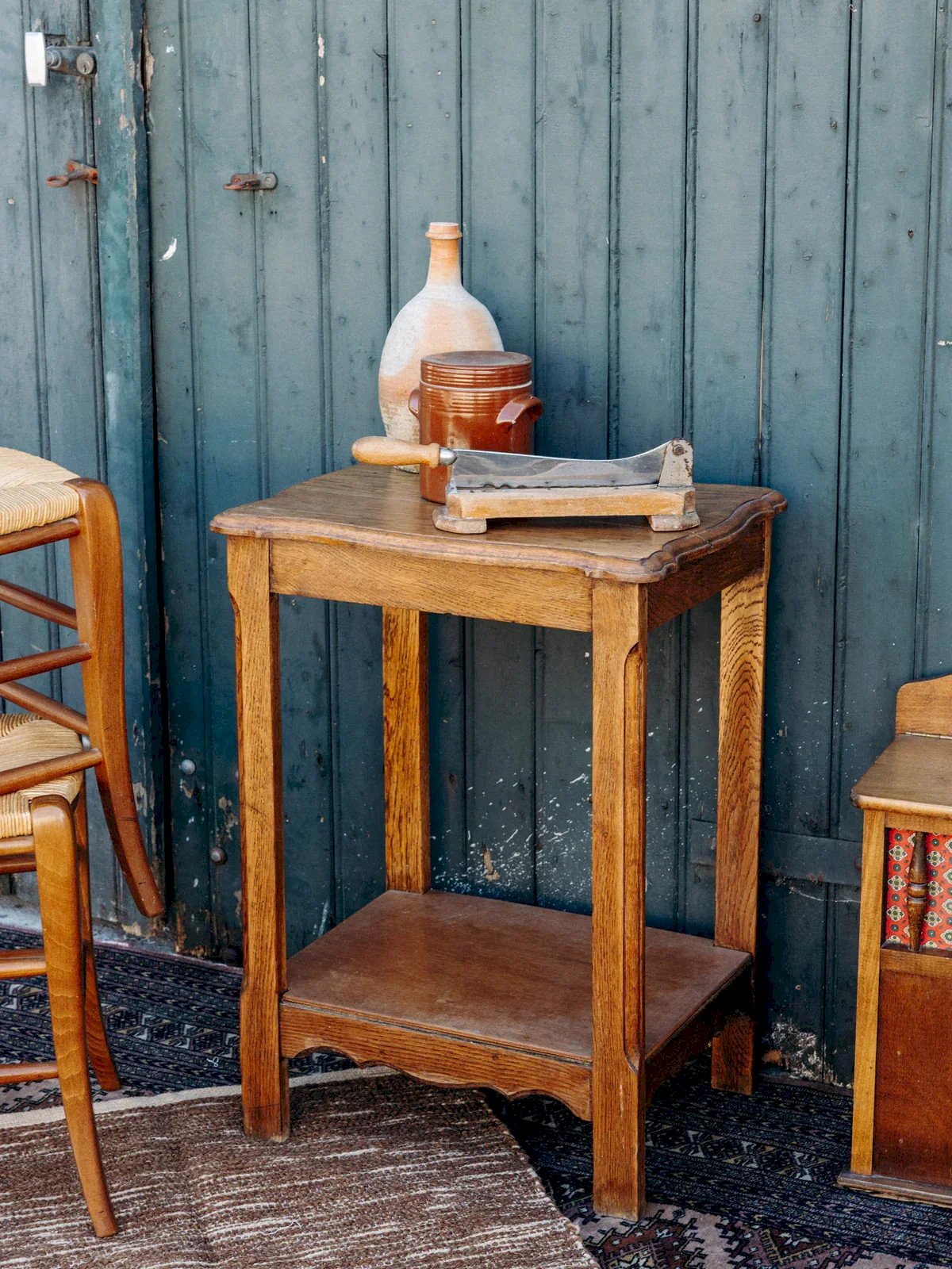 Discover this elegant oak side table, combining natural charm and practicality. Its simple lines and authentic wood harmoniously fit into any interior. Equipped with two shelves, one of which has been recently veneered, it is perfect for displaying your decorative items or holding your drinks. An undeniable asset for your living room or bedroom. Length: 52 cm Width: 40 cm Height: 70 cm Condition: Pre-owned: Item has been used. Item shows some superficial signs of wear, fully operational and functioning correctly. It may be a demonstration model or an item returned to the store after a short period of use, with possible imperfections. Brand: Debongout Type: Vintage product Material: Wood Style: Country Customized: Side tables