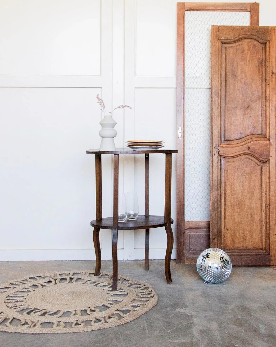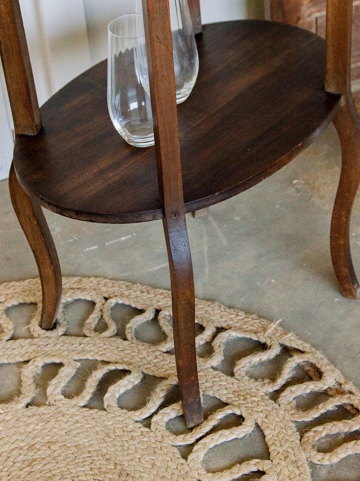 Discover this elegant oval dark wood side table, which will add a warm touch to your interior. It features two surfaces, an upper and a lower one, perfect for storing or displaying your favorite items. Its curved legs give it a fluid and refined design. Ideal for a living room, a bedroom, or an office, this table combines practicality and style. A charming piece of furniture that fits perfectly into any type of decor! Length: 55 cm Height: 77 cm Depth: 42 cm Space between surfaces: 40 cm Condition: Used: Item that has been used. Item showing some superficial signs of wear... Used: Item that has been used. Item showing some superficial signs of wear, fully operational and functioning correctly. It may be a demonstration model or an item returned to the store after a short period of use. any potential imperfections. Brand: Debongout Type: Thrifted Product Material: Wood Style: Country Customized: Side tables