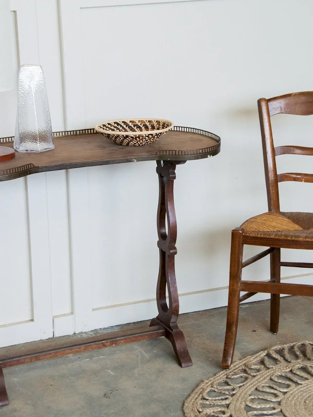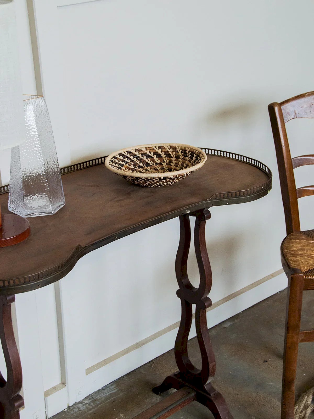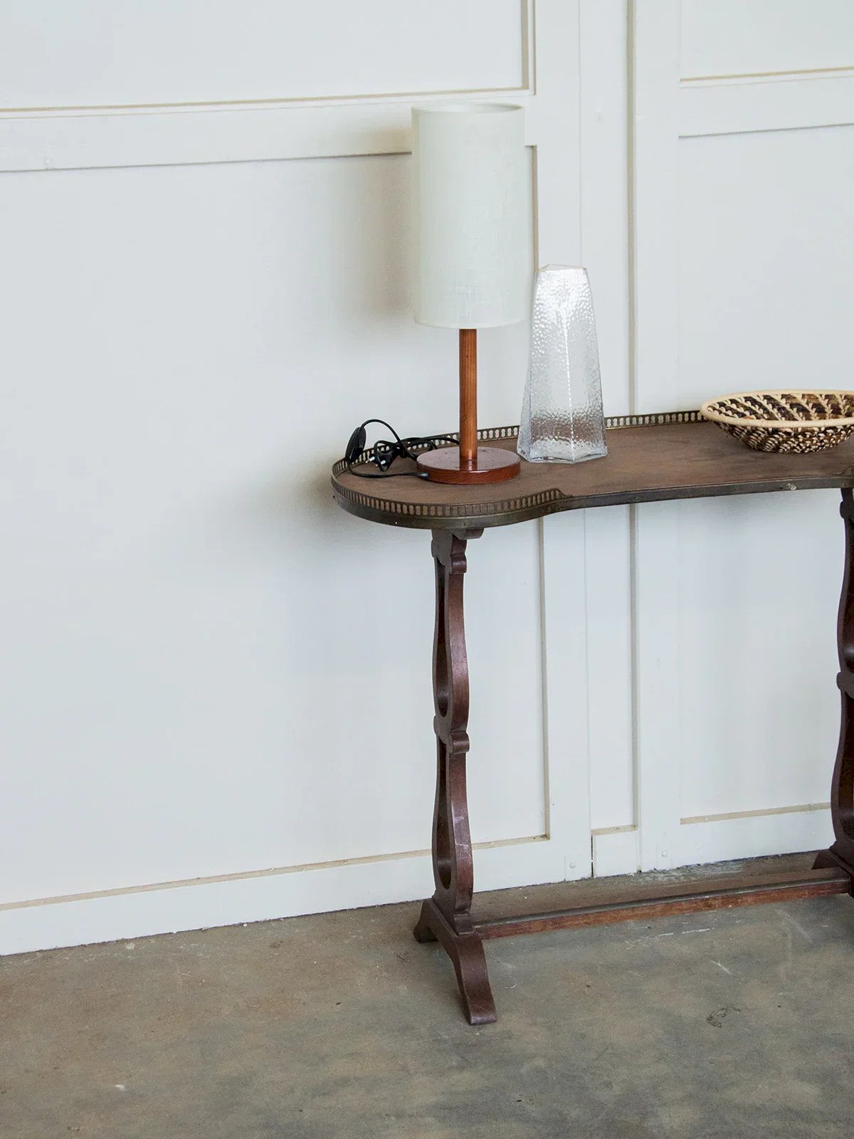 Fall for this uniquely designed bean-shaped table, featuring metal edges that add a touch of modernity to its appearance. Its dark wooden legs and central bar provide both stability and elegance, creating a beautiful balance between materials. Ideal for a living room or dining area, this table adds character while remaining understated. A unique piece of furniture that blends perfectly into a contemporary or industrial interior, while adding a note of sophistication. Length: 93 cm Width: 46 cm Height: 75 cm Condition: Used: Item has been used. Item shows some superficial signs of wear...Used: Item has been used. Item shows some superficial signs of wear, fully operational and functioning properly. It may be a display model or an item returned to the store after a short period of use. any possible imperfections. Brand: Debongout Type: Thrifted product Material: Wood, Metal Style: Country Custom: Side tables