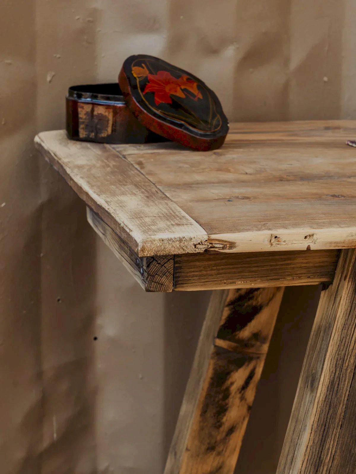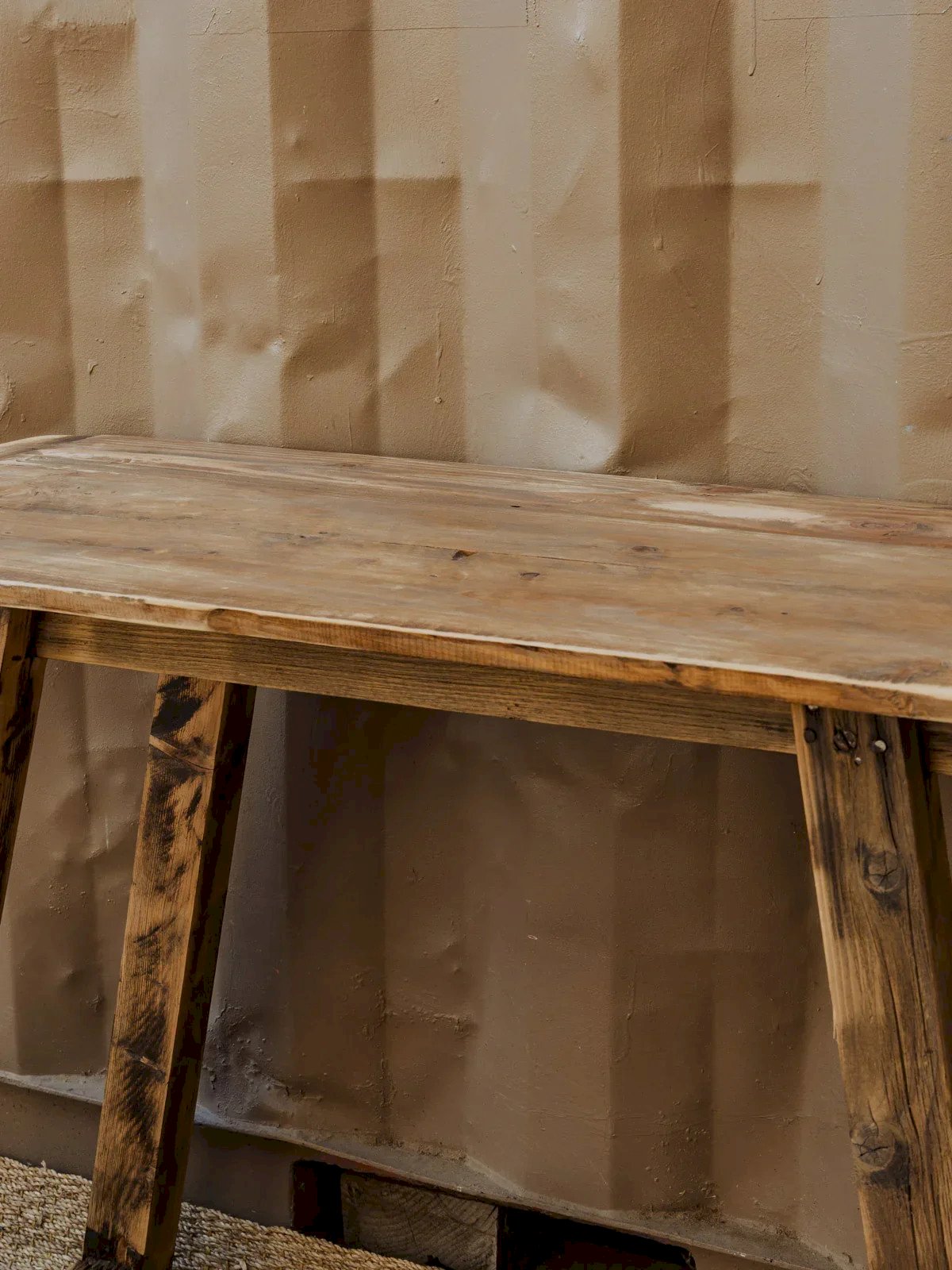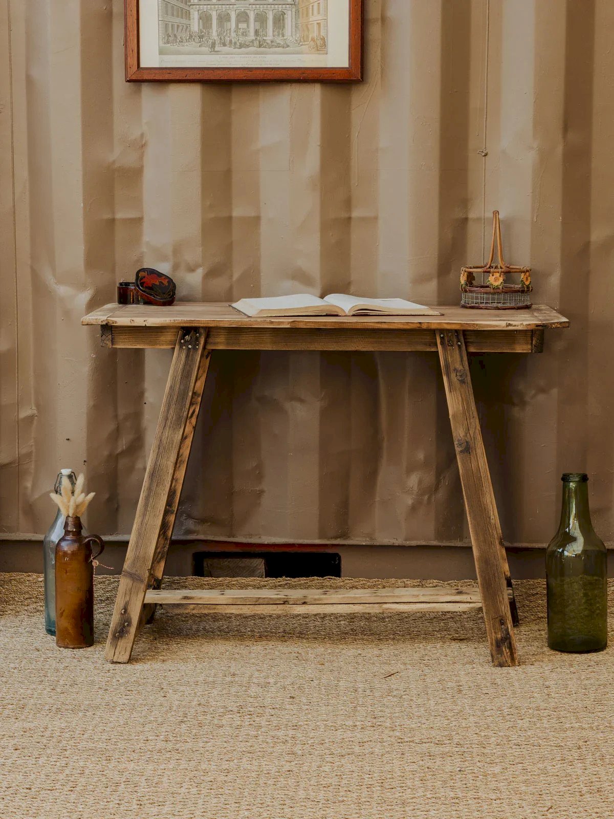 Adopt this established style side table, shaped from dark wood that exudes a warm and controlled presence. Its elongated top and slender profile provide ample space for a lamp, books, and decorative items while remaining compact for a hallway or a corner of the living room. Its patinated finish adds a discreet elegance and a cozy atmosphere, reminiscent of a workshop and a library. Light signs of wear present. Length: 103 cm Width: 44.5 cm Height: 75 cm Condition: Used: Item has been used. Item shows some marks of superficial wear, fully operational and functioning correctly. It may be a demonstration model or an item returned to the store after a short period of use. Possible imperfections. Brand: Debongout Type: Vintage product Material: Wood Style: Country Custom: Side tables.