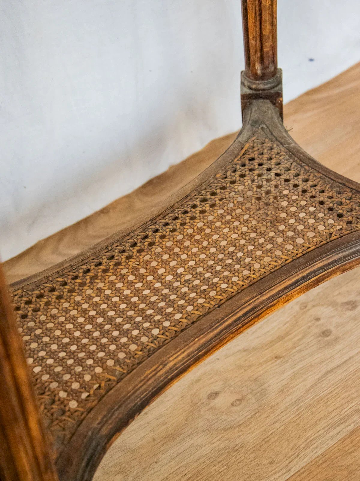 Bring a natural and refined touch with this oval walnut side table, featuring a low caned top. The warm wood and woven texture of the rattan combine for a sober and elegant look, perfect for complementing a living room or reading nook. Its thoughtfully proportioned silhouette provides a discreet support for a lamp, a plant, or a few books, placed near a sofa or a chaise longue. It instills a friendly and calming ambiance, ideal for an inspired interior. The traces of time give it a unique imprint. Length: 58 cm Width: 45 cm Height: 73 cm Niche height: 52 cm Condition: Used: Item has been used. Item shows some superficial wear marks, fully operational and functioning properly. It may be a demonstration model or an item returned to the store after a short period of use. Possible imperfections. Brand: Debongout Type: Vintage product Material: Wood, Walnut Style: Country Custom: Side tables