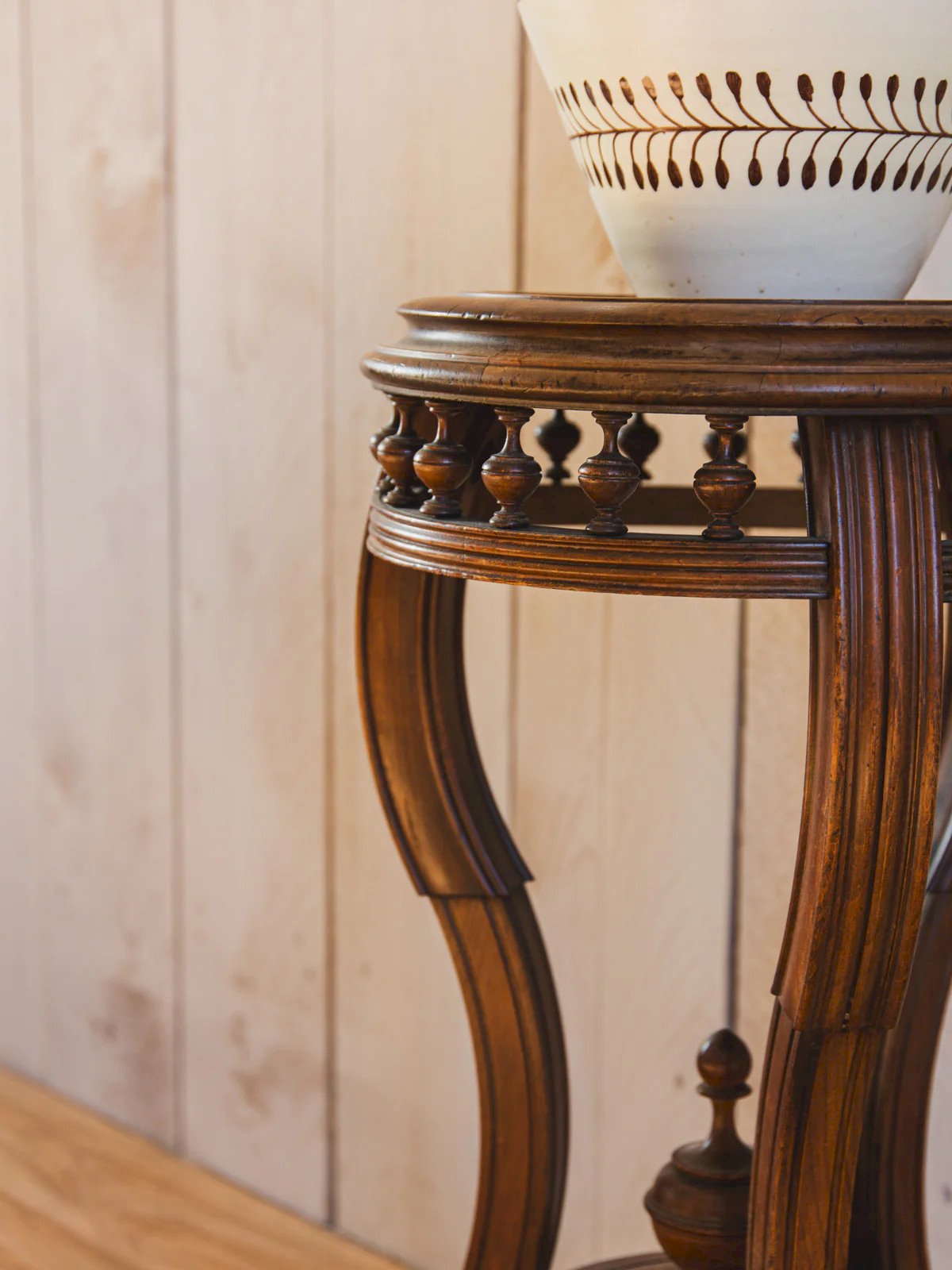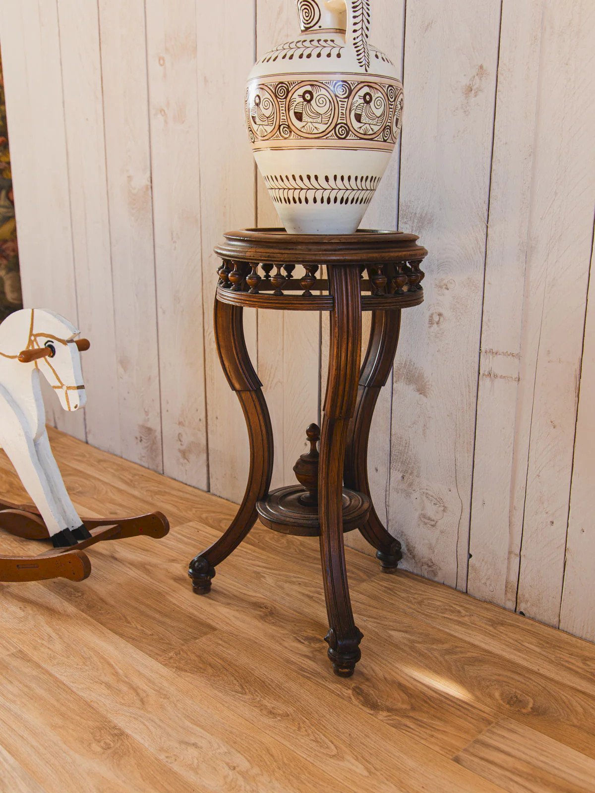 Discover this carved wooden pedestal, a piece with discreet charm that adds an artisanal and sculptural touch to your interior. Its slender silhouette and compact proportions make it ideal as a support for a lamp, a plant, or a piece of art, while the woodwork highlights a classic and warm style. The soft patina of the surface creates an intimate and welcoming atmosphere. There are slight traces of time, as well as a minor worm damage on one leg that has been treated. Height: 72 cm Diameter: 37 cm Height of the niche: 38.5 cm Condition: Used: An item that has been utilized. The item shows some superficial signs of wear, fully operational and functioning correctly. It may be a demonstration model or an item returned to the store after a short period of use. Any imperfections. Brand: Debongout Type: Thrifted product Material: Wood Style: Country Custom: Side tables