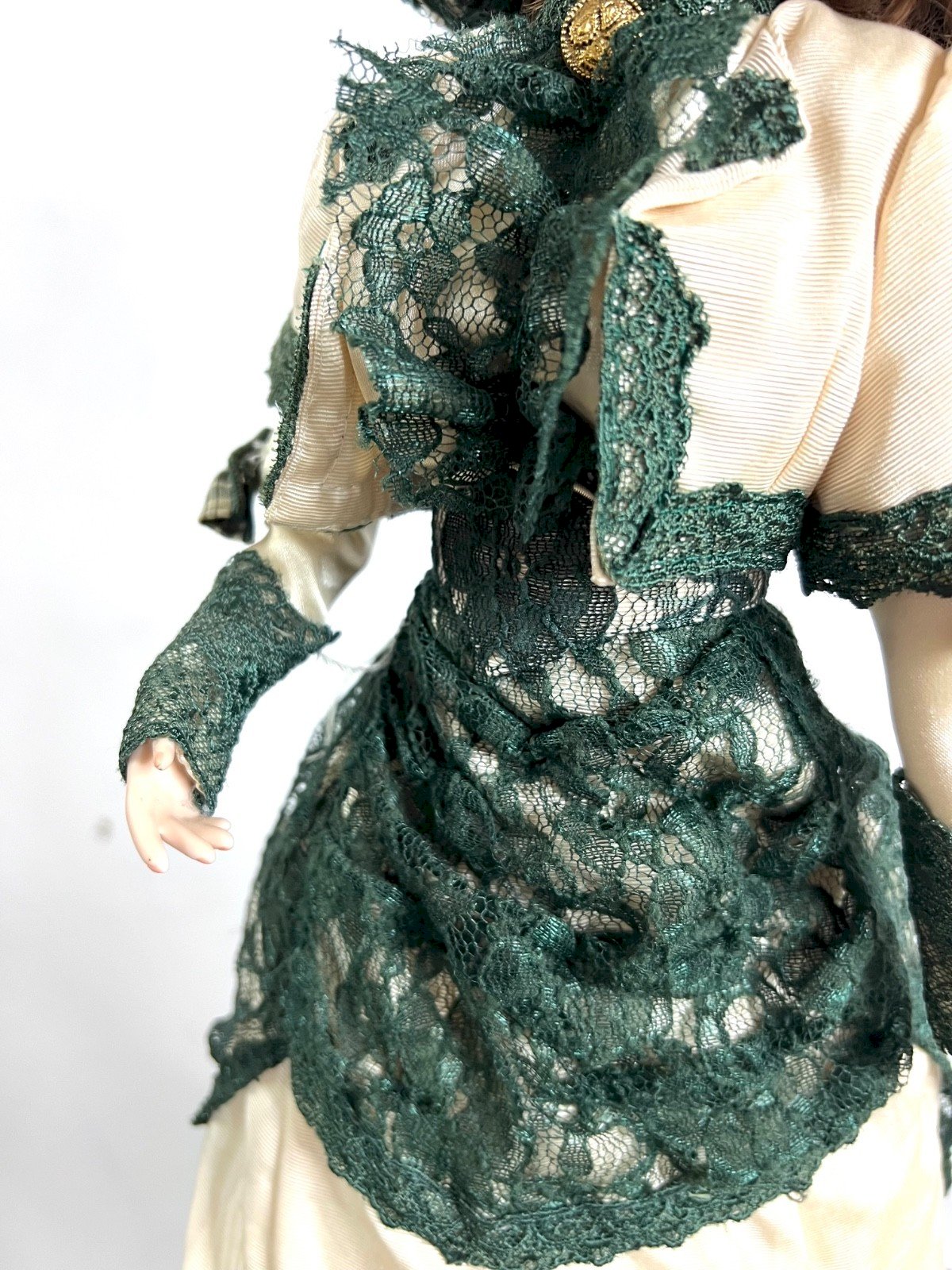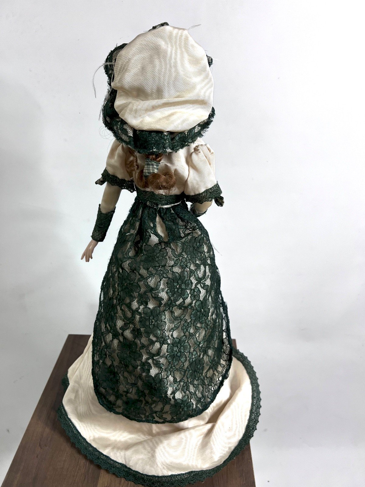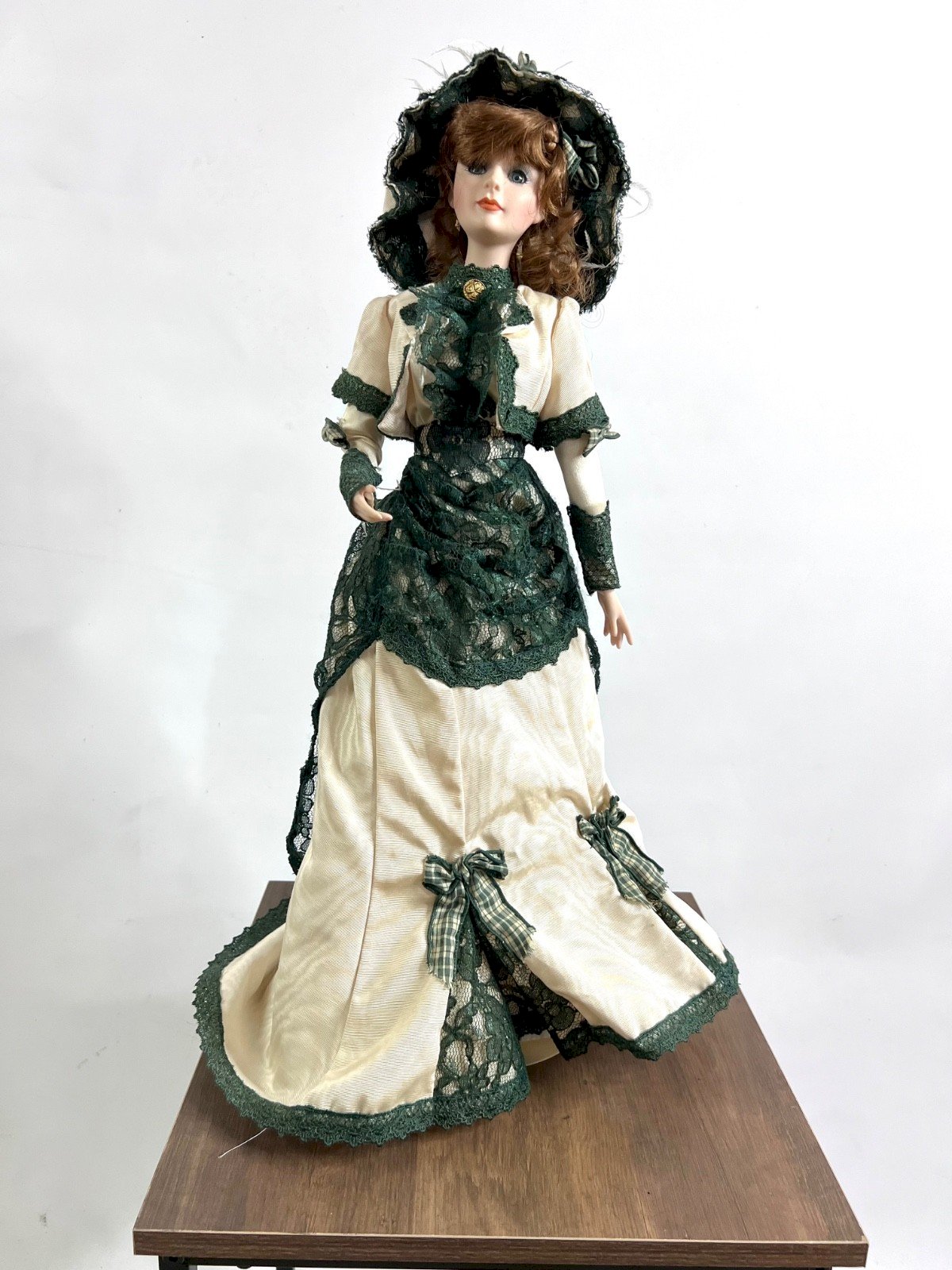 Laureen of County Londonderry By Ann Jackson – Franklin Heirloom Dolls Timeless elegance from the lands of Ireland. “Laureen of County Londonderry” embodies the grace of a young Irish woman from the 19th century. Created by the talented artist Ann Jackson and published by The Franklin Mint in the prestigious Franklin Heirloom Dolls collection, this doll enchants with the delicacy of her features and the richness of her traditional attire. Her ivory gown is enhanced by sumptuous deep green lace, matched with her wide-brimmed hat. The textile details are remarkable: layers of lace, checkered bows, delicate finishes. Hand-painted porcelain face, expressive gaze, curly auburn hair. A decorative piece full of character, ideal for: – prestigious doll collection – romantic or Victorian decor – curiosity cabinet – castle interior or ancient residence Features: Creator: Ann Jackson Publisher: The Franklin Mint Collection: Franklin Heirloom Dolls Model: Laureen of County Londonderry Head, hands, and feet in porcelain Fabric body Complete original outfit Height: approx. 45cm Condition: Very good overall condition. No visible breakage. Complete and fresh outfit. Condition: Used: Item has been used. Check the seller’s description for more details... Used: Item has been used. any potential imperfections. Brand: Franklin Mint Country of origin: United States