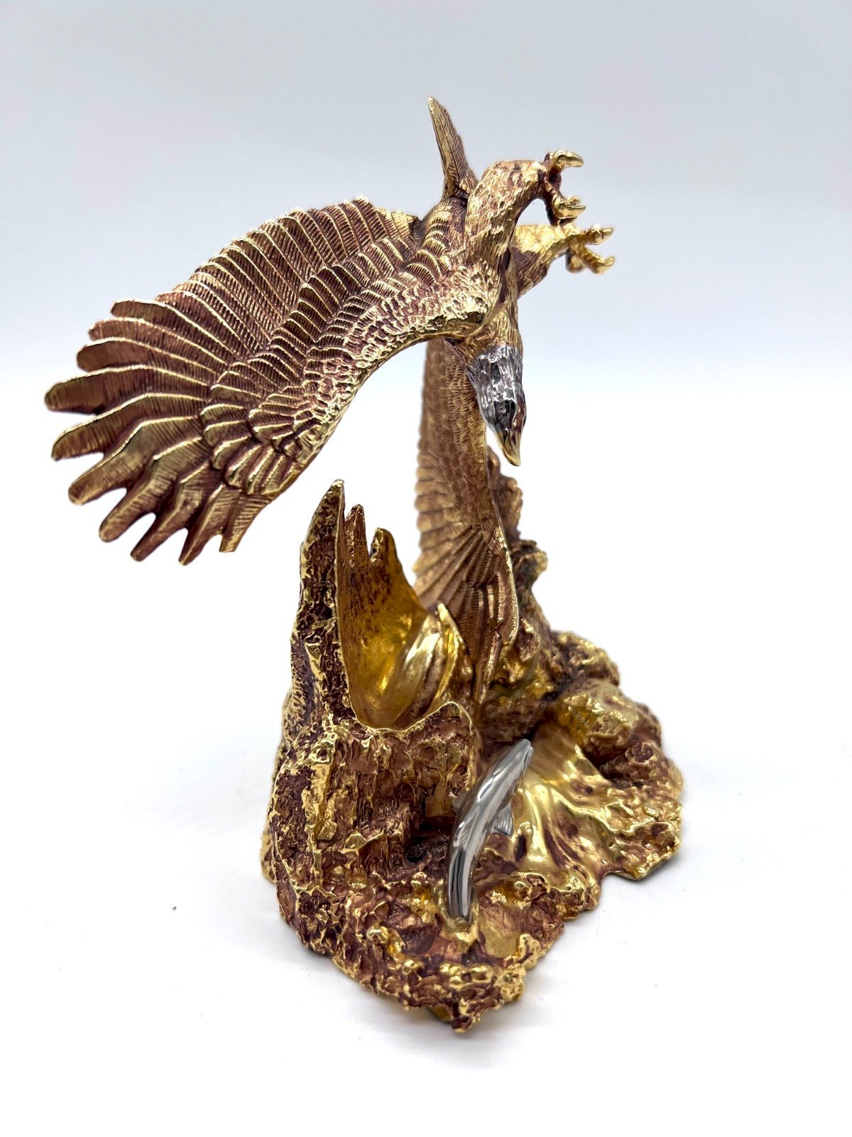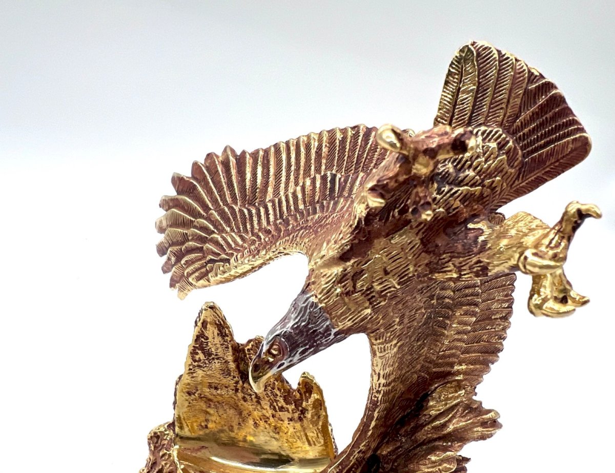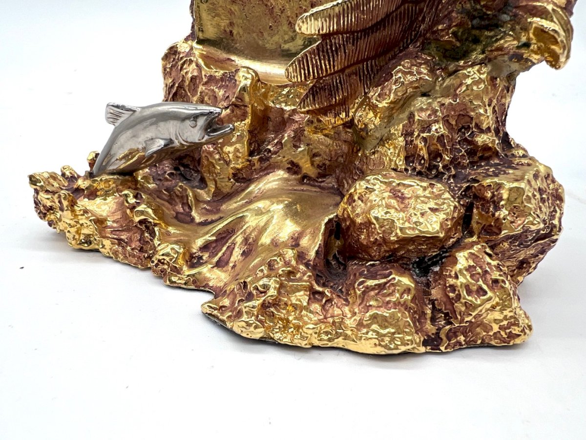 Superb collector's pocket watch issued by Franklin Mint – Collector Watches. Model: “The Alaska Chilkat Bald Eagle Preserve” This exceptional piece is presented on a spectacular sculptural base representing an eagle in flight above a rocky landscape, with a fish detail in the water. The central dial features a golden eagle on a green background (malachite effect), surrounded by intricate detailing. Inside the cover is engraved: “The Alaska Chilkat Bald Eagle Preserve” A visually striking decorative piece, ideal for: Franklin Mint collectors Nature / Alaska enthusiasts American eagle lovers High-end office decoration Elegant gift for men Features Brand: Franklin Mint Series: Collector Watches Movement: Quartz (to be checked / battery to be replaced if necessary) Silver-finished metal case Presented with its decorative eagle base Collector's edition Condition Very good overall condition. Several normal micro-wear marks. Functioning to be checked (possibly plan for battery replacement). Approximate dimensions Total height with base: about 18–20 cm Watch diameter: about 5 cm Condition: Used - Very good condition: This item has been lightly used, but its condition is acceptable. It may show some signs of wear, such as minor scratches or tarnishing. All imperfections should be shown and described in the seller's listing. Type: Pocket watch Brand: Franklin Mint Department: Adult unisex Country of origin: United States