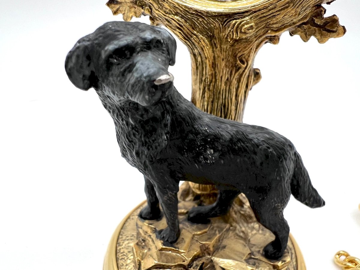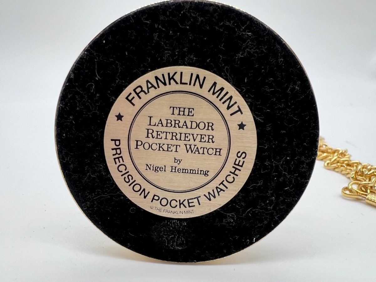 Superb collector's pocket watch published by Franklin Mint, titled "The Labrador Retriever Pocket Watch," based on a work by Nigel Hemming, famous for his animal representations. This refined piece is presented on its decorative base featuring a black Labrador at the foot of a tree, creating a very elegant sculptural ensemble. The dial showcases a finely illustrated portrait of a Labrador Retriever, surrounded by a guilloché pattern and framed with a precious wood effect. Ideal for: Franklin Mint collectors Labrador enthusiasts Unique and refined gift Office or display decoration Features Brand: Franklin Mint Model: The Labrador Retriever Pocket Watch Artist: Nigel Hemming Movement: Quartz (to be checked / battery may need to be replaced) Gold-finished case Gold chain included Decorative base included (relief Labrador) Condition: Very good general condition. Note: slight normal wear and tear. Functionality to be tested / battery possibly to be replaced (to be specified according to your verification). Approximate dimensions Total height with base: about 15 cm (5.9 inches) Watch diameter: about 5 cm (1.97 inches) Condition: Used - Very good condition: This item has been lightly used, but its condition is good. It may show some signs of wear, such as light scratches or tarnishing. All imperfections must be shown and described in the seller's listing. Type: Pocket watch Brand: Franklin Mint Department: Unisex adult