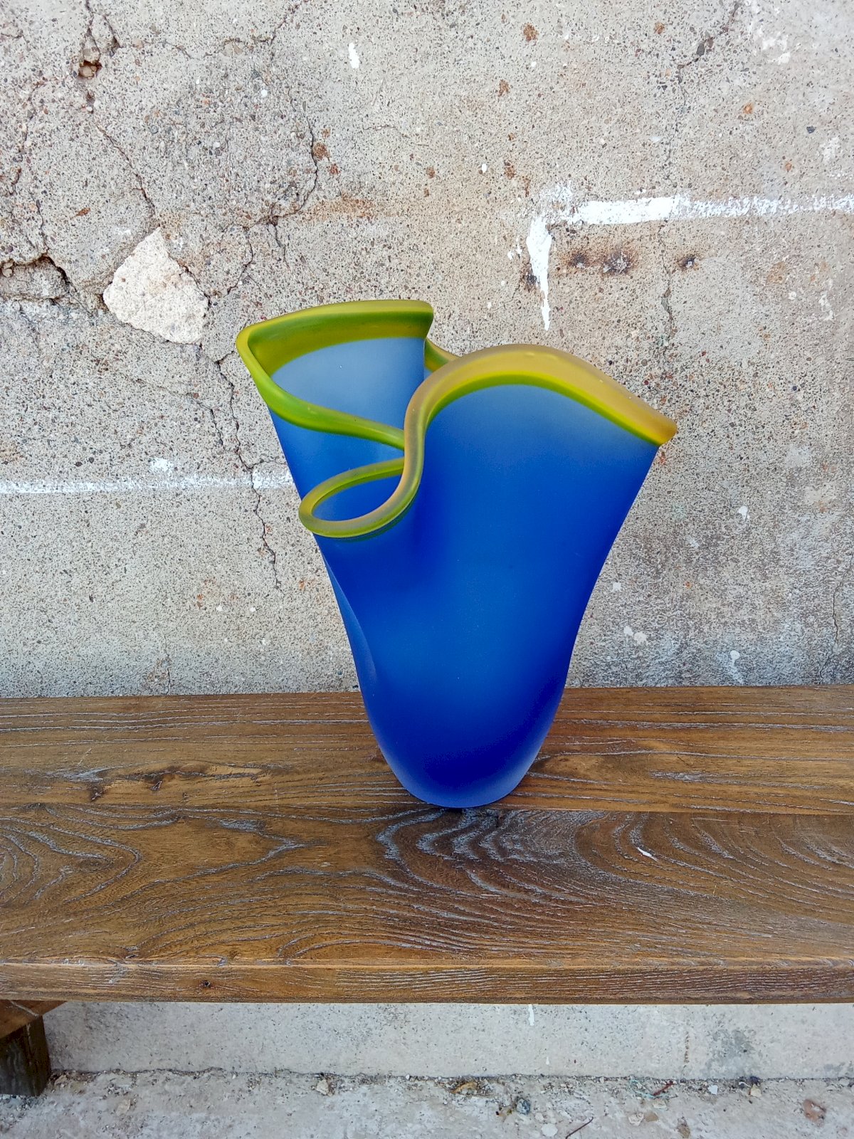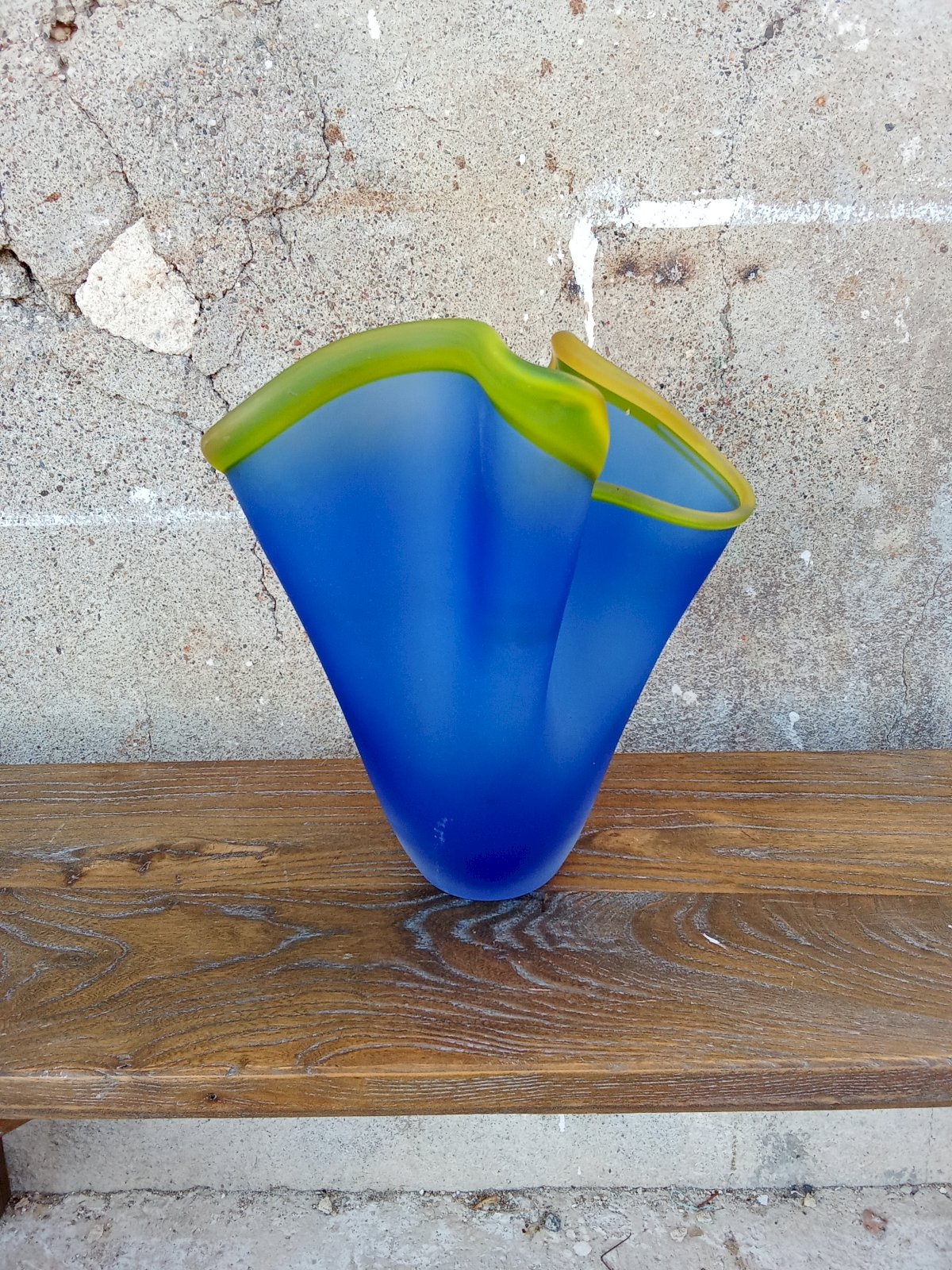 Art Deco vase, tricolor yellow, white and blue glass, aroma opening, ball base