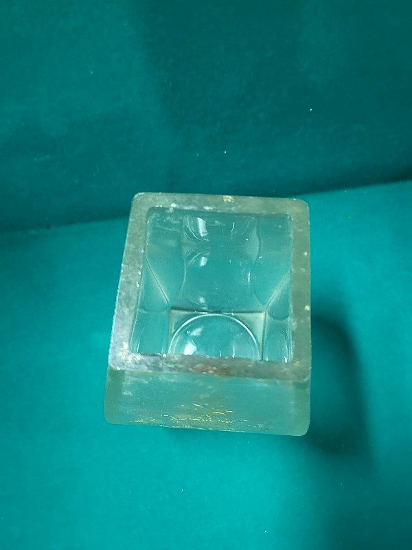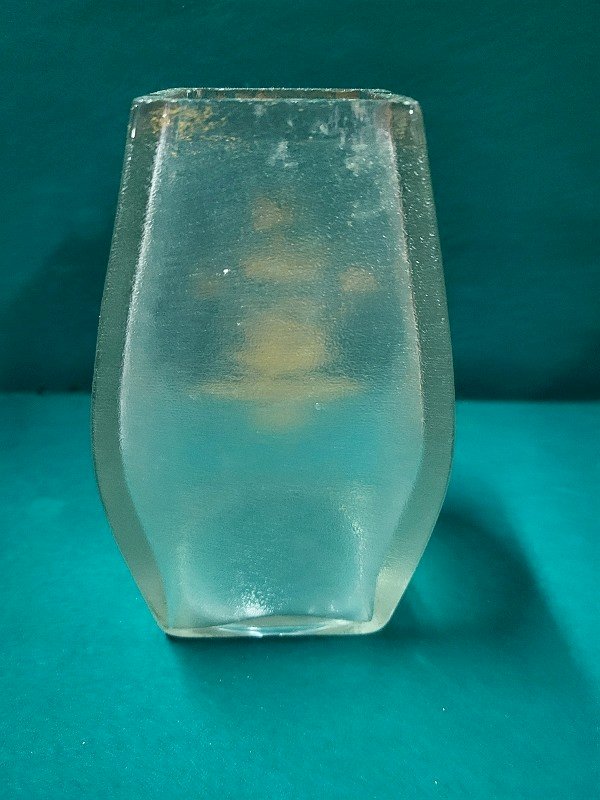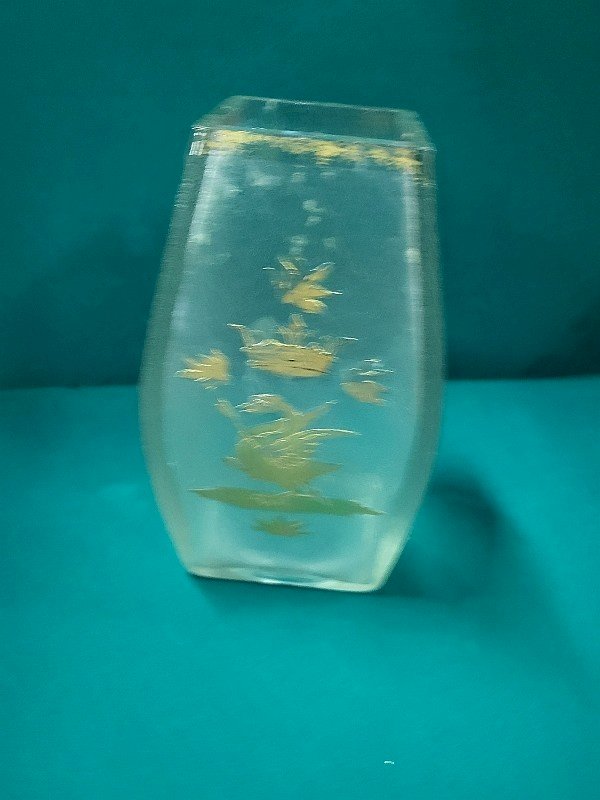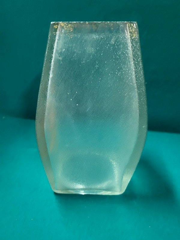 Pretty frosted crystal vase decorated with a golden crowned swan. It is in good condition with a few small chips on the edge of the vase and one on the bottom (see photo). It measures 17 cm high, 7 cm wide, and 7 cm deep.