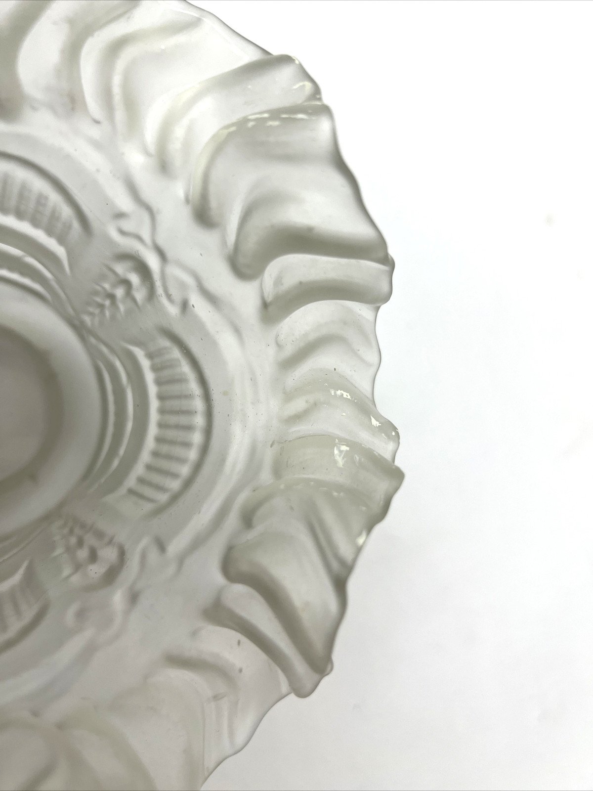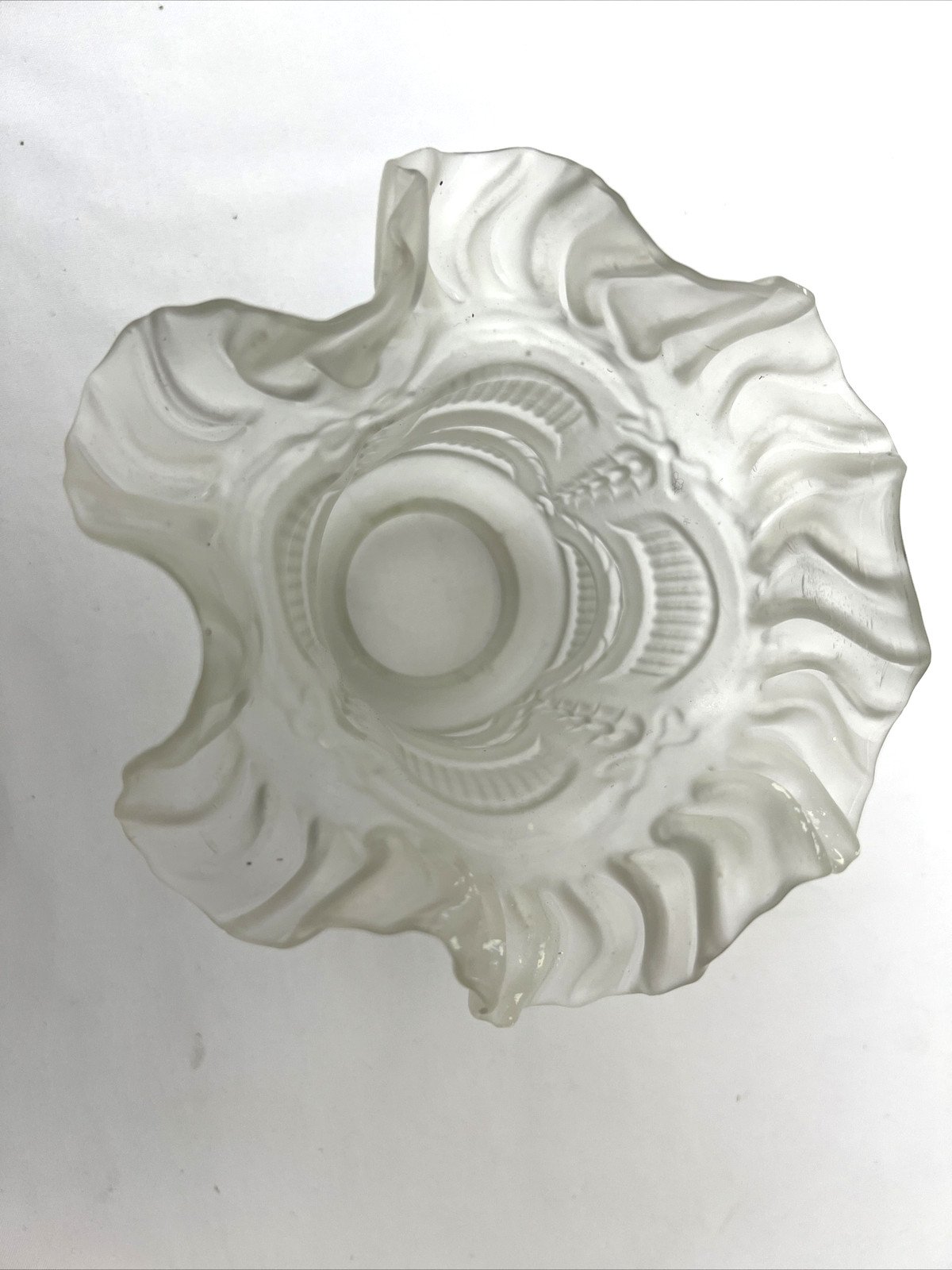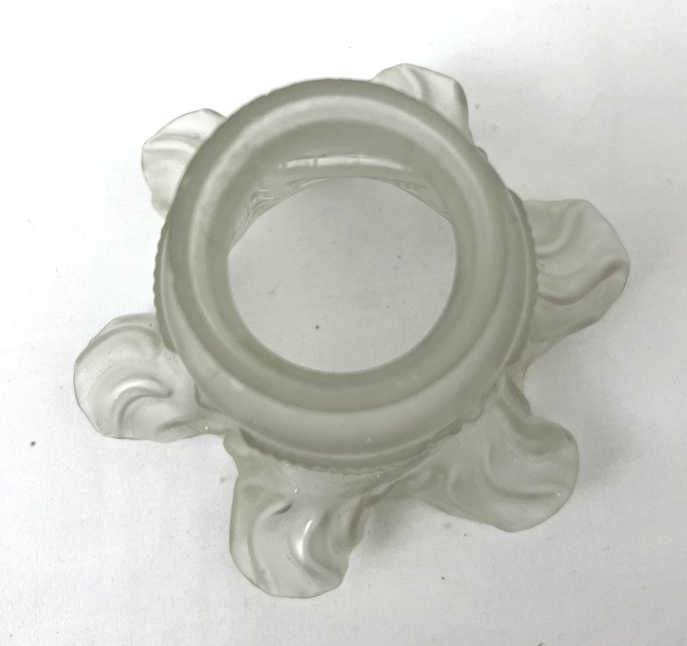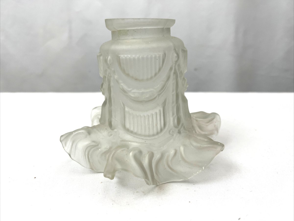 Old frosted glass tulip – garland decor – for Art Deco luminaria Charming antique tulip in frosted glass, molded with garland and scalloped designs. Its elegant style, inspired by Art Deco productions, makes it an ideal lampshade for a lamp, wall sconce, or pendant. The frosted glass diffuses a soft and warm light. Dimensions Diameter of high opening: 5.5 cm Diameter at bottom (with waves): 10.5 to 14.5 cm Height: 12.8 cm Condition Overall good condition. Small trace of white paint (see photo). Shipping Careful and secure shipping. Type: Tulip / Lampshade Period: 20th-century design Country of origin: France Subtype: Lampshade / Tulip Dominant color: Transparent / Frosted Material: Glass Style: Art Deco