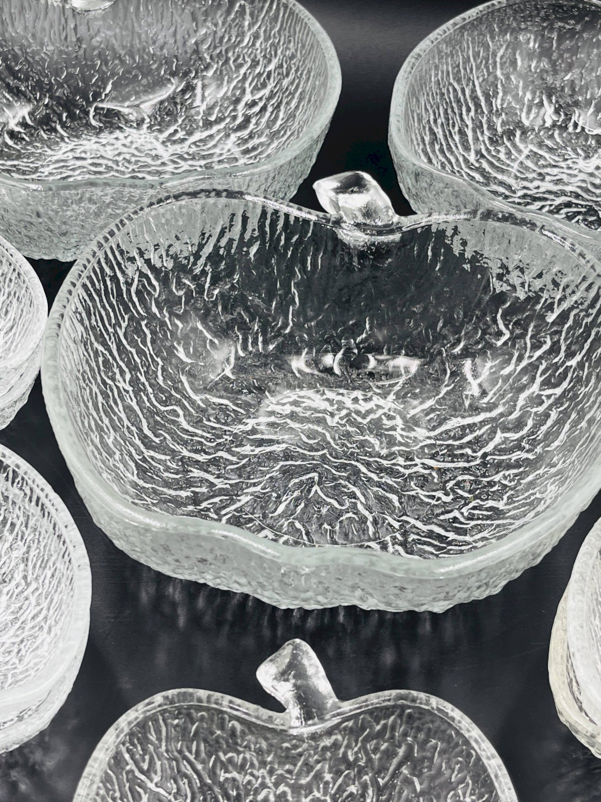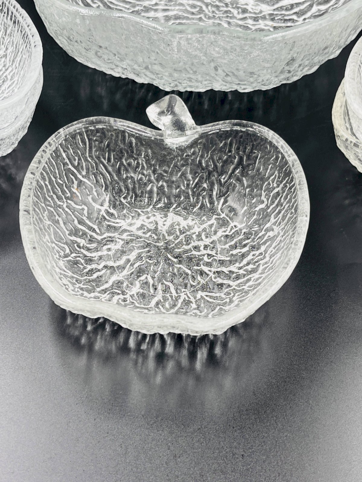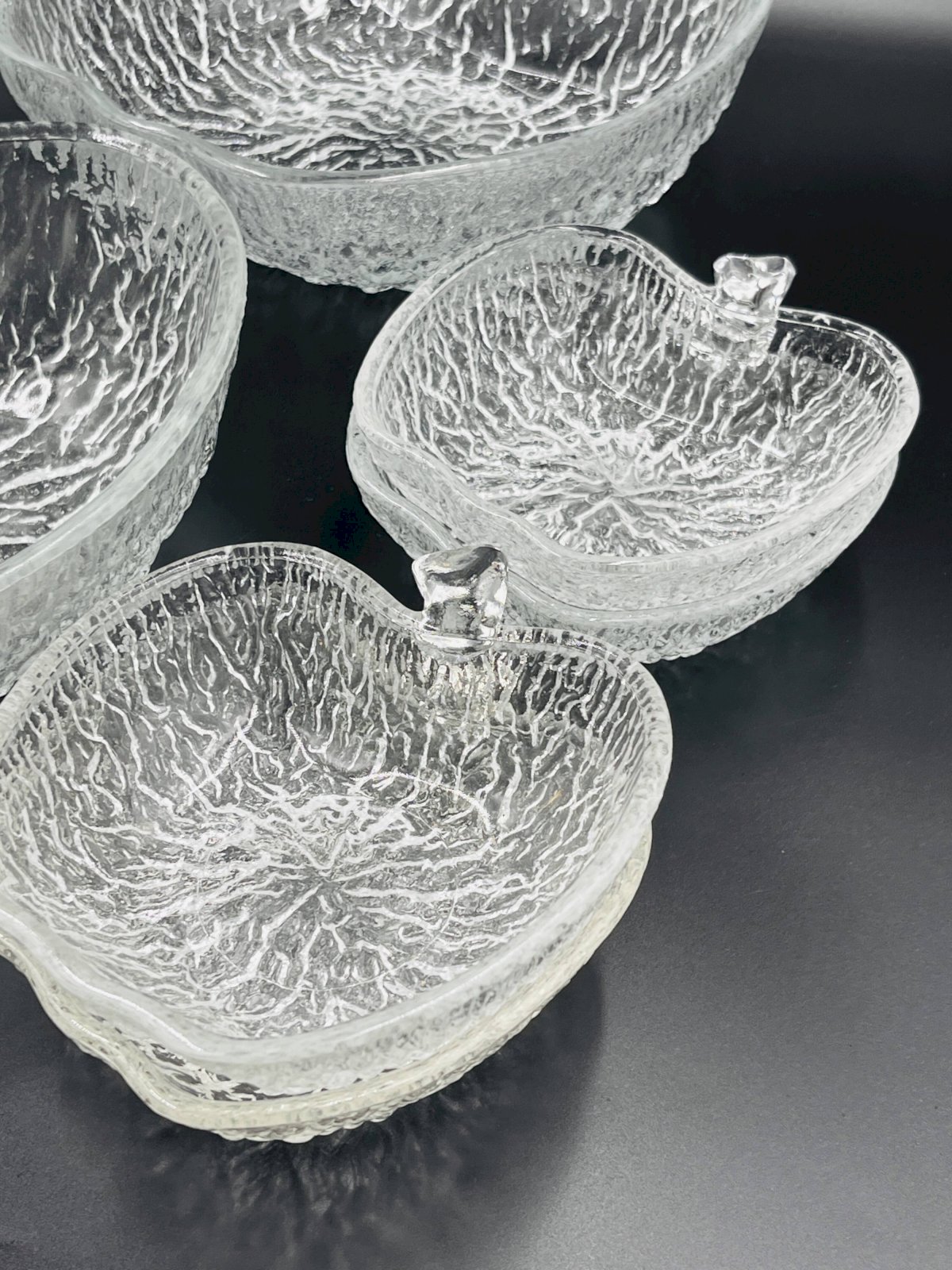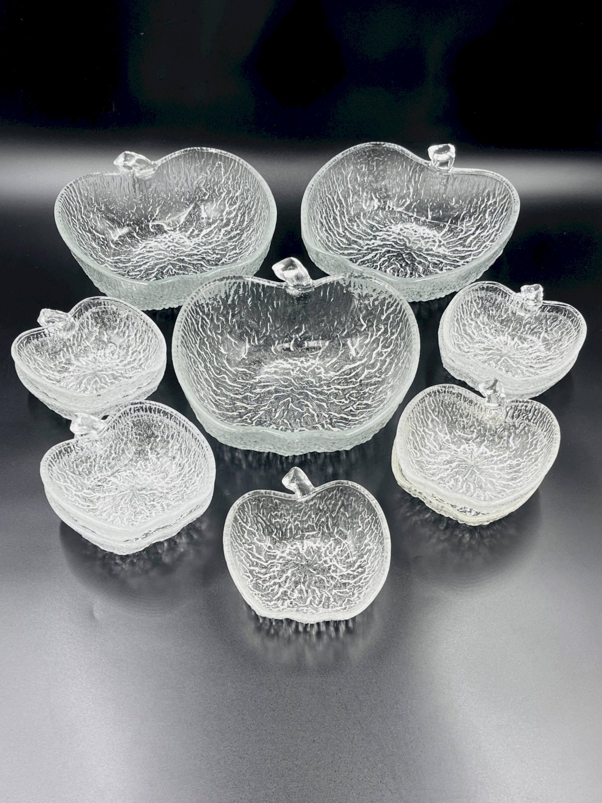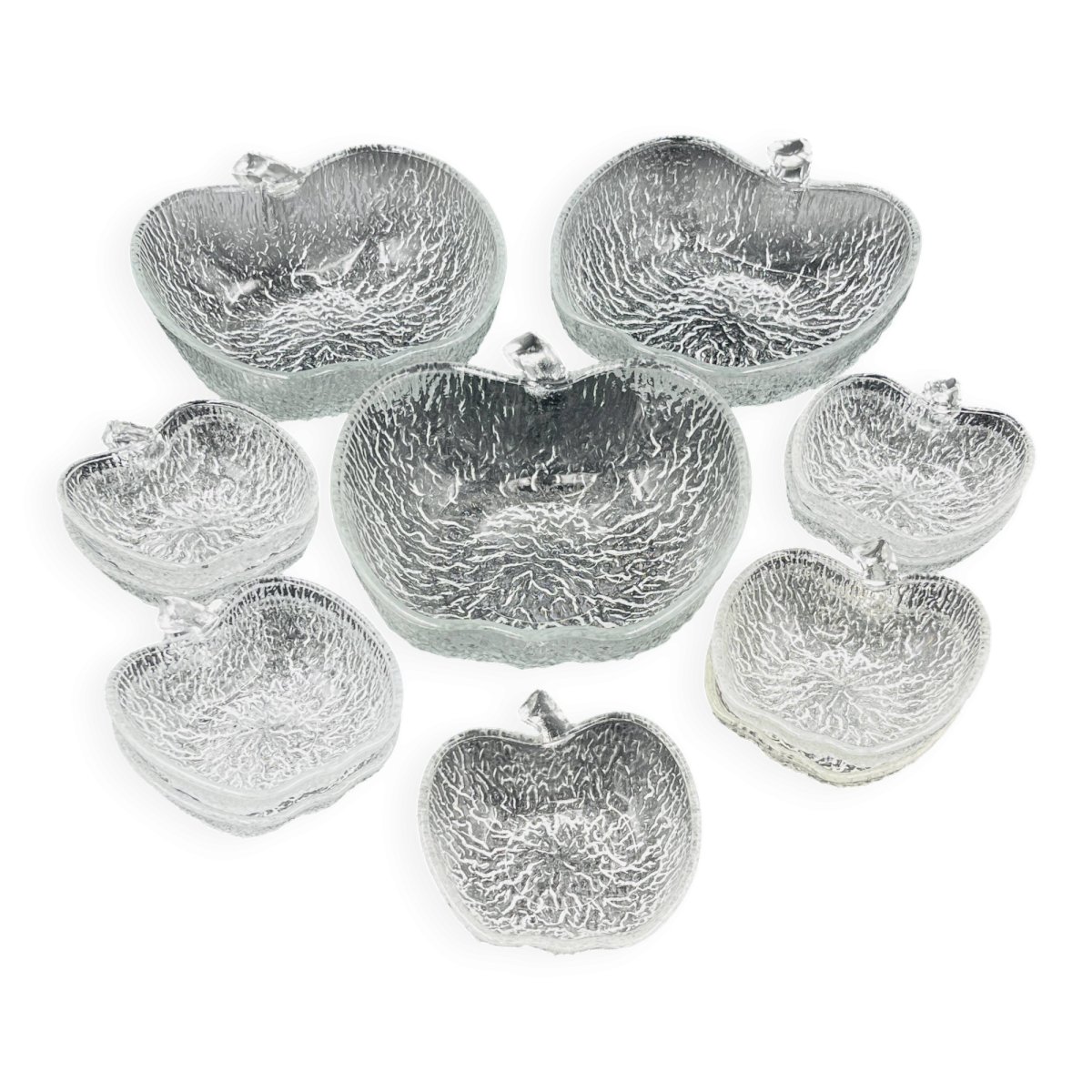 Made of high-quality glass, each piece features a unique textured surface that beautifully captures and reflects light, adding a touch of sophistication to all your meals. This service includes 8 bowls and 3 plates, each shaped like an apple, offering a charming and thematic presentation for your fruit salads. Made from durable glass, these bowls are not only aesthetically pleasing but also practical for everyday use as well as for special occasions. Their clear design allows the vibrant colors of your fruit salads to shine through, enhancing the visual appeal of your table. Elevate your dining experience with this elegant and functional fruit salad service, perfect for those who appreciate refined details. In very good condition. Dimensions: plates: 21 X 23 X H 8 cm. Bowls: 13 X 14 X H 4 cm. L: 21 l: 22 H: 8