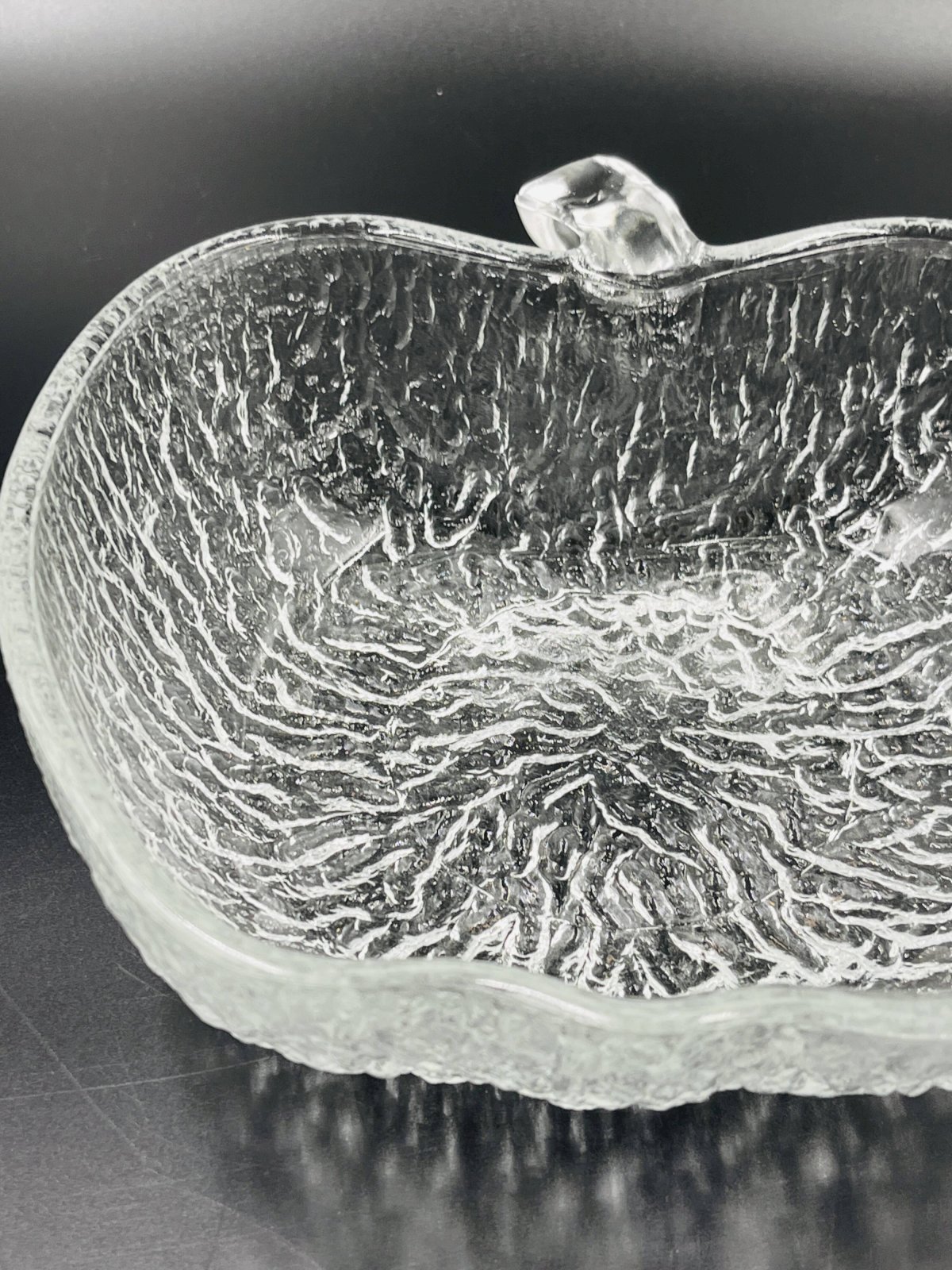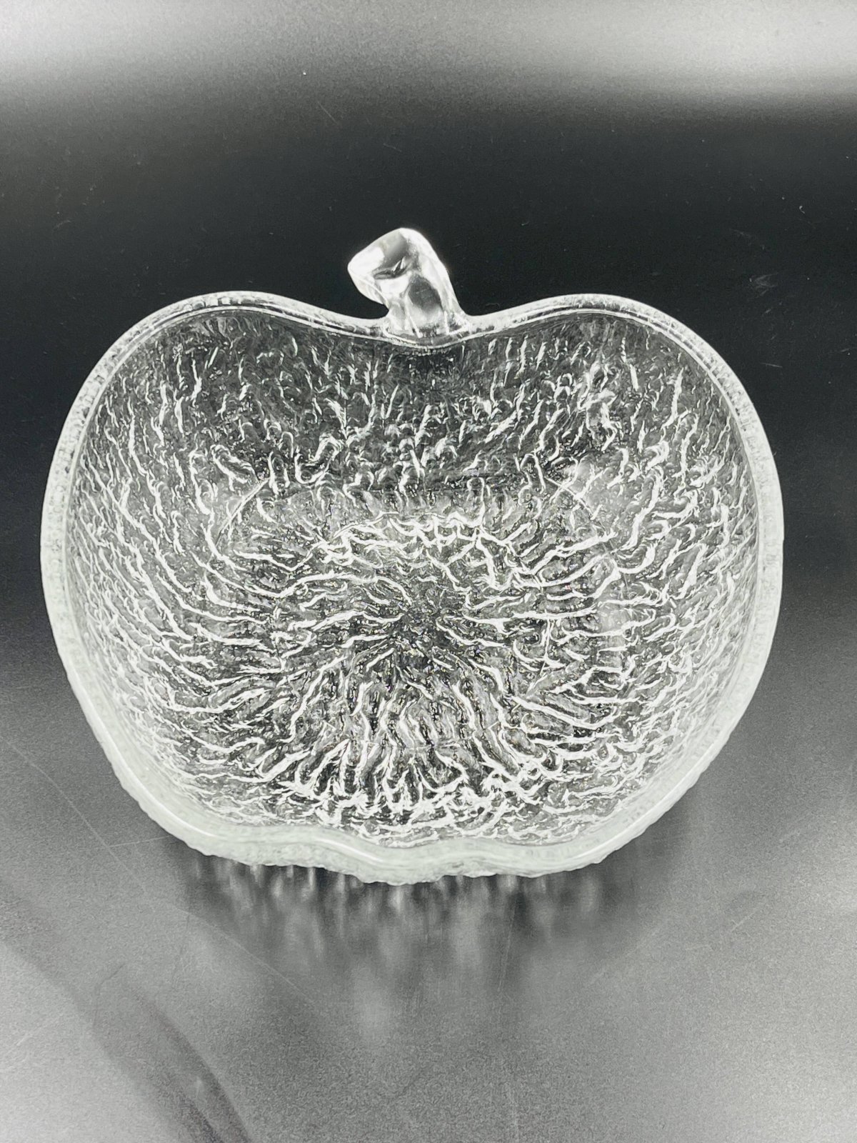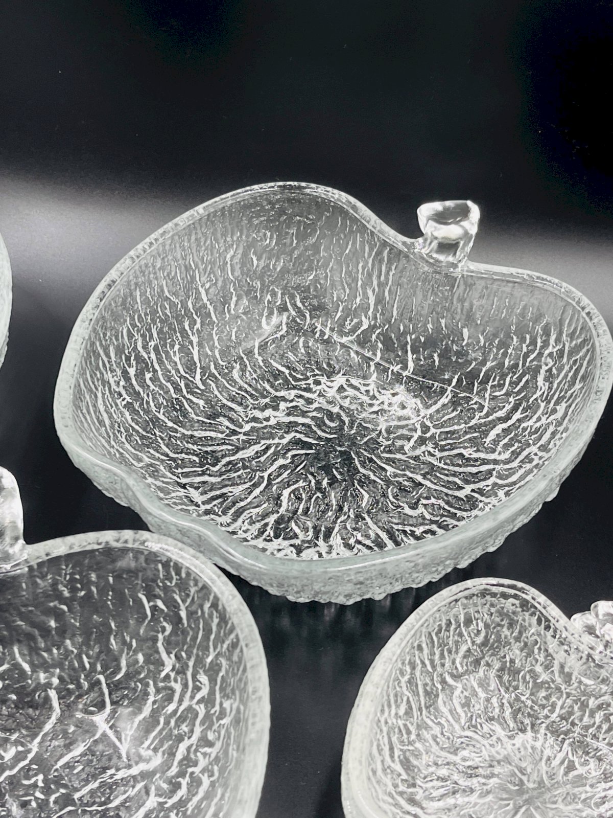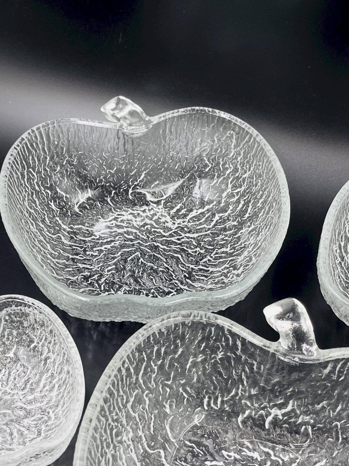 Made of high-quality glass, each piece features a unique textured surface that beautifully captures and reflects light, adding a touch of sophistication to all your meals. This service includes 8 bowls and 3 plates, each shaped like an apple, offering a charming and thematic presentation for your fruit salads. Made from durable glass, these bowls are not only aesthetically pleasing but also practical for everyday use as well as for special occasions. Their clear design allows the vibrant colors of your fruit salads to shine through, enhancing the visual appeal of your table. Elevate your dining experience with this elegant and functional fruit salad service, perfect for those who appreciate refined details. In very good condition. Dimensions: plates: 21 X 23 X H 8 cm. Bowls: 13 X 14 X H 4 cm. L: 21 l: 22 H: 8